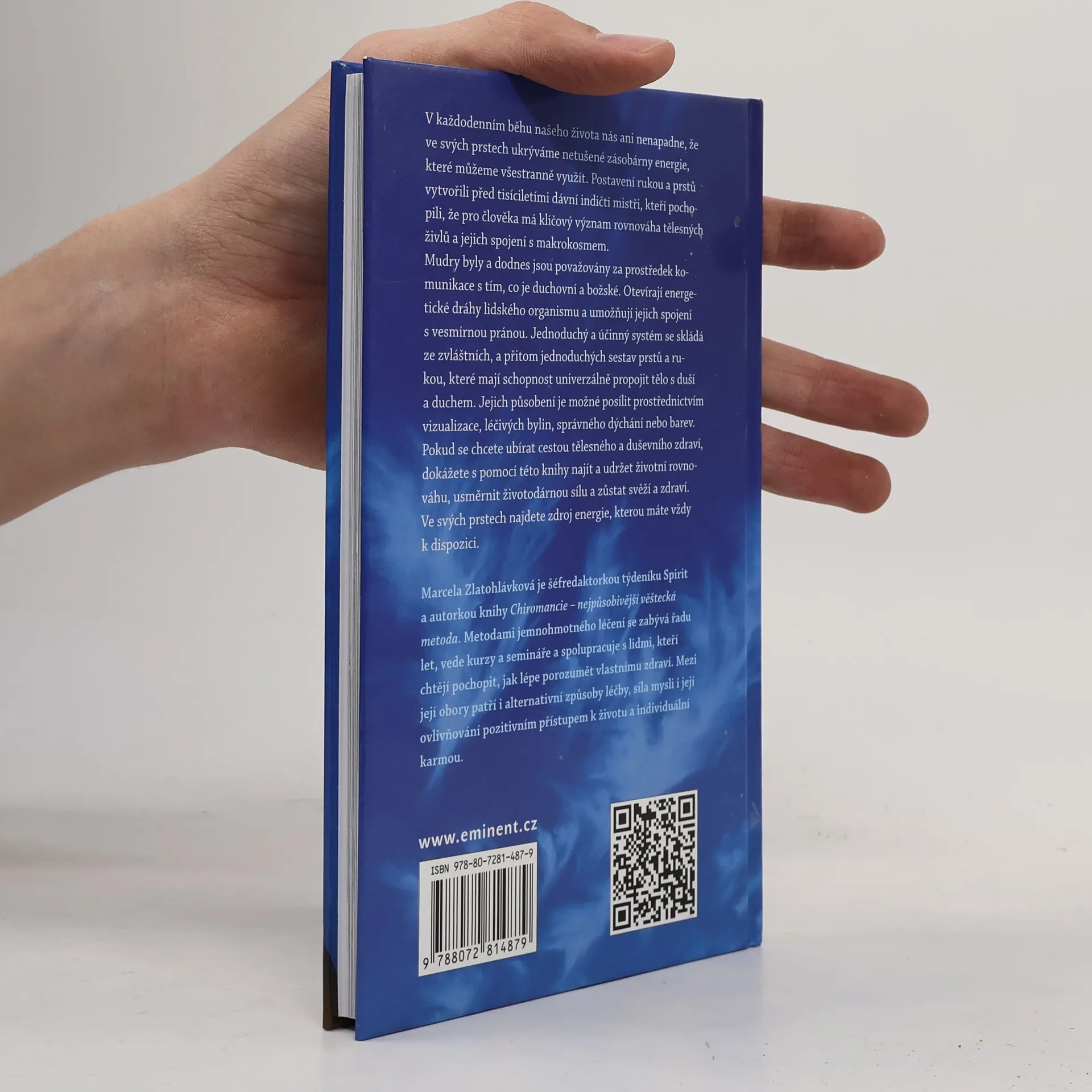 V každodenním životě často zapomínáme, že v našich prstech se skrývá nevyčerpatelný zdroj energie. Postavení rukou a prstů, které vytvořili indičtí Mistři, ukazuje na klíčovou roli rovnováhy tělesných živlů a jejich spojení s makrokosmem. Mudry, jakožto prostředek komunikace s duchovním a božským, otevírají energetické dráhy v lidském organismu a spojují je s vesmírnou pranou. Tento jednoduchý a účinný systém zahrnuje specifické sestavy prstů a rukou, které propojují tělo s duší a duchem. Jejich účinek lze posílit vizualizací, léčivými bylinami, správným dýcháním nebo barvami. Pokud usilujete o tělesné a duševní zdraví, tato kniha vám pomůže najít a udržet životní rovnováhu, usměrnit životadárnou sílu a zůstat svěží a zdraví. V prstech objevíte zdroj neustálé energie. Marcela Zlatohlávková, šéfredaktorka týdeníku Spirit a autorka knihy o chiromancii, se léčením a alternativními metodami zabývá řadu let. Vede kurzy a semináře a spolupracuje s lidmi, kteří chtějí lépe porozumět svému zdraví, přičemž se zaměřuje na sílu mysli a pozitivní přístup k životu.