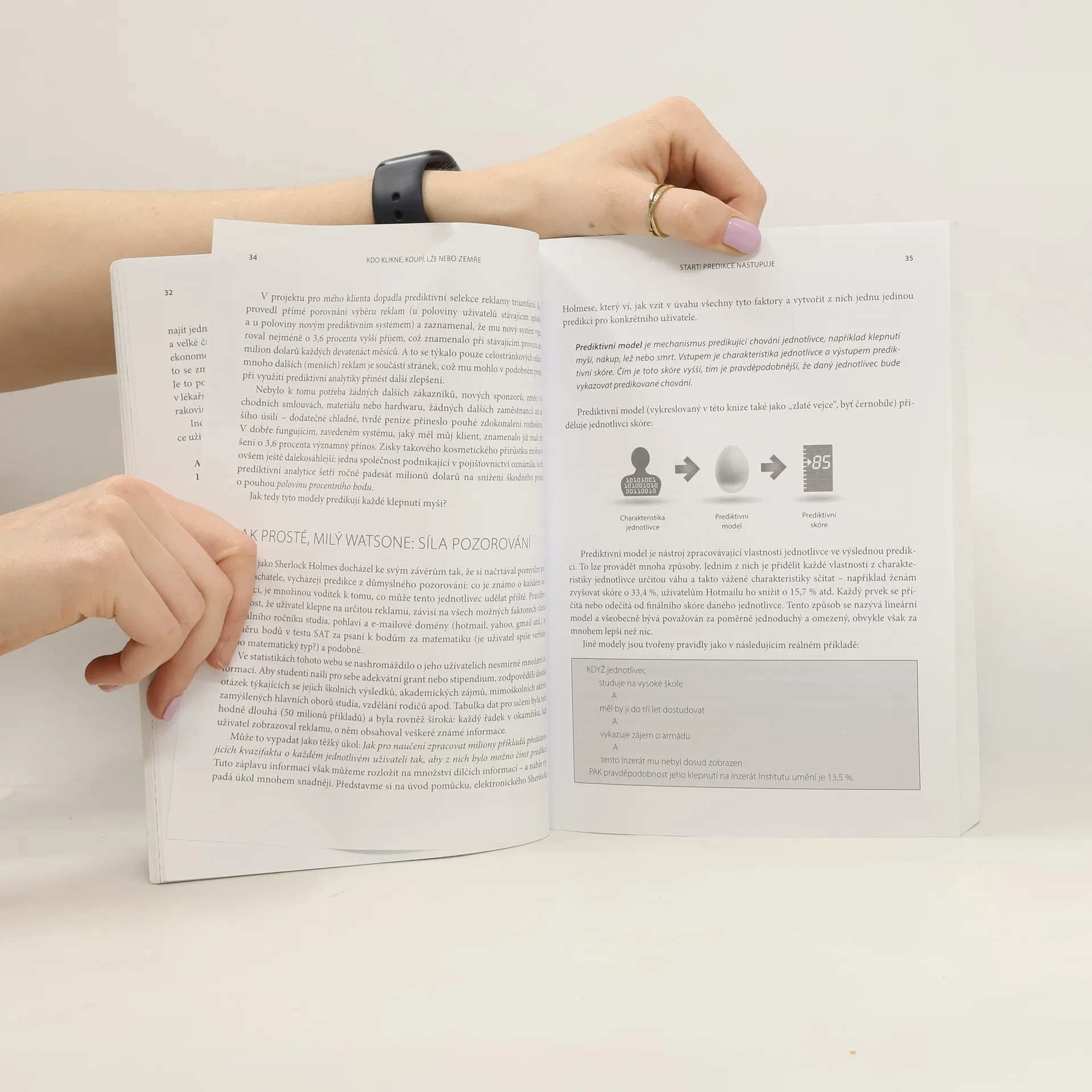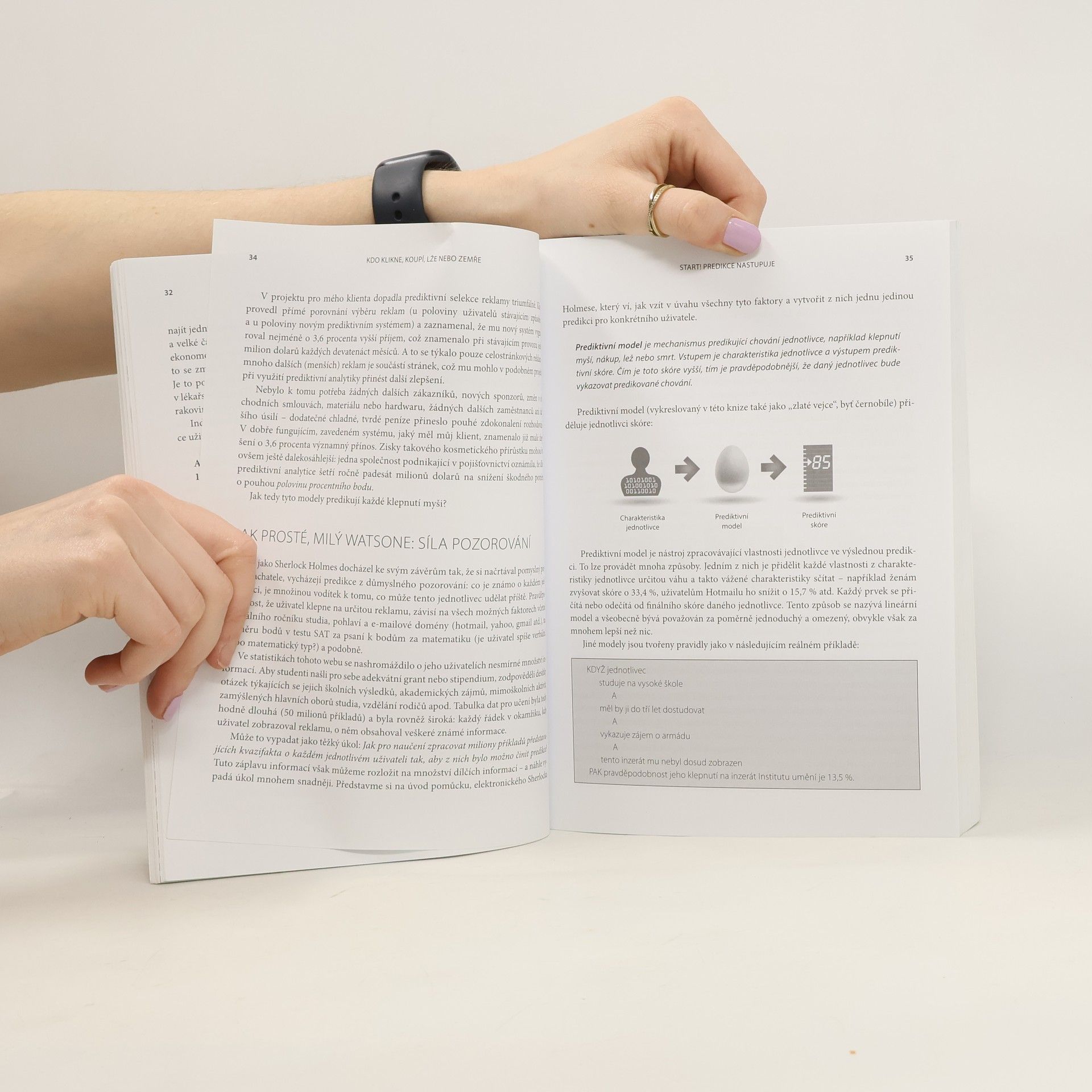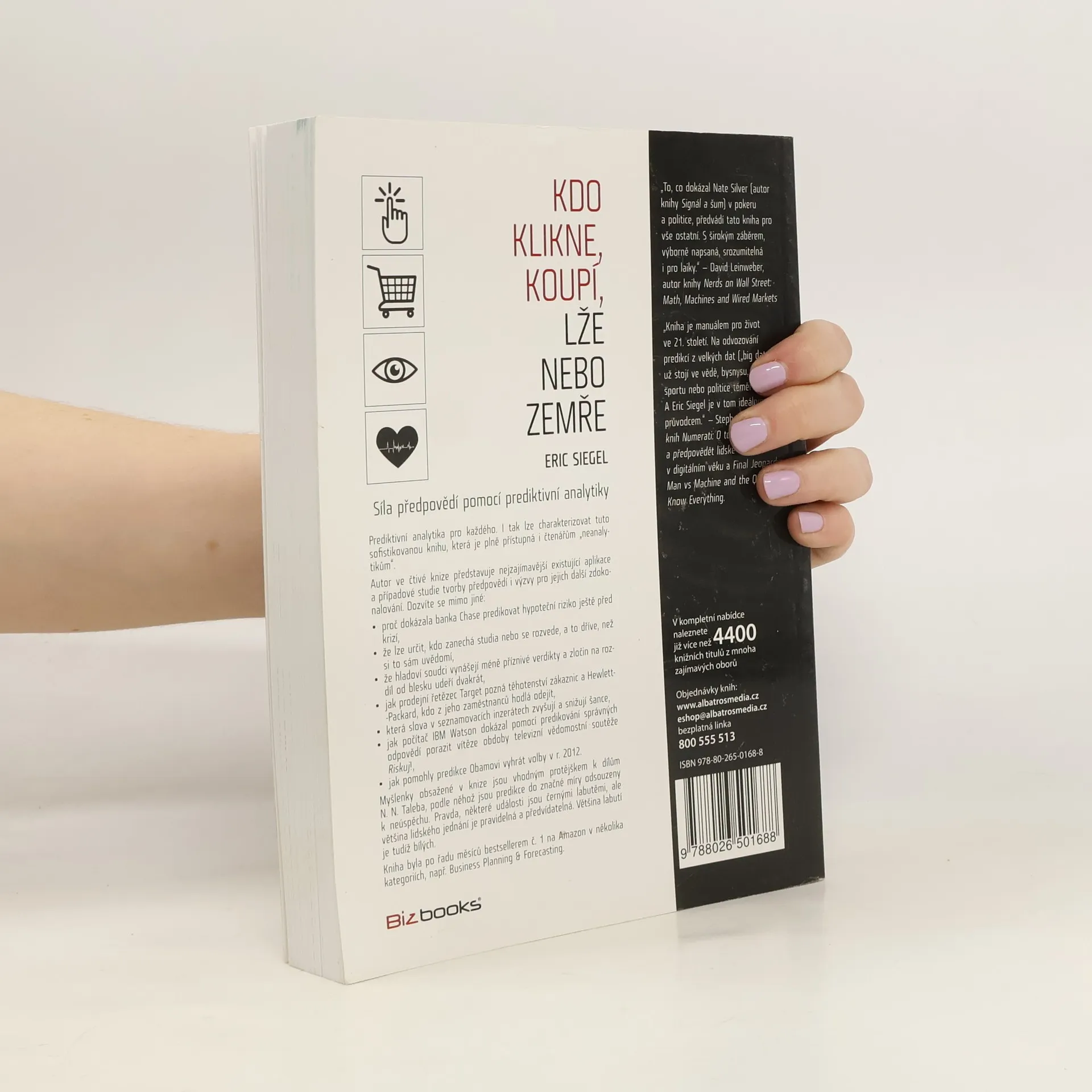 Tato sofistikovaná kniha je přístupná i čtenářům-„neanalytikům“ a ukazuje, jak lze pomocí počítačů predikovat chování jednotlivců, jako jsou zákazníci, pacienti či voliči. Firmy modelují, kdo pravděpodobně klikne na reklamu, provede nákup nebo podvádí, což je klíčové v oblastech jako marketing, finance, zdravotní péče a boj s kriminalitou. Autor představuje fascinující aplikace a případové studie predikcí a výzev pro jejich zlepšení. Dozvíte se, jak banka Chase předpověděla hypoteční riziko před krizí, jak lze určit, kdo zanechá studia nebo se rozvede, a proč hladoví soudci vynášejí méně příznivé verdikty. Také se dozvíte, jak prodejní řetězec Target rozpozná těhotenství zákaznic a jak IBM Watson porazil vítěze televizní soutěže pomocí predikcí. Kniha je vhodným protějškem k myšlenkám N. N. Taleba, který tvrdí, že predikce jsou často odsouzeny k neúspěchu. Autor ukazuje, že většina lidského jednání je pravidelná a předvídatelná. Dále je kniha považována za manuál pro život ve 21. století, kde jsou predikce z velkých dat klíčové ve vědě, byznysu, financích a politice. Byla bestsellerem na Amazonu v několika kategoriích.