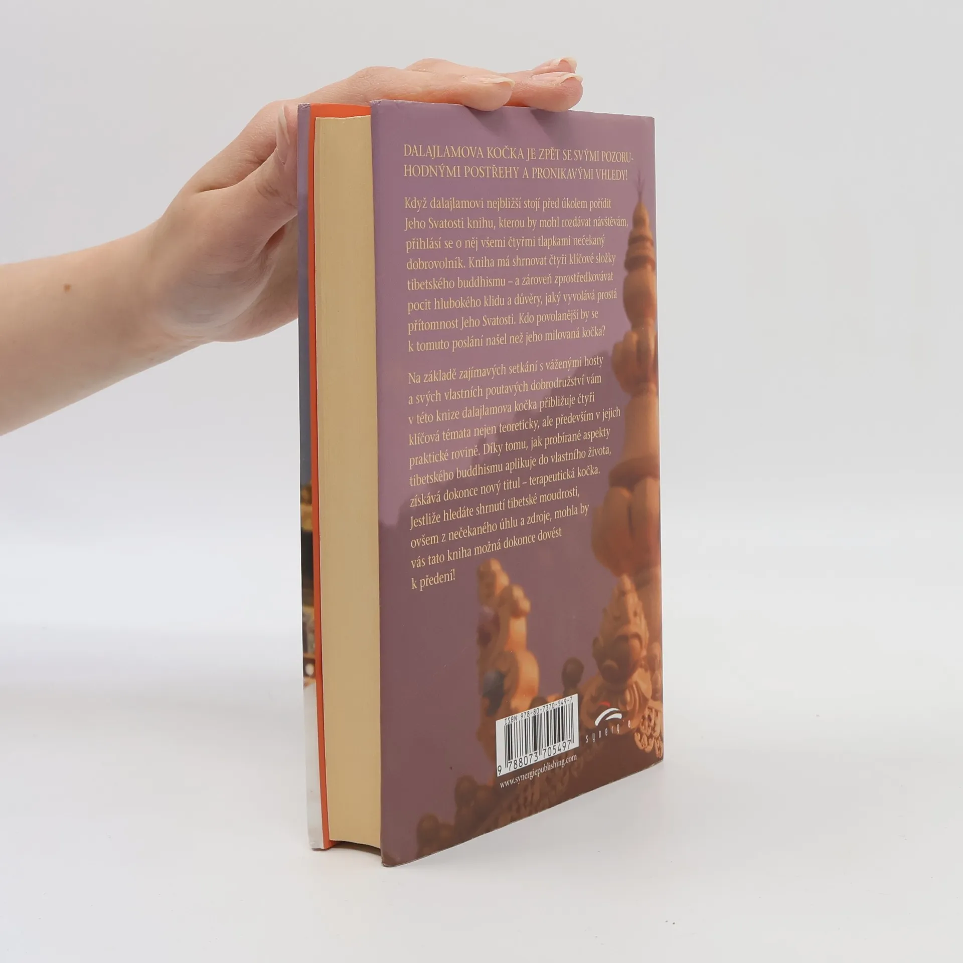 Dalajlamova kočka je zpět se svými pozoruhodnými postřehy a pronikavými vhledy! Když dalajlamovi nejbližší stojí před úkolem pořídit Jeho Svatosti knihu, kterou by mohl rozdávat návštěvám, přihlásí se o něj všemi čtyřmi tlapkami nečekaný dobrovolník. Kniha má shrnovat čtyři klíčové složky tibetského buddhismu – a zároveň zprostředkovávat pocit hlubokého klidu a důvěry, jaký vyvolává prostá přítomnost Jeho Svatosti. Kdo povolanější by se k tomuto poslání našel než jeho milovaná kočka? Na základě zajímavých setkání s váženými hosty a svých vlastních poutavých dobrodružství vám v této knize dalajlamova kočka přibližuje čtyři klíčová témata nejen teoreticky, ale především v jejich praktické rovině. Díky tomu, jak probírané aspekty tibetského buddhismu aplikuje do vlastního života, získává dokonce nový titul – terapeutická kočka. Jestliže hledáte shrnutí tibetské moudrosti, ovšem z nečekaného úhlu a zdroje, mohla by vás tato kniha možná dokonce dovést k předení!