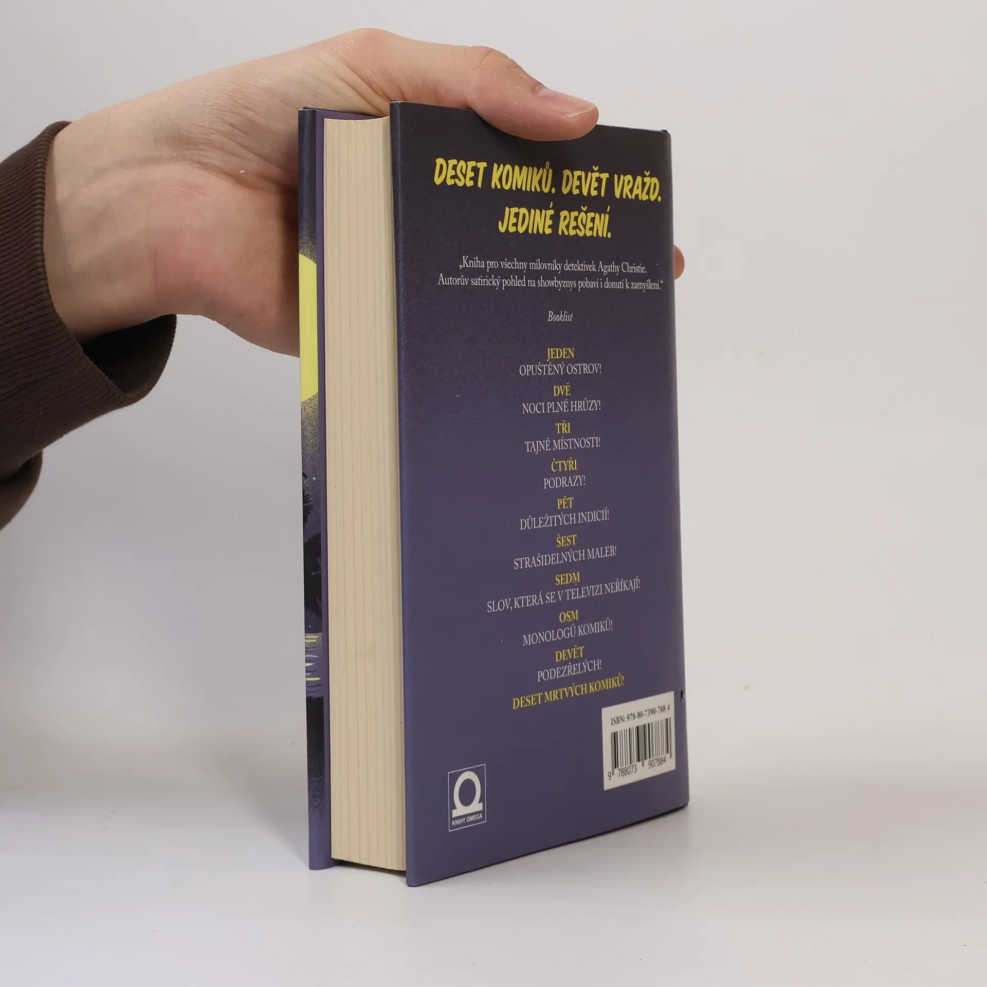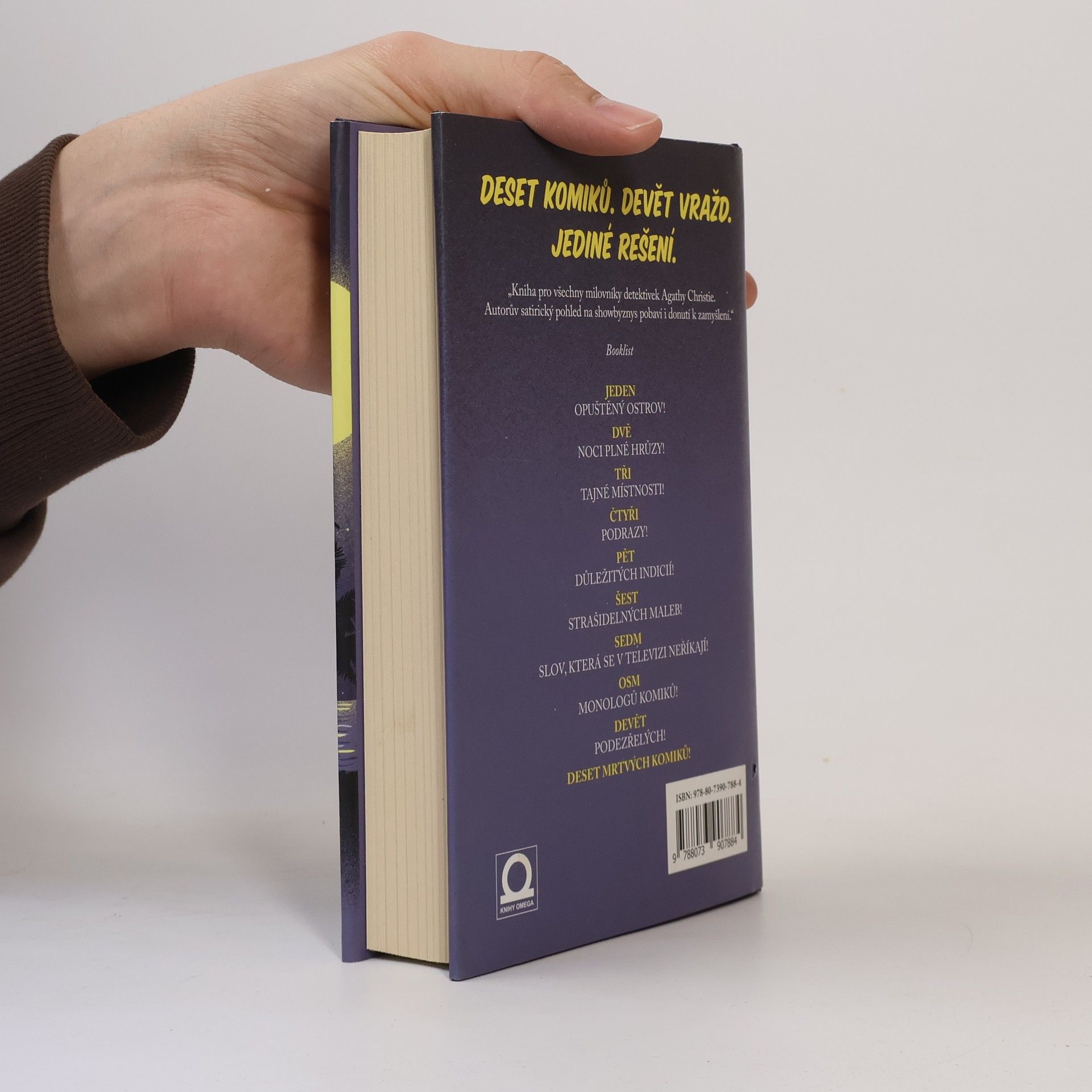 Brilantní Van Lenteho debut je poctou Zlatému věku mystery a zároveň břitkou satirou současného šoubyznysu. Příběh začíná pozváním devíti uznávaných komiků k legendárnímu hollywoodskému producentovi zábavních pořadů Dustinu Walkerovi na jeho soukromý ostrov. Ve skupince je bývalý moderátor populární late-night šou, stand up komik, komik z ulice, jenž pohádkově zbohatl, nebo ikona zábavy z Las Vegas. Všech devět dorazí lodí na ostrov a zjistí, že všechny domy jsou zcela opuštěné. Nefungují tu mobily ani wifi připojení a brzy začne jeden po druhém umírat. Kniha vzdává hold velikánům žánru jako Agatha Christie a jejím Deseti malým černouškům a zároveň originální zábavou díky vtipným a komickým dialogům postav, neboť každá z nich se záhadu snaží vyřešit stylem svého oblíbeného detektiva.