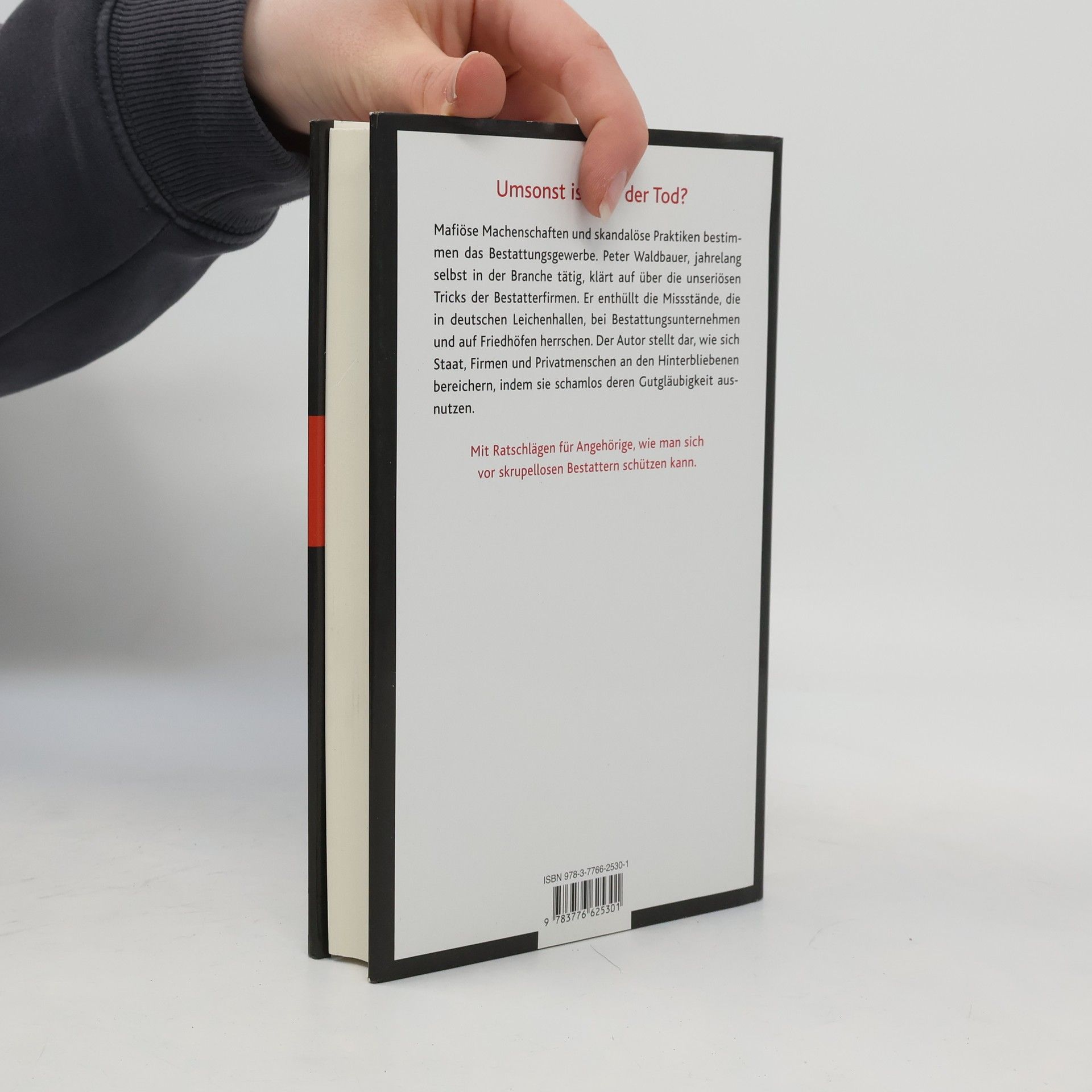 Umsonst ist nur der Tod? Mafiöse Machenschaften und skandalöse Praktiken bestimmen das Bestattungsgewerbe. Peter Waldbauer, jahrelang selbst in der Branche tätig, klärt auf über die unseriösen Tricks der Bestatterfirmen. Er enthüllt die Missstände, die in deutschen Leichenhallen, bei Bestattungsunternehmen und auf Friedhöfen herrschen. Der Autor stellt dar, wie sich Staat, Firmen und Privatmenschen an den Hinterbliebenen bereichern, indem sie schamlos deren Gutgläubigkeit ausnützen. Mit Ratschlägen für Angehörige, wie man sich vor skrupellosen Bestattern schützen kann.