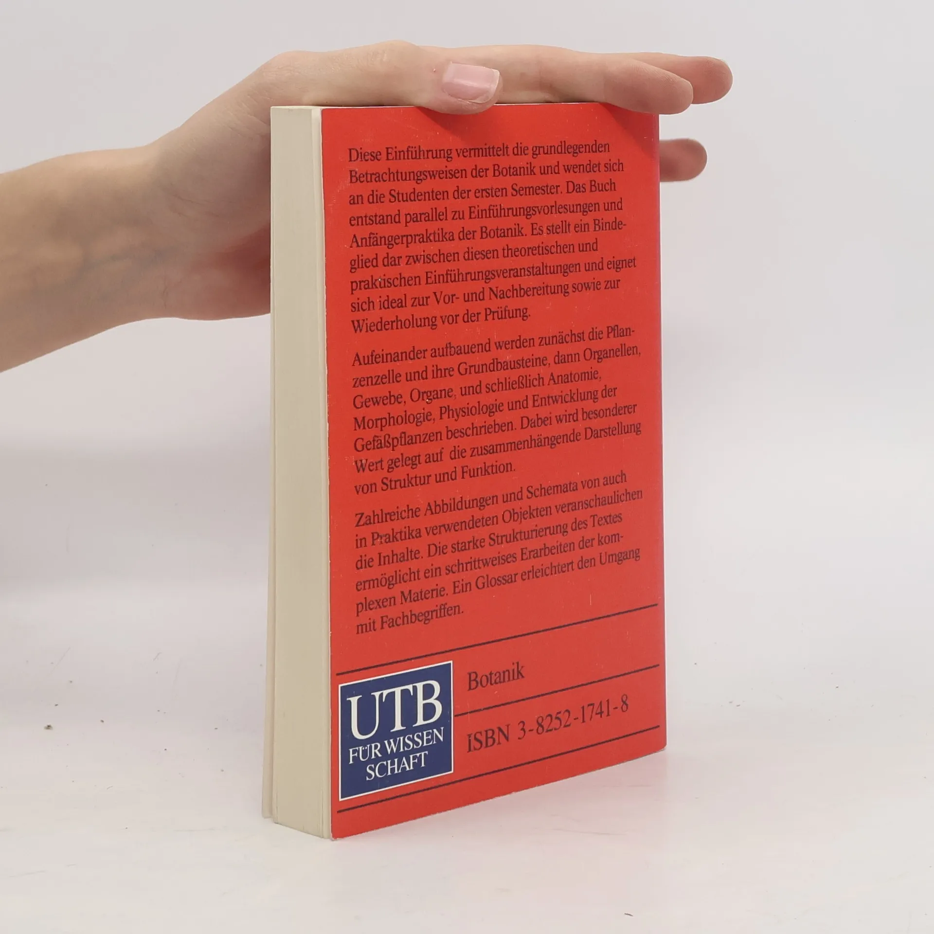 Diese Einführung vermittelt die grundlegenden Betrachtungsweisen der Botanik. Aufeinander aufbauend werden zunächst die Pflanzenzelle und ihre Grundbausteine, dann Organellen, Gewebe, Organe, und schließlich Anatomie, Morphologie, Physiologie und Entwicklung der Gefäßpflanzen beschrieben. Weitere Kapitel informieren über den Zellkern und die Proteinsynthese sowie über die Mitose, Meiose und die Gesetze über die Vererbung. Ein Glossar und eine Liste der Pflanzennamen runden den Band ab.