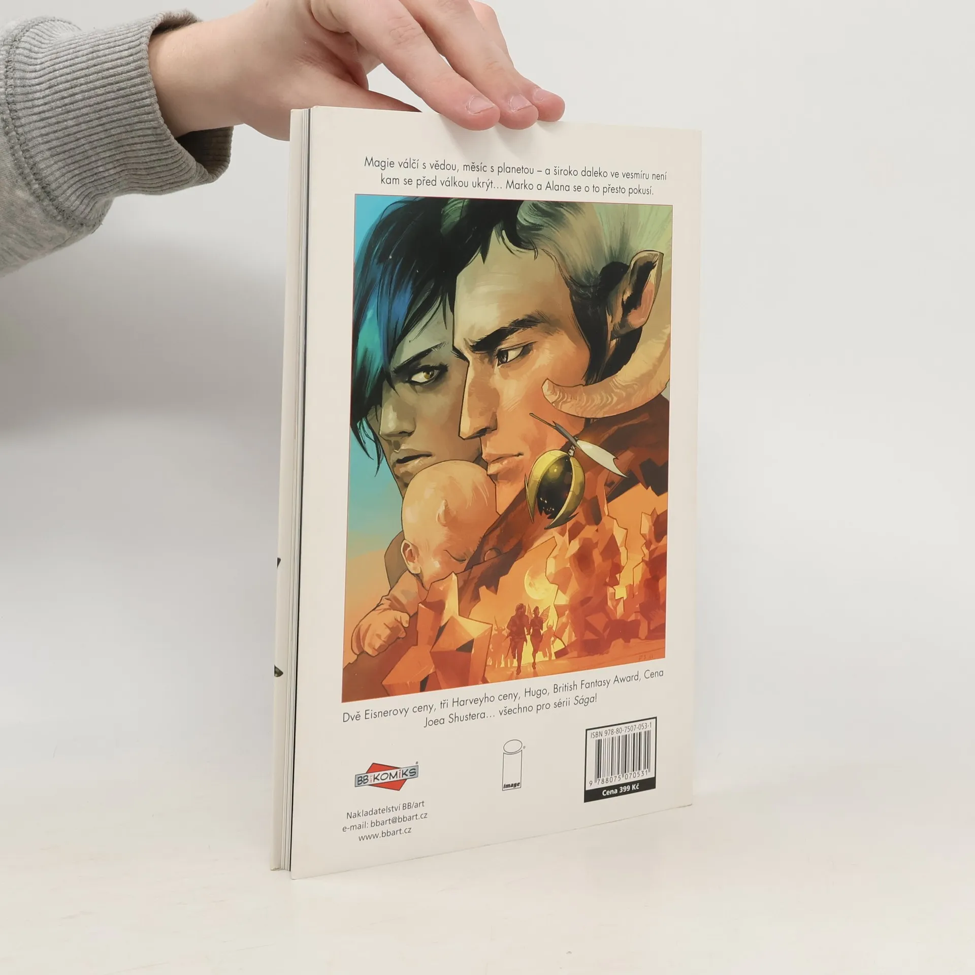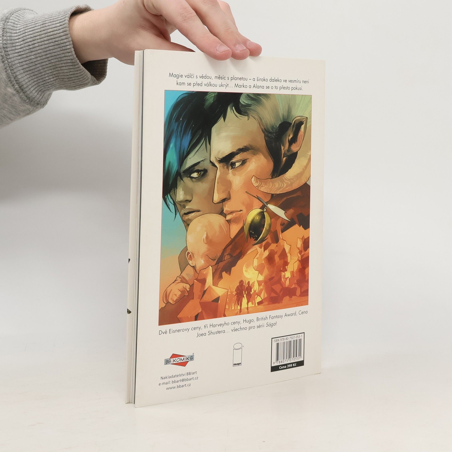 Magie válčí s vědou, měsíc s planetou – a široko daleko ve vesmíru není kam se před válkou ukrýt… Marko a Alana se o to přesto pokusí. Je to fantasy? Je to SF? Kdo vlastně ví... a koho to vlastně zajímá! Je to Sága, jedna z nejlepších původních komiksových sérií nového tisíciletí. Spolu s davy fanoušků po celém světě sledujte osudy Marka a Alany, milenců a čerstvých rodičů, kteří přestali být vojáky v dlouhé válce, jež zachvátila skoro celý vesmír, a stali se dezertéry, které nemilosrdně pronásledují obě strany konfliktu. Protože pro mocipány by nebylo moc příjemné, kdyby se svět dozvěděl, že zástupci dvou nesmiřitelných ras se mohou nejen milovat, ale také plodit potomky…