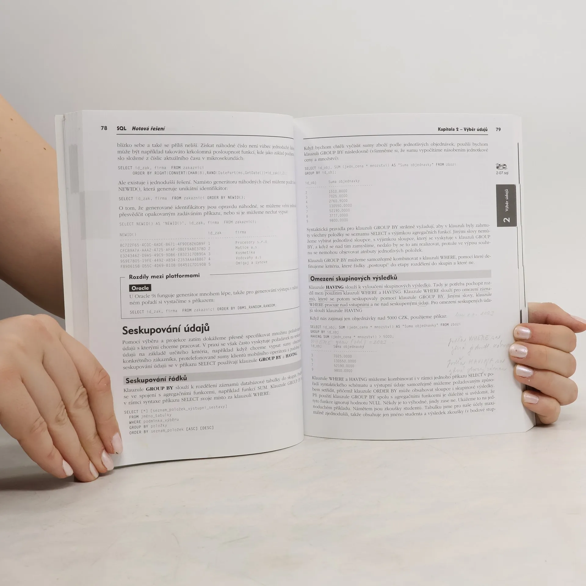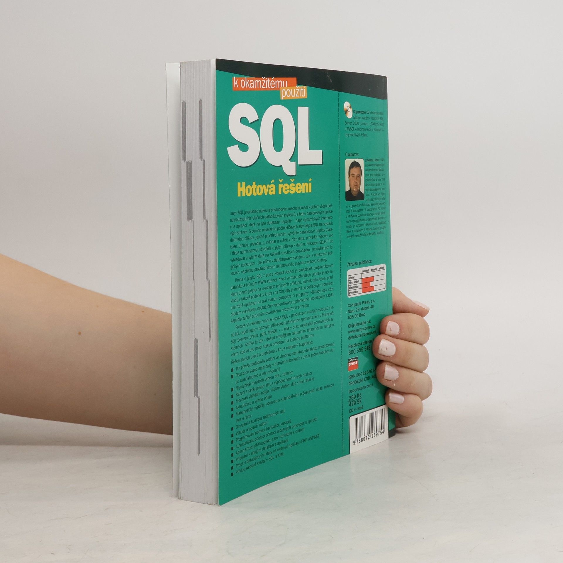 Jazyk SQL slouží jako ovládací nástroj a přístupový mechanismus k datům v běžně používaných relačních databázových systémech a aplikacích, jako jsou dynamické internetové stránky. Pomocí klíčových slov jazyka SQL lze sestavit příkazy pro vytváření databázových objektů, vkládání a změnu dat, provádění výpočtů a administraci uživatelů. Příkaz SELECT umožňuje vyhledávání a výběr dat na základě různých požadavků, a to jak přímo v databázovém systému, tak v aplikacích, například skrze skriptovací jazyk. Kniha z edice Hotová řešení je cenným zdrojem pro programátory databází a tvůrce webových stránek. Učí základy SQL prostřednictvím typických příkladů, které jsou prezentovány tak, aby je čtenáři mohli snadno aplikovat na své databáze či programy po potřebných úpravách. Příklady jsou podrobně vysvětleny, komentovány a přehledně uspořádány, přičemž každá kapitola začíná stručným vysvětlením klíčových principů. Vzhledem k drobným rozdílům v nuancích SQL mezi různými výrobci autor uvádí správné znění pro Microsoft SQL Server, Oracle a MySQL, což jsou nejčastěji používané systémy. Kniha tak představuje aktuální referenční zdroj pro ty, kteří pracují s více platformami.