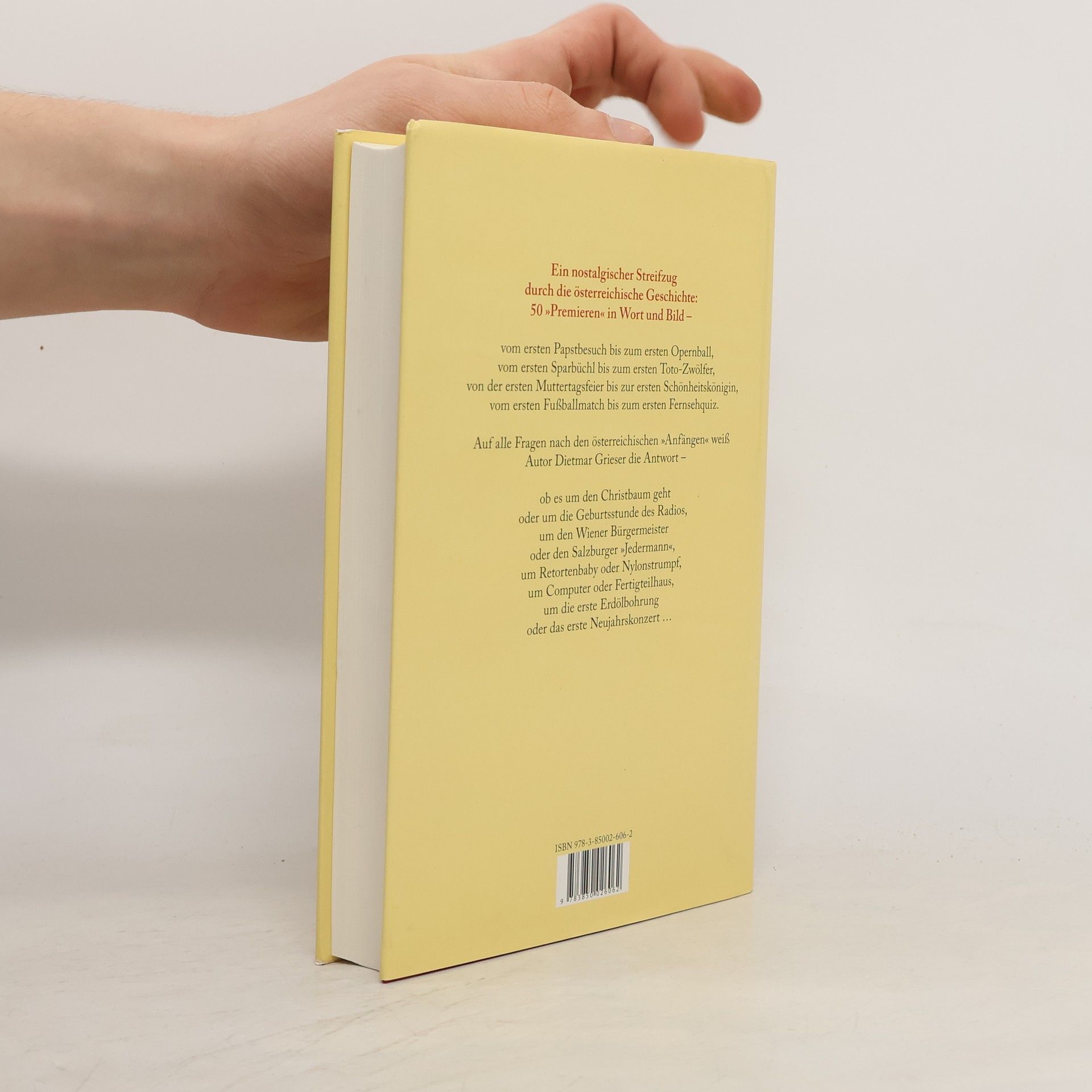 Ein nostalgischer Streifzug durch die österreichische Geschichte - 50 „Premieren“ in Wort und Bild: vom ersten Papstbesuch bis zum ersten Opernball, vom ersten Sparbüchl bis zum ersten Toto-Zwölfer, von der ersten Muttertagsfeier bis zur ersten Schönheitskönigin und vom ersten Fußballmatch bis zum ersten Fernsehquiz. Auf alle Fragen nach den österreichischen „Anfängen“ weiß Autor Dietmar Grieser die Antwort - ob es um den Christbaum geht oder um die Geburtsstunde des Radios, um den Wiener Bürgermeister oder den Salzburger „Jedermann“, um Retortenbaby oder Nylonstrumpf, um Computer oder Fertigteilhaus, um die erste Erdölbohrung oder das erste Neujahrskonzert.