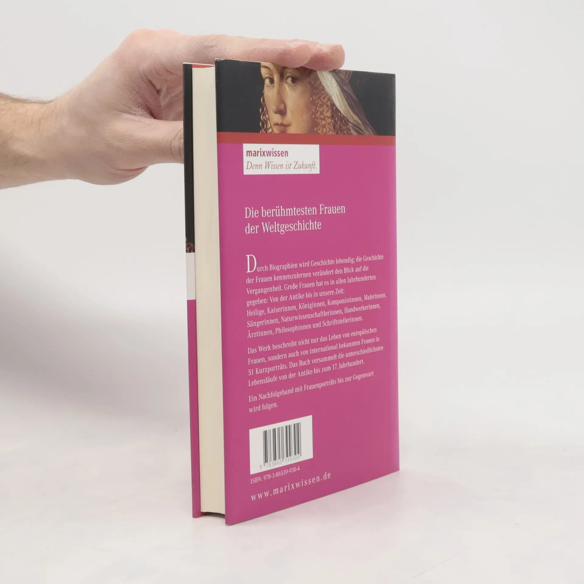 Durch Biographien wird Geschichte lebendig, die Geschichte der Frauen kennen zu lernen verändert den Blick auf die Vergangenheit. Große Frauen hat es in allen Jahrhunderten gegeben: Von der Antike bis in unsere Zeit. Heilige, Kaiserinnen, Königinnen, Komponistinnen, Malerinnen, Sängerinnen, Naturwissenschaftlerinnen, Handwerkerinnen, Ärztinnen, Philosophinnen, Sportlerinnen, Schriftstellerinnen und Nobelpreisträgerinnen. Das Werk beschreibt nicht nur das Leben von europäischen Frauen, sondern auch von international bekannten Frauen in 50 Kurzporträts. Das Buch versammelt die unterschiedlichsten Lebensläufe von der Antike bis zum 17. Jahrhundert. Ein weiterer Band mit Frauenporträts bis zur Gegenwart wird folgen.