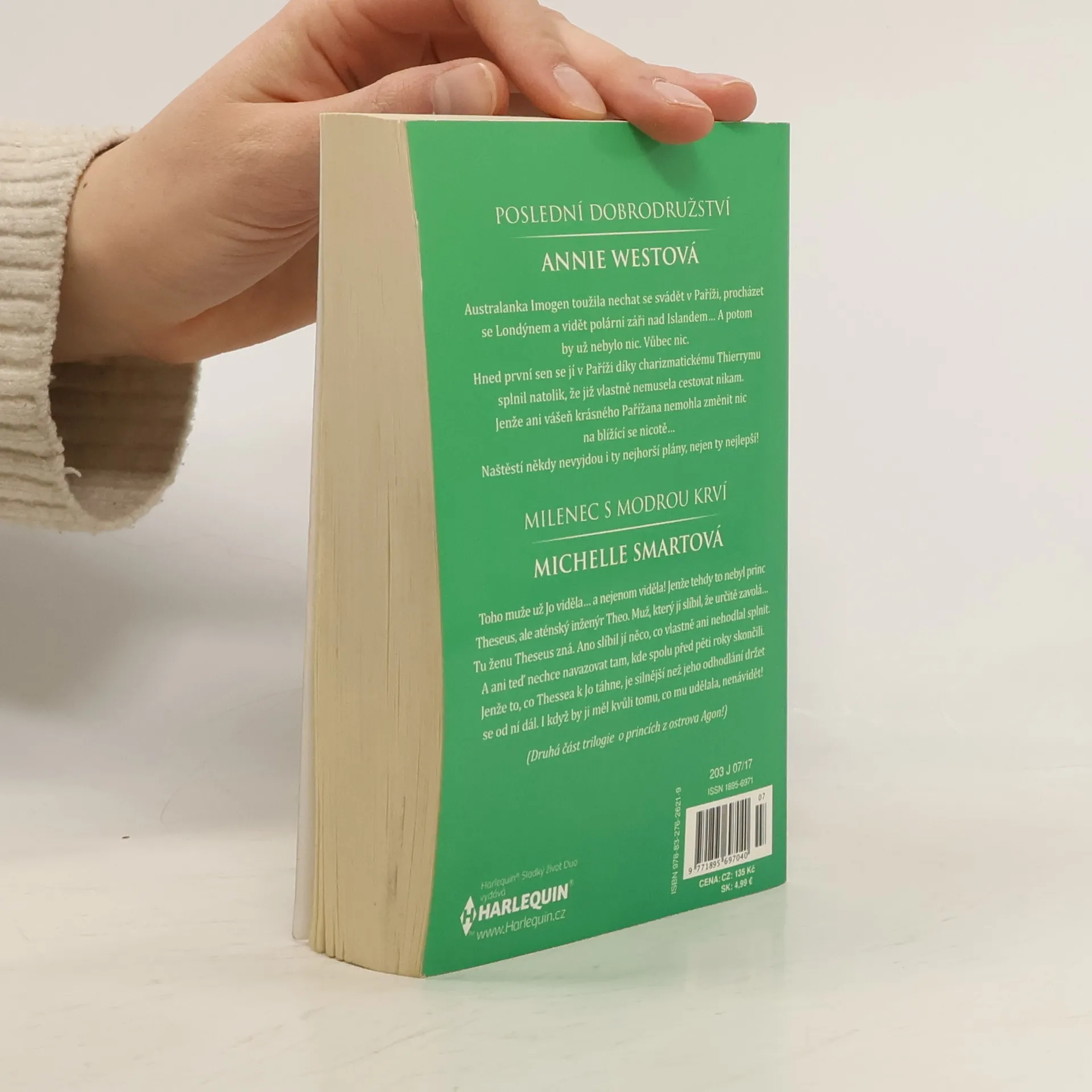 Poslední dobrodružství Australanka Imogen toužila nechat se svádět v Paříži, procházet se Londýnem a vidět polární záři nad Islandem? A potom by už nebylo nic. Vůbec nic. Hned první sen se jí v Paříži díky charizmatickému Thierrymu splnil natolik, že již vlastně nemusela cestovat nikam. Jenže ani vášeň krásného Pařížana nemohla změnit nic na blížící se nicotě… Naštěstí někdy nevyjdou i ty nejhorší plány, nejen ty nejlepší! Milenec s modrou krví Toho muže už Jo viděla… a nejenom viděla! Jenže tehdy to nebyl princ Theseus, ale aténský inženýr Theo. Muž, který jí slíbil, že určitě zavolá… Tu ženu Theseus zná. Ano slíbil jí něco, co vlastně ani nehodlal splnit. A ani teď nechce navazovat na to, kde spolu před pěti roky skončili. Jenže to, co ho k Jo táhne, je silnější než jeho odhodlání držet se od ní dál. A to i přesto, že by ji měl kvůli tomu, co mu udělala, nenávidět! (Druhá část trilogie Princové z ostrova Agon!)