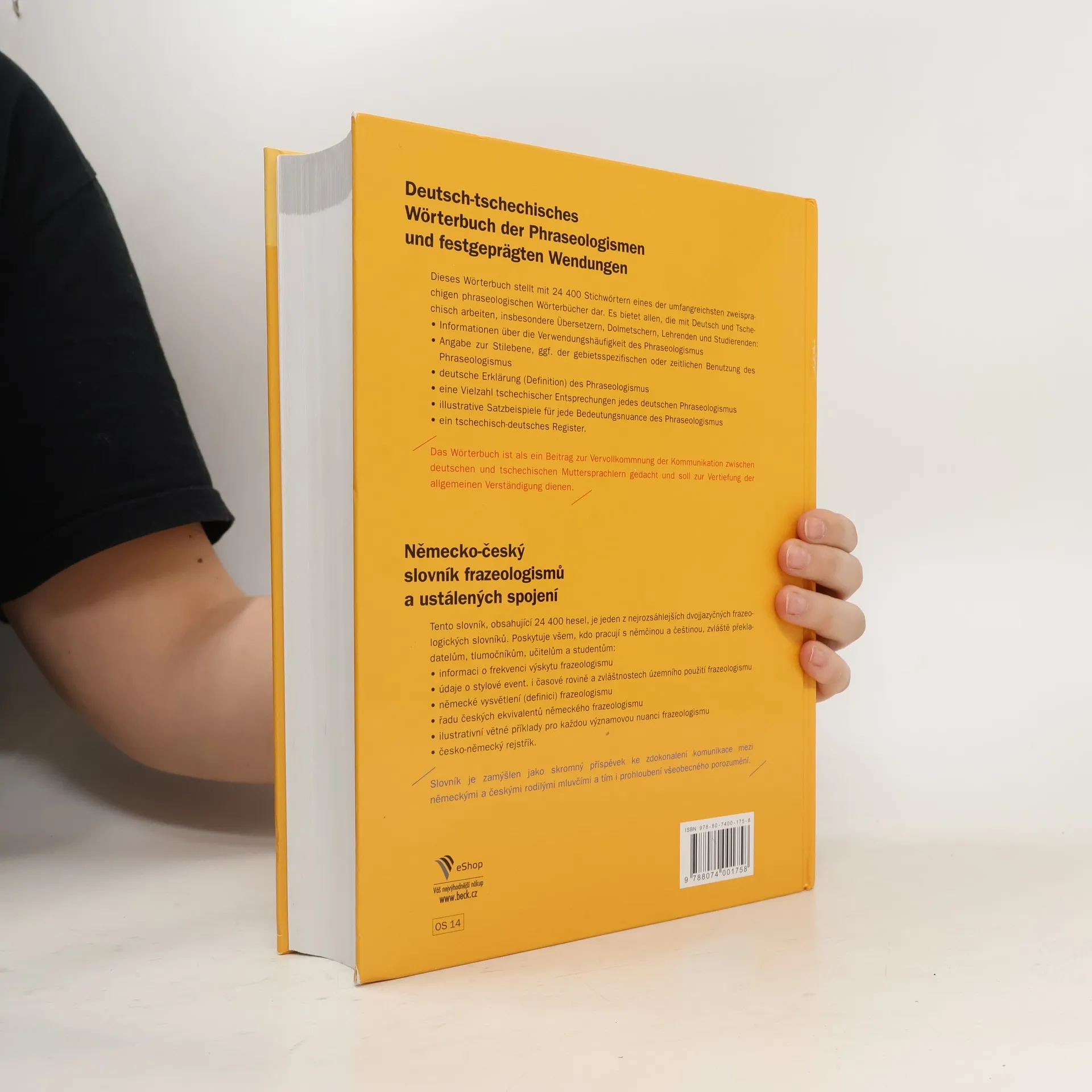Tento slovník, obsahující 24 400 hesel, je jeden z nejrozsáhlejších dvojjazyčných frazeologických slovníků. Poskytuje všem, kdo pracují s němčinou a češtinou, zvláště překladatelům, tlumočníkům, učitelům a studentům: * informaci o frekvenci výskytu frazeologismu * údaje o stylové event. i časové rovině a zvláštnostech územního použití frazeologismu * německé vysvětlení (definici) frazeologismu * řadu českých ekvivalentů německého frazeologismu * ilustrativní větné příklady pro každou významovou nuanci frazeologismu * česko-německý rejstřík. Slovník je zamýšlen jako skromný příspěvek ke zdokonalení komunikace mezi německými a českými rodilými mluvčími a tím i prohloubení všeobecného porozumění.