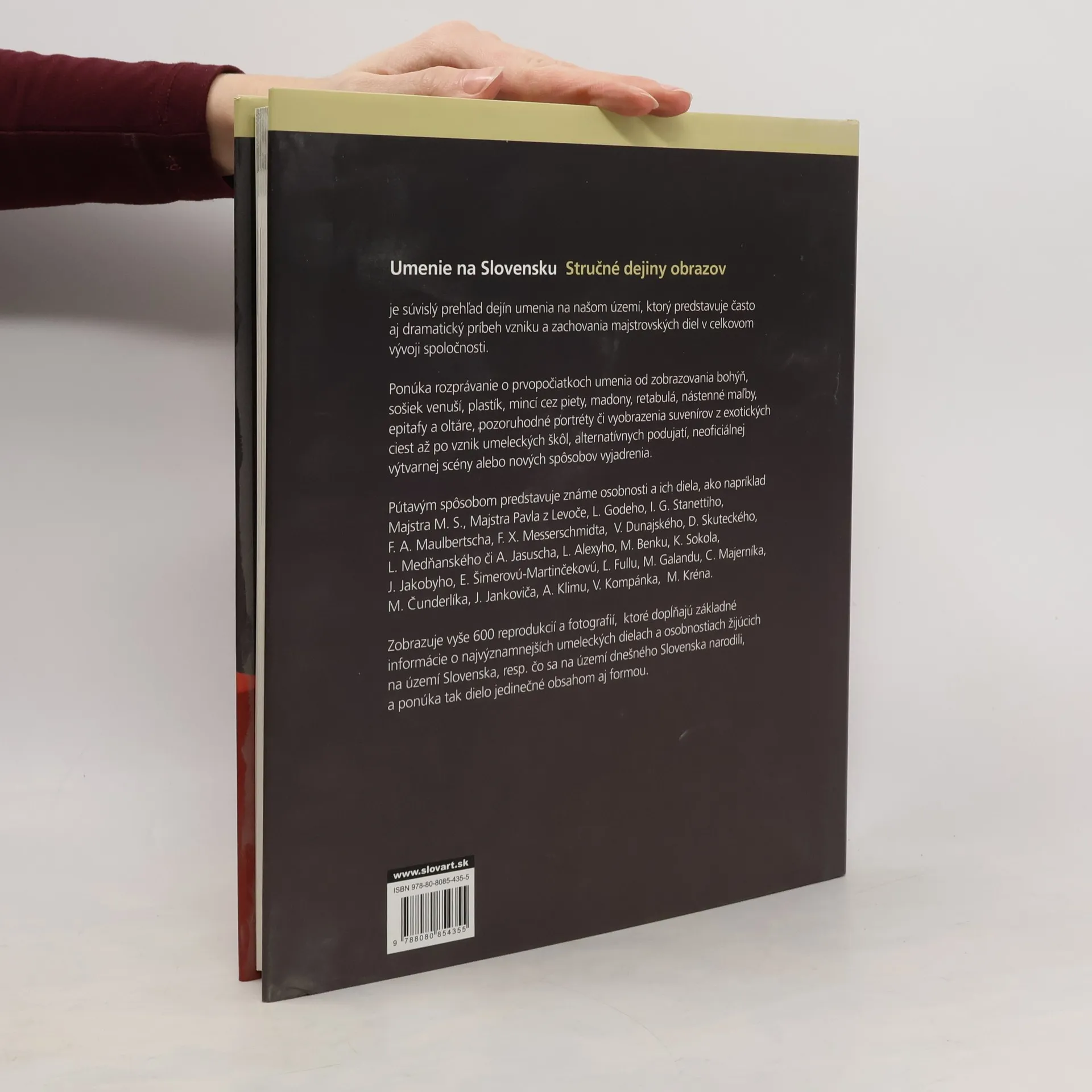 Publikácia, ktorá voľne nadväzuje na knihu Architektúra na Slovensku – stručné dejiny, prehľadne rozpráva o dejinách výtvarného umenia na Slovensku od najstarších čias. Text publikácie je rozdelený do kapitol podľa ťažiskových historických období (pravek, stredovek, novovek, 19. storočie, 20. storočie) v závislosti od dejinných premien a funkcie umenia. Každá kapitola prináša stručnú charakteristiku spoločensko- historických pomerov v spoločnosti, predstavuje významné umelecké osobnosti, pozoruhodné diela známych i neznámych majstrov- umelcov. Zobrazuje vyše 600 reprodukcií a fotografií, ktoré dopĺňajú základné informácie o najvýznamnejších umeleckých dielach a osobnostiach žijúcich na území Slovenska, resp. čo sa na území dnešného Slovenska narodili, a ponúka tak dielo jedinečné obsahom aj formou. Autori: Zuzana Bartošová Ivan Gerát Marta Herucová Jozef Medvecký Martin Vančo