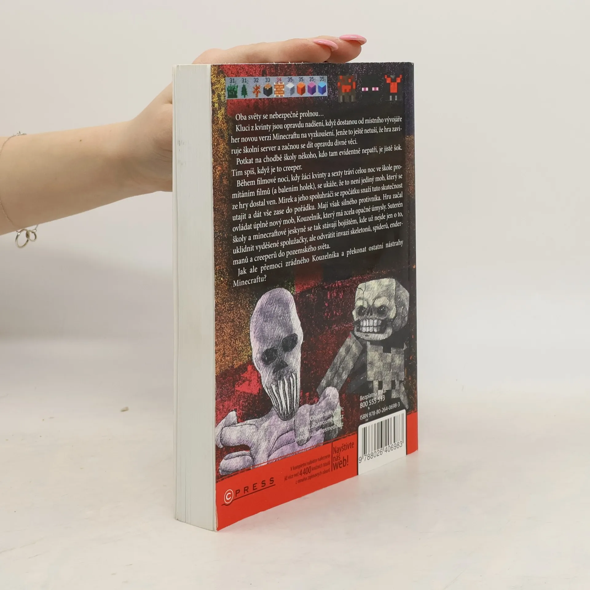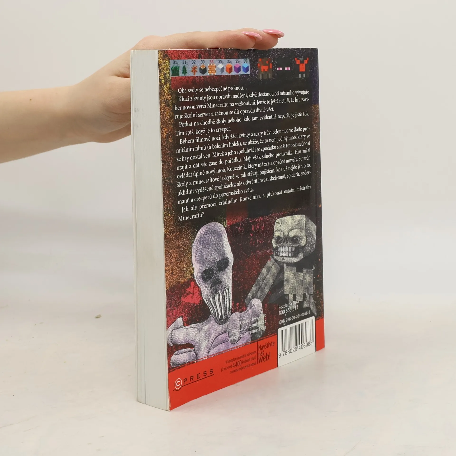 Kluci a holky dobrovolně otvírají knihu, místo aby strávili další odpoledne u počítače. Myslíte si, že je to sci-fi? Nikoliv. To jsou VETŘELCI Z MINECRAFTU! Napínavý a dech beroucí příběh na motivy světoznámé počítačové hry pohltí každého milovníka akce, nebezpečí, humoru a překvapivých zvratů ve věku od 10 do 15 let. Kluci z kvinty jsou opravdu nadšení, když dostanou od místního vývojáře her novou verzi Minecraftu na odzkoušení. Jenže to ještě netuší, že hra zaviruje školní server a začnou se dít opravdu divné věci. Potkat na chodbě školy někoho, kdo tam evidentně nepatří, je jistě šok. Tím spíš, když je to creeper. Během filmové noci, kdy žáci kvinty a sexty tráví celou noc ve škole promítáním filmů (a balením holek), se ukáže, že to není jediný mob, který se ze hry dostal ven. Mirek a jeho spoluhráči se zpočátku snaží tuto skutečnost utajit a dát vše zase do pořádku. Jenže mají silného protivníka. Hru začal ovládat úplně nový mob, Kouzelník, který má zcela opačné úmysly. Oba světy se nebezpečně prolnou. Suterén školy a minecraftové jeskyně se tak stávají bojištěm, kde už nejde jen o to, uklidnit vyděšené spolužačky, ale odvrátit invazi skeletonů, spiderů, endermanů a creeperů do pozemského světa. Podaří se partě známých hráčů přemoci zrádného Kouzelníka a ostatní nástrahy Minecraftu? ISBN pro soubor: 978-80-264-0870-3