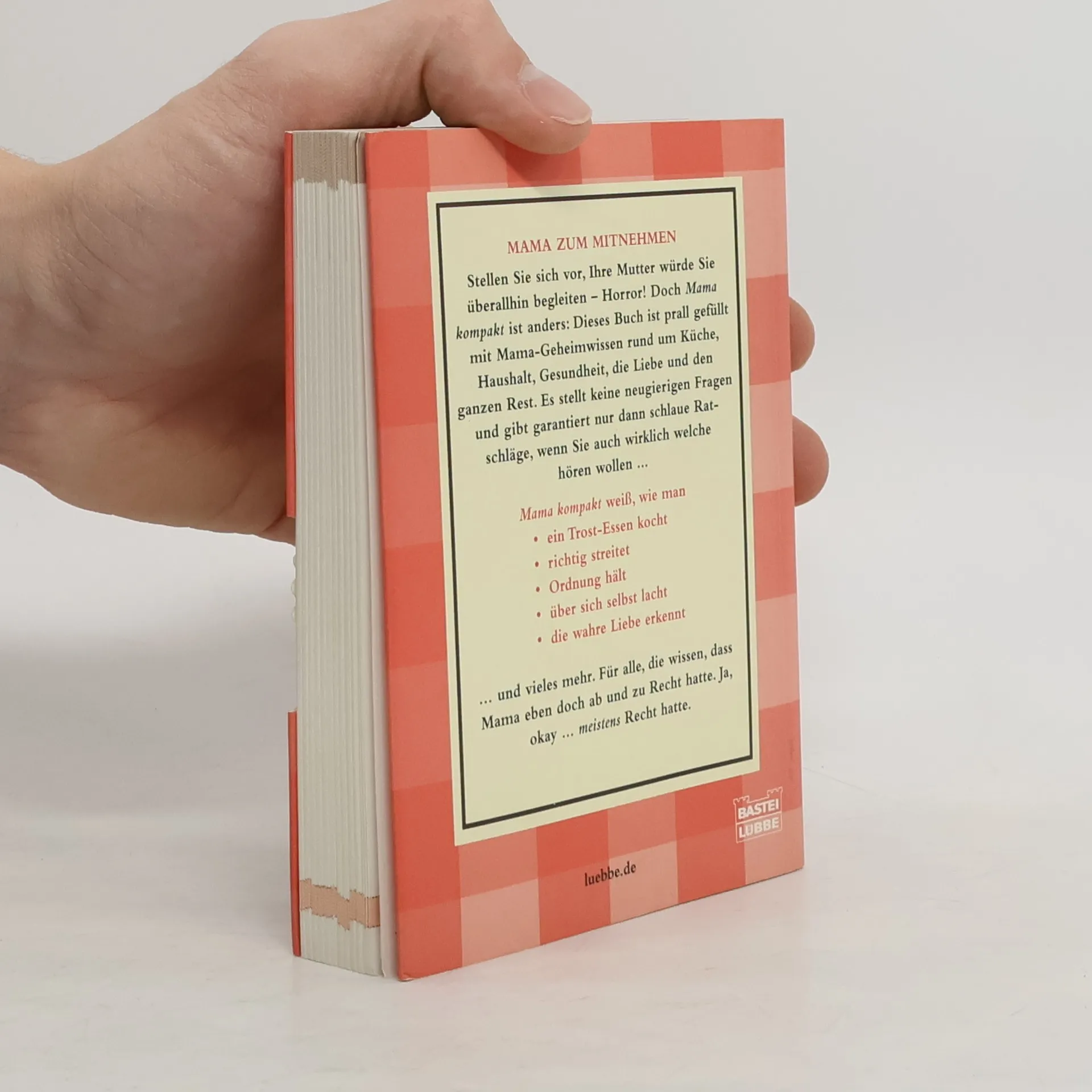 Stellen Sie sich vor, Ihre Mutter würde Sie überall hinbegleiten - Horror! Doch Mama kompakt ist anders: Dieses Buch ist prall gefüllt mit Mama-Geheimwissen rund um Küche, Haushalt, Gesundheit, die Liebe und den ganzen Rest. Es ist klein und schlank, stellt keine neugierigen Fragen und gibt garantiert nur dann schlaue Ratschläge, wenn Sie auch wirklich welche hören wollen ...Mama kompakt weiß, wie man- ein Trostessen kocht- Hemden bügelt- richtig streitet- Ordnung hält- über sich selbst lacht- die wahre Liebe erkennt? und vieles mehr. Für alle, die wissen, wie sich der raue Wind der Wirklichkeit anfühlt und, dass Mama eben doch ab und zu Recht hatte. Ja, okay ? meistens Recht hatte.