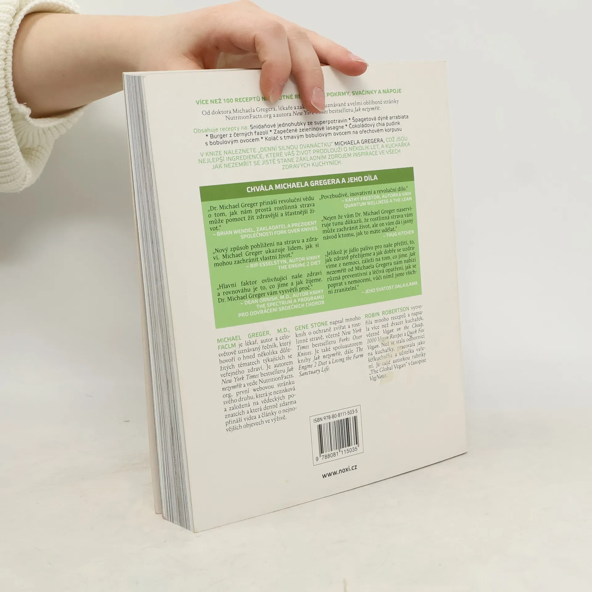 V knize naleznete „denní silnou dvanáctku“ Michaela Gregera, což jsou nejlepší ingredience, které váš život prodlouží o několik let, a kuchařka Jak nezemřít se jistě stane základním zdrojem inspirace ve všech zdravých kuchyních. MICHAEL GREGER, M.D., FACLM je lékař, autor a celosvětově uznávaný řečník, který hovoří o hned několika důležitých tématech týkajících se veřejného zdraví. Je autorem New York Times bestselleru Jak nezemřít a vede NutritionFacts. org, první webovou stránku svého druhu, která je nezisková a založená na vědeckých poznatcích a která denně zdarma přináší videa a články o nejnovějších objevech ve výživě. GENE STONE napsal mnoho knih o ochraně zvířat a rostlinné stravě, včetně New York Times bestselleru Forks Over Knives. Je také spoluautorem knihy Jak nezemřít, The Engine 2 Diet a Living the Farm Sanctuary Life. ROBIN ROBERTSON vytvořila mnoho receptů a napsala více než dvacet kuchařek, včetně Vegan on the Cheap, 1000 Vegan Recipes a Quick Fix Vegan. Než se stala odbornicí na kuchařky, pracovala jako šéfkuchařka a učitelka vaření. Je také autorkou rubriky „The Global Vegan“ v časopise VegNews.
