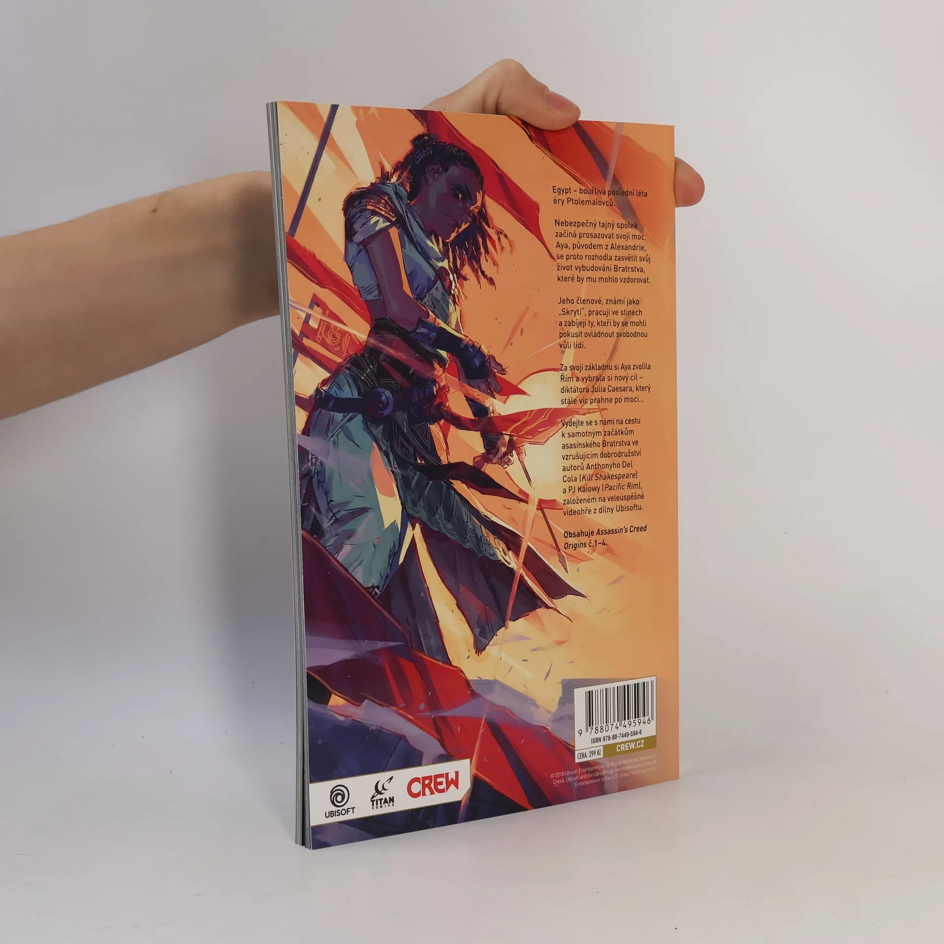 Egypt – bouřlivá poslední léta éry Ptolemaiovců. Nebezpečný tajný spolek začíná prosazovat svoji moc, Aya, původem z Alexandrie, se proto rozhodla zasvětit svůj život vybudování Bratrstva, které by mu mohlo vzdorovat. Jeho členové, známí jako „Skrytí“, pracují ve stínech a zabíjejí ty, kteří by se mohli pokusit ovládnout svobodnou vůli lidí. Za svoji základnu si Aya zvolila Řím a vybrala si nový cíl – diktátora Julia Caesara, který stále víc prahne po moci… Vydejte se s námi na cestu k samotným začátkům asasínského Bratrstva ve vzrušujícím dobrodružství autorů Anthonyho Del Cola (Kill Shakespeare) a PJ Kaiowy (Pacific Rim), založeném na veleúspěšné videohře z dílny Ubisoftu. Obsahuje Assassin’s Creed Origins č.1–4.