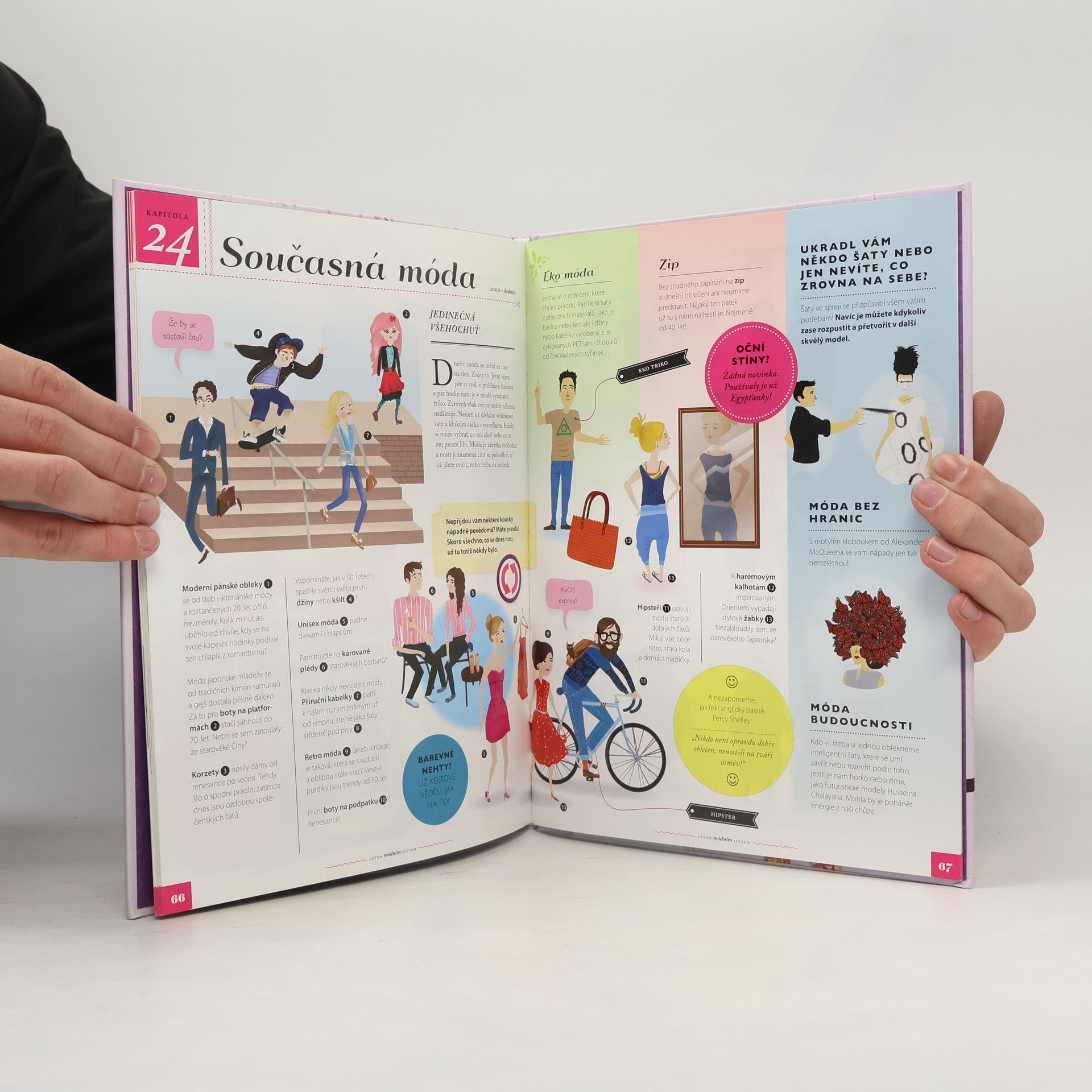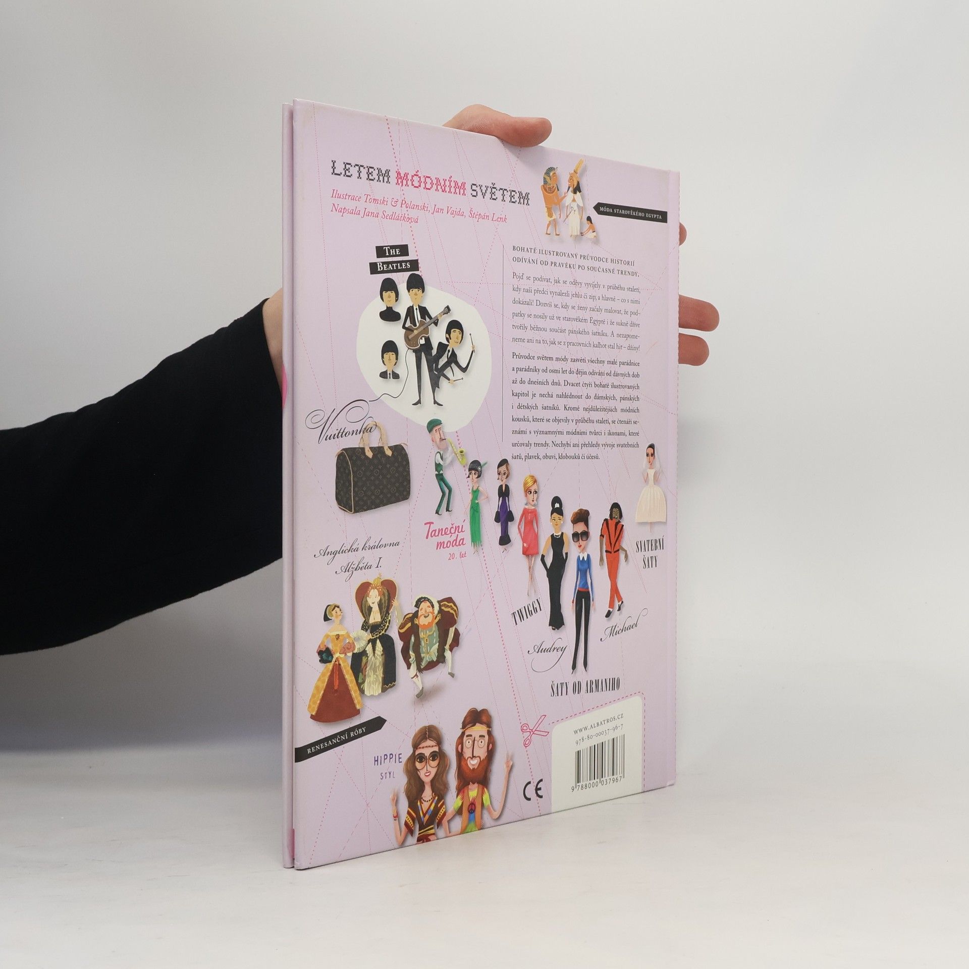 Bohatě ilustrovaný průvodce historie odívání od pravěku po současné trendy. Pojď se podívat, jak se oděvy vyvíjely v průběhu staletí, kdy naši předci vynalezli jehlu či zip, a hlavně – co s nimi dokázali! Dozvíš se, kdy se ženy začaly malovat, že podpatky se nosily už ve starověkém Egyptě i že sukně dříve tvořily běžnou součást pánského šatníku. A nezapomeneme ani na to, jak se z pracovních kalhot stal hit – džíny! Průvodce světem módy provede všechny malé parádnice a parádníky od osmi let historií odívání od pravěku až po dnešní dny. Dvacet čtyři bohatě ilustrovaných kapitol je nechá nahlédnout do dámských, pánských i dětských šatníků. Kromě nejdůležitějších módních kousků, které se objevily v průběhu staletí, se čtenáři seznámí s významnými módními tvůrci i ikonami, které určovaly trendy. Nechybí ani přehledy vývoje svatebních šatů, plavek, obuvi, klobouků či účesů. Zajímá tě móda? Víš přesně, které kousky šatů se k sobě hodí a které spolu naopak vůbec neladí? Sleduješ trendy a neunikne ti žádná módní novinka? Pak ti nesmí uniknout ani tahle kniha.