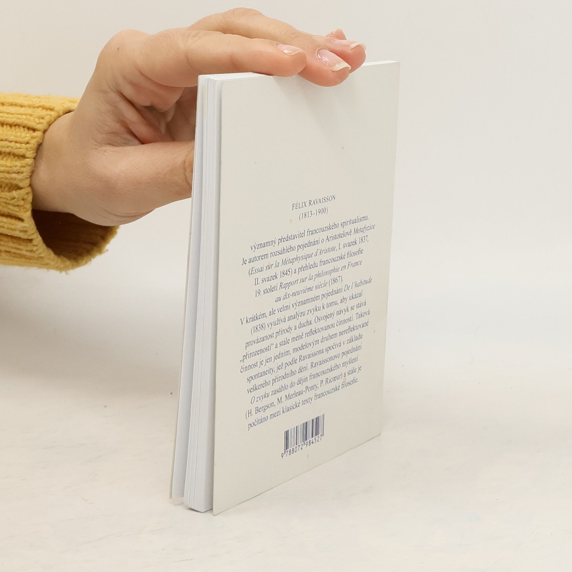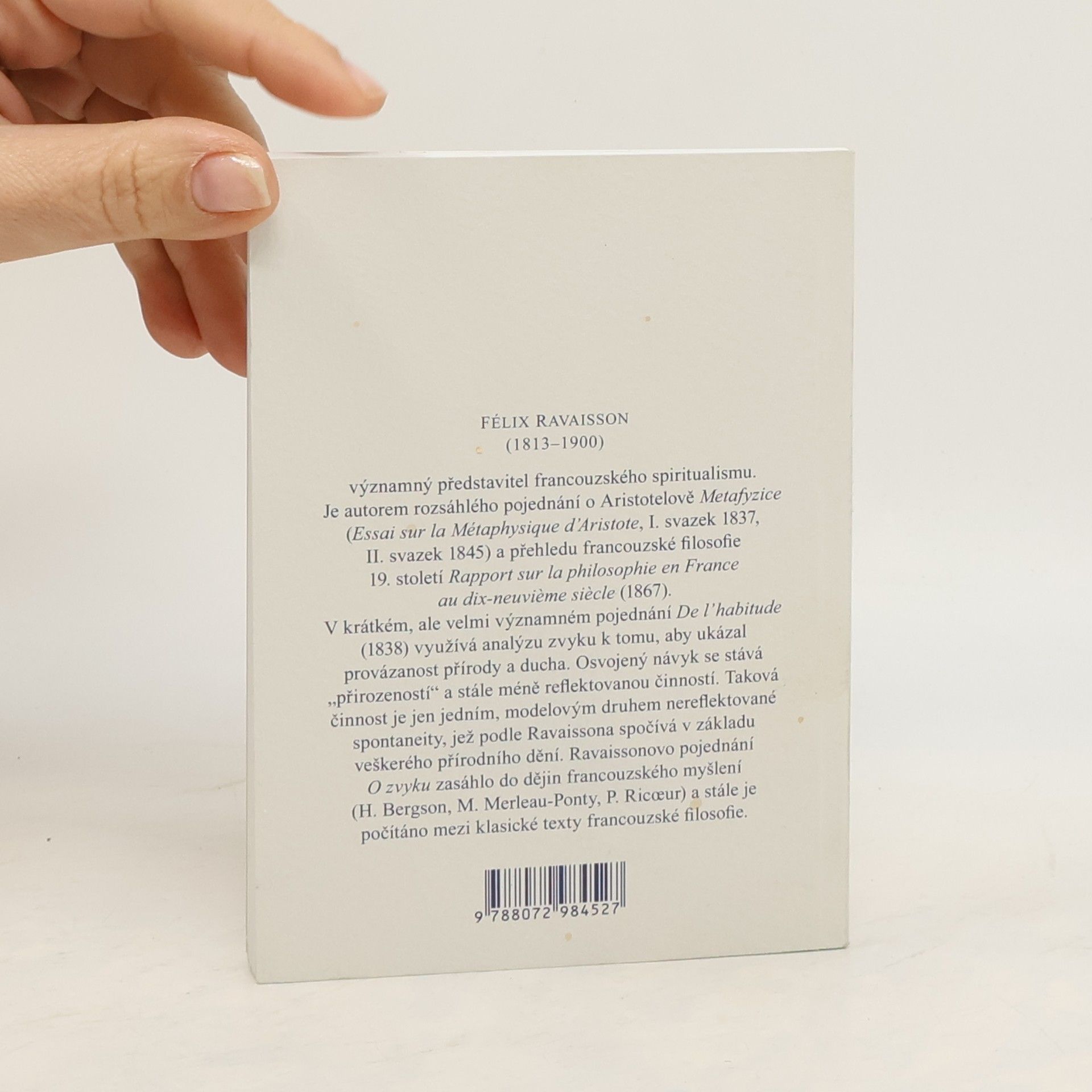 Francouzský filosof Félix Ravaisson (1813-1900) je nedoceněným zdrojem inspirace pro filosofii 20. století. Je autorem významného pojednání o Aristotelově Metafyzice a přehledu francouzské filosofie 19. století, jehož závěrečná kapitola je považována za manifest francouzského spiritualismu. Nejvýznamnějším Ravaissonovým dílem je však krátké pojednání O zvyku (1838). V něm se opírá o Aristotela a francouzské spiritualisty, analyzující zvyk v kontextu filosofie přírody a ducha. Zkoumá, jaký typ jsoucna může zvyk získat a jak ovlivňuje svobodu ducha, který se stává méně sebevědomým a svobodným, přičemž získává neměnnou "přirozenost". Fenomén zvyku tak ukazuje na ontologickou jednotu přírody a ducha, přičemž obě oblasti sdílejí nereflektovanou spontánnost. Ravaissonovo pojednání mělo významný dopad na francouzské myšlení; například Bergson vycházel z jeho závěrů při formulaci duality mezi bezprostředním a zprostředkovaným poznáním. Fenomenologičtí autoři, jako Paul Ricoeur a Maurice Merleau-Ponty, se rovněž vyrovnávali s Ravaissonovým pojetím zvyku.