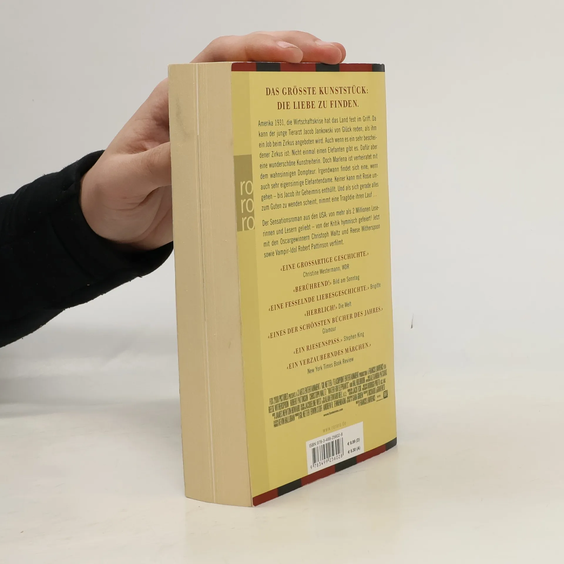 Das schwierigste Kunststück: die Liebe zu finden.Amerika 1931, die Wirtschaftskrise hat das Land fest im Griff. Da kann der junge Tierarzt Jacob Jankowski von Glück reden, als ihm ein Job beim Zirkus angeboten wird. Auch wenn es ein sehr bescheidener Zirkus ist: Nicht einmal einen Elefanten gibt es. Dafür aber eine wunderschöne Kunstreiterin. Doch Marlena ist verheiratet mit dem wahnsinnigen Dompteur. Irgendwann findet sich doch eine, wenn auch sehr eigensinnige Elefantendame. Keiner kann mit Rosie umgehen – bis Jacob ihr Geheimnis enthüllt. Und als sich gerade alles zum Guten zu wenden scheint, nimmt eine Tragödie ihren Lauf.Der Sensationsroman aus den USA: von mehr als 2 Millionen Leserinnen und Lesern geliebt – von der Kritik hymnisch gefeiert! Jetzt mit den Oscargewinnern Christoph Waltz und Reese Witherspoon sowie Vampir-Idol Robert Pattinson verfilmt.«Eine grossartige Geschichte.»Christine Westermann, WDR«Berührend!» Bild am Sonntag«Eine fesselnde Liebesgeschichte.» Brigitte«Herrlich!» Die Welt«Eines der schönsten Bücher des Jahres.» Glamour«Ein Riesenspass.» Stephen King«Ein verzauberndes Märchen.»New York Times Book Review