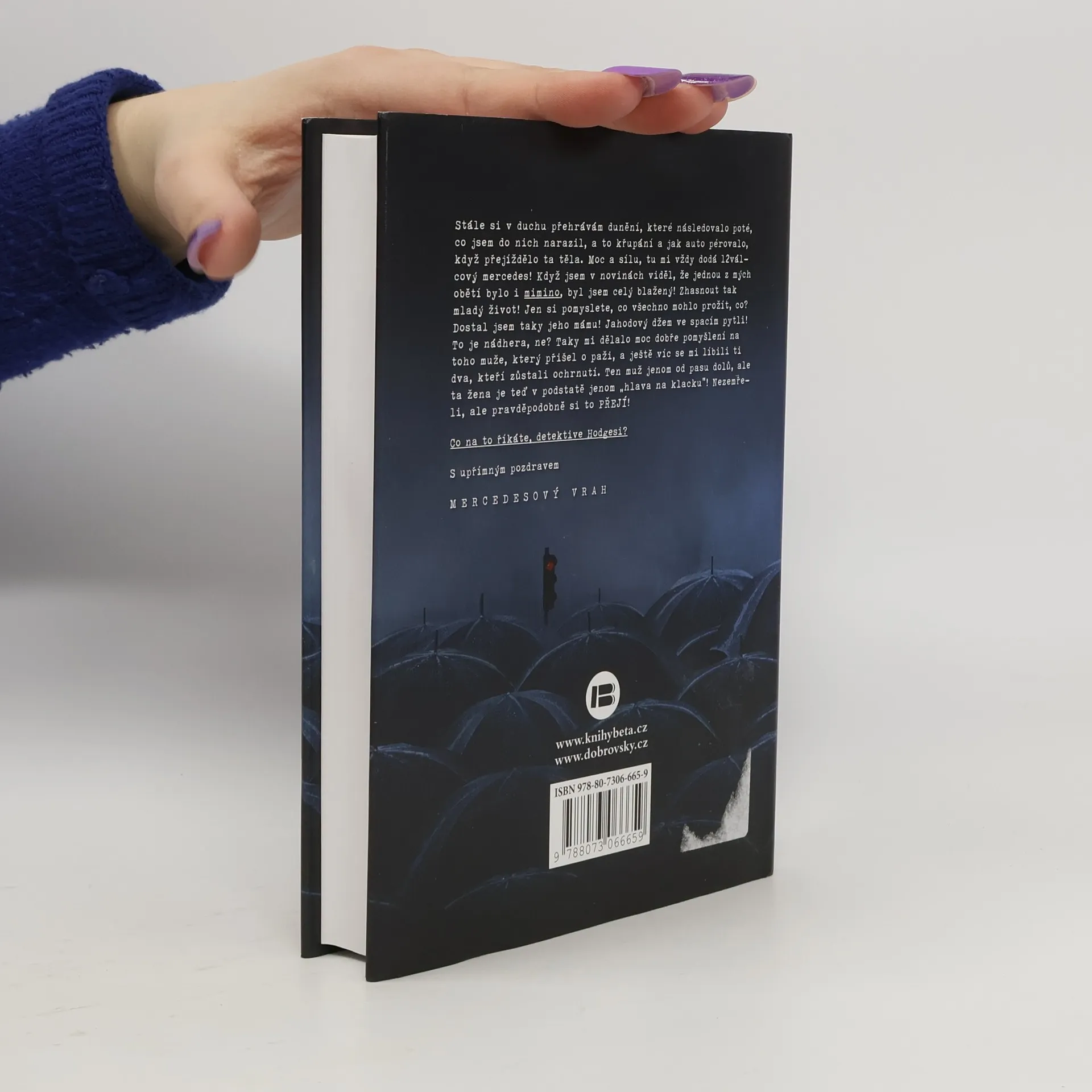 V nuzném městečku na americkém středozápadě dojde k neštěstí – neznámý řidič v ukradeném mercedesu úmyslně vjede do fronty nezaměstnaných před pracovní agenturou a na místě zůstane osm mrtvých a patnáct zraněných. Řidič z místa činu ujede. Po několika měsících dostane vysloužilý zatrpklý policista ze stejného městečka podivný dopis od kohosi, kdo se k činu přihlásí a zároveň oznámí, že chystá mnohem strašlivější útok – plánuje zmasakrovat tisíce lidí. Policistu to probudí z letargie a nastane závod s časem, aby zločinci ve vražedném útoku zabránil. Detektivní příběh ve stylu drsné školy z pera mistra napětí umožní čtenářům děsivým a nezapomenutelným způsobem nahlédnout do mysli šíleného posedlého vraha. Příběh byl inspirován skutečnou událostí a jeho závěr, což je mnohem mrazivější, skutečnou událost naopak předjímal.