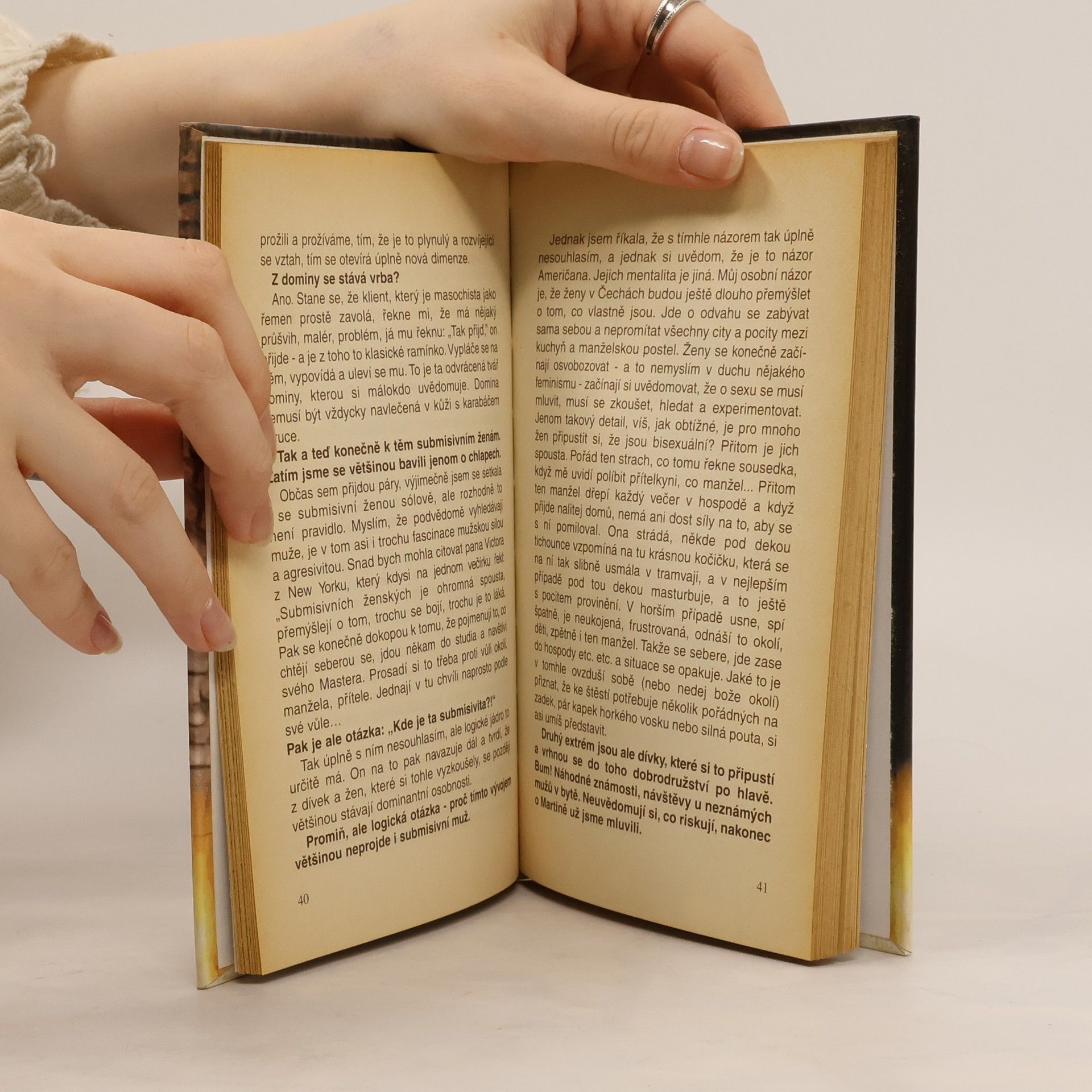 Sadomasochismus, sadismus a masochismus jsou sexuální odchylky, které se mohou vyskytovat společně nebo samostatně. Sadismus spočívá v ovládání druhého, zatímco masochismus přináší vzrušení z podřízení se. Mnoho párů si své sexuální potřeby doplňuje technikami S/M, včetně pomůcek jako pouta a bičíky. Pokud se praktikují na základě vzájemné dohody, nelze jim nic vytknout, protože oba partneři mají situaci pod kontrolou a nedochází k újmě na zdraví. Na profesionálním sexuálním trhu je poptávka po dominách, které muži vyhledávají a podřizují se jim. Muži se sadistickými sklony často snadněji nacházejí partnerky, které preferují pasivitu, zatímco muži mají tendenci k aktivitě a moci. Sex je složitá oblast, kde je důležité se domlouvat na praktikách, které jsou oběma přijatelné, což autoři nazývají "mantinely". Hraní by mělo probíhat podle pravidel a v mezích, které jsou pro oba uspokojivé. Realita nemusí být ideální, ale pokud se stane přijatelným kompromisem, může přinášet oběma stranám uspokojení. Kniha se zaměřuje na intimní zpovědi lidí, kteří vyhledávají bolest a ponížení pro své fyzické i duševní uspokojení, a odhaluje dosud tabuizovaný životní styl této skupiny.