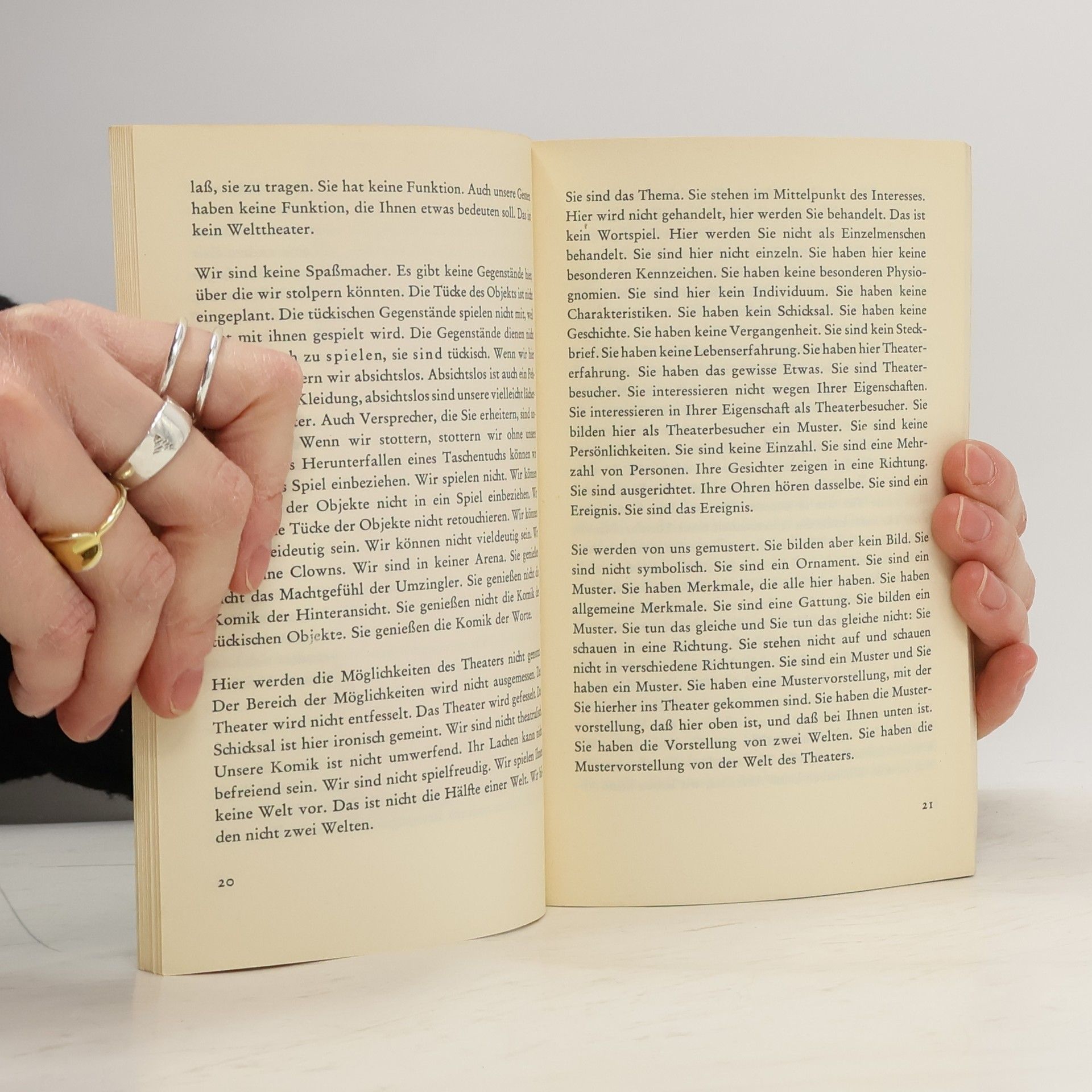 „Die Publikumsbeschimpfung ist kein Stück gegen den Zuschauer. Oder es ist nur deswegen ein Stück gegen den Zuschauer, daß es ein Stück für den Zuschauer werden kann. 75 Min.