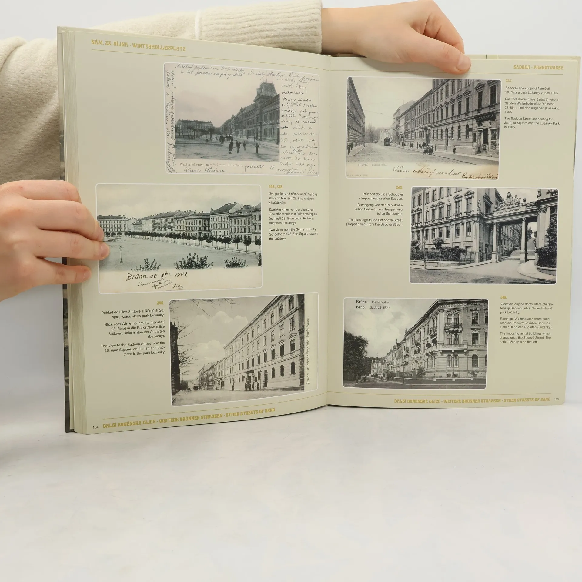 Jedná se nejreprezentativnější výběr pohlednic města Brna z přelomu 19. a 20. století (240 stran, křídový papír, velký formát). Hledáte-li dotyk let minulých, atmosféru doby, kdy místo automobilů jezdily jen drožky, města nebyla zamořena všudypřítomnými vandaly a hlukem, dobu, kdy se právě rodila elektrická tramvaj a po ulicích chodila spousta perfektně oblečených dam a džentlmenů, hledáte správně. V přehledné formě je představeno jak centrum města, tak i řada dalších ulic a brněnská předměstí i výletní a sportovní centra Pisárky a Kamenný mlýn. V nadpisech jednotlivých ulic a náměstí je vždy uveden jejich současný název, doplněný dobovým názvem německým. Jedná se o publikaci především obrazovou, veškeré texty jsou omezeny jen na nezbytné minimum v jazyce českém, německém a anglickém.