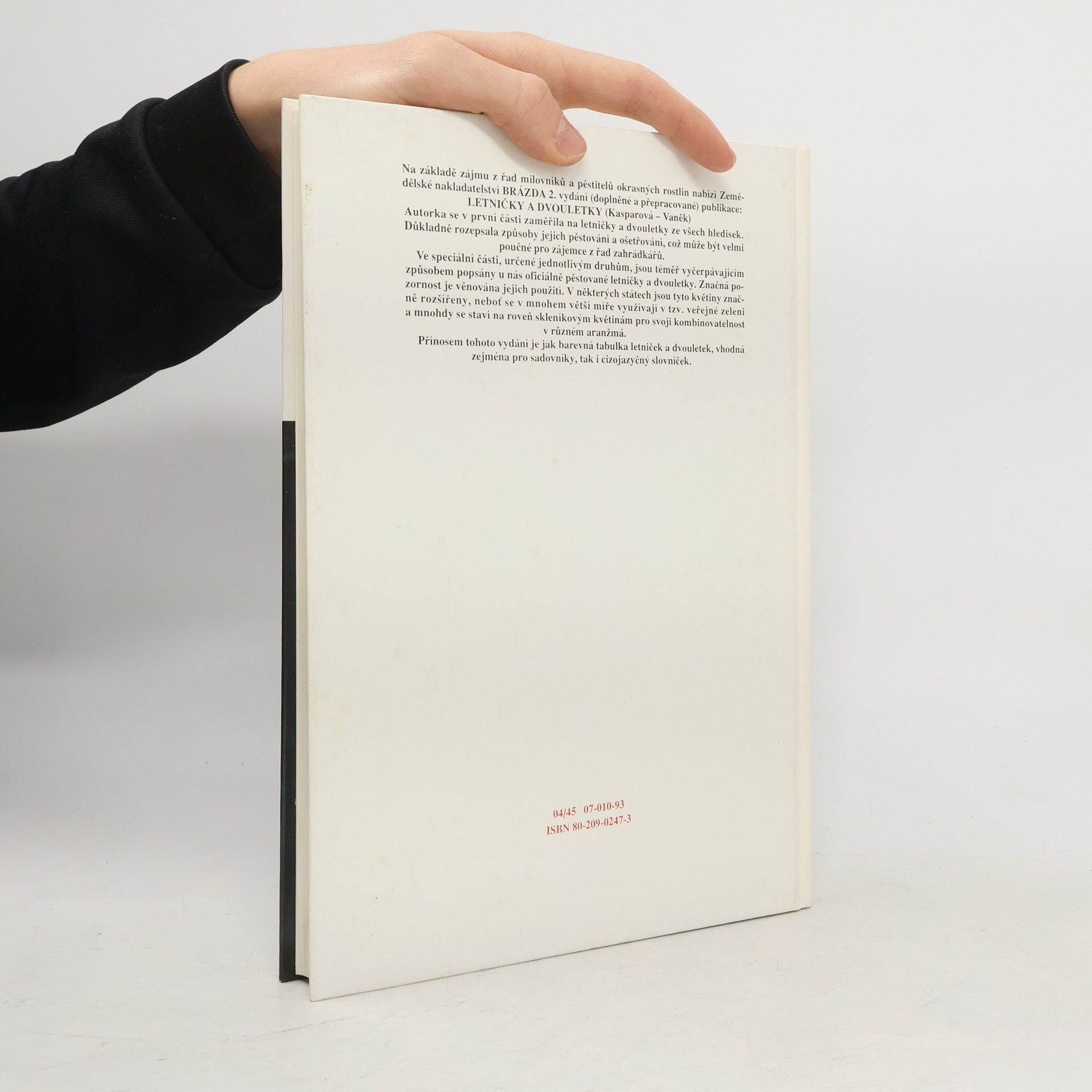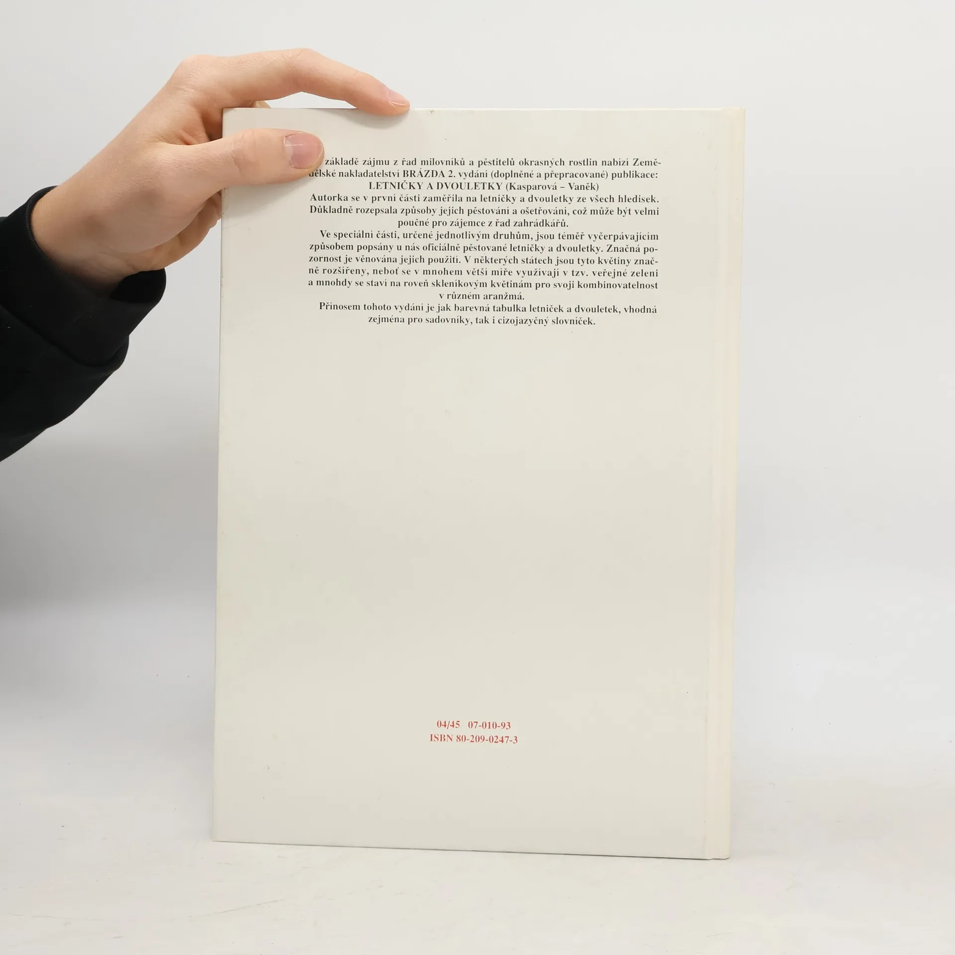 Charakteristika letniček a dvouletek. Množení, pěstování, využití letniček a dvouletek. Těžištěm publikace je 124 barevných fotografií druhů a kultivarů letniček a dvouletek. U každého druhu je uveden krátký popis rostliny, její použití, pěstování a nejdůležitější kultivary. Úvodní část je věnována především využití letniček a dvouletek v různých typech výsadeb i jako ozdoby interiérů. Publikace je určena všem milovníkům a pěstitelům okrasných rostlin.... celý text