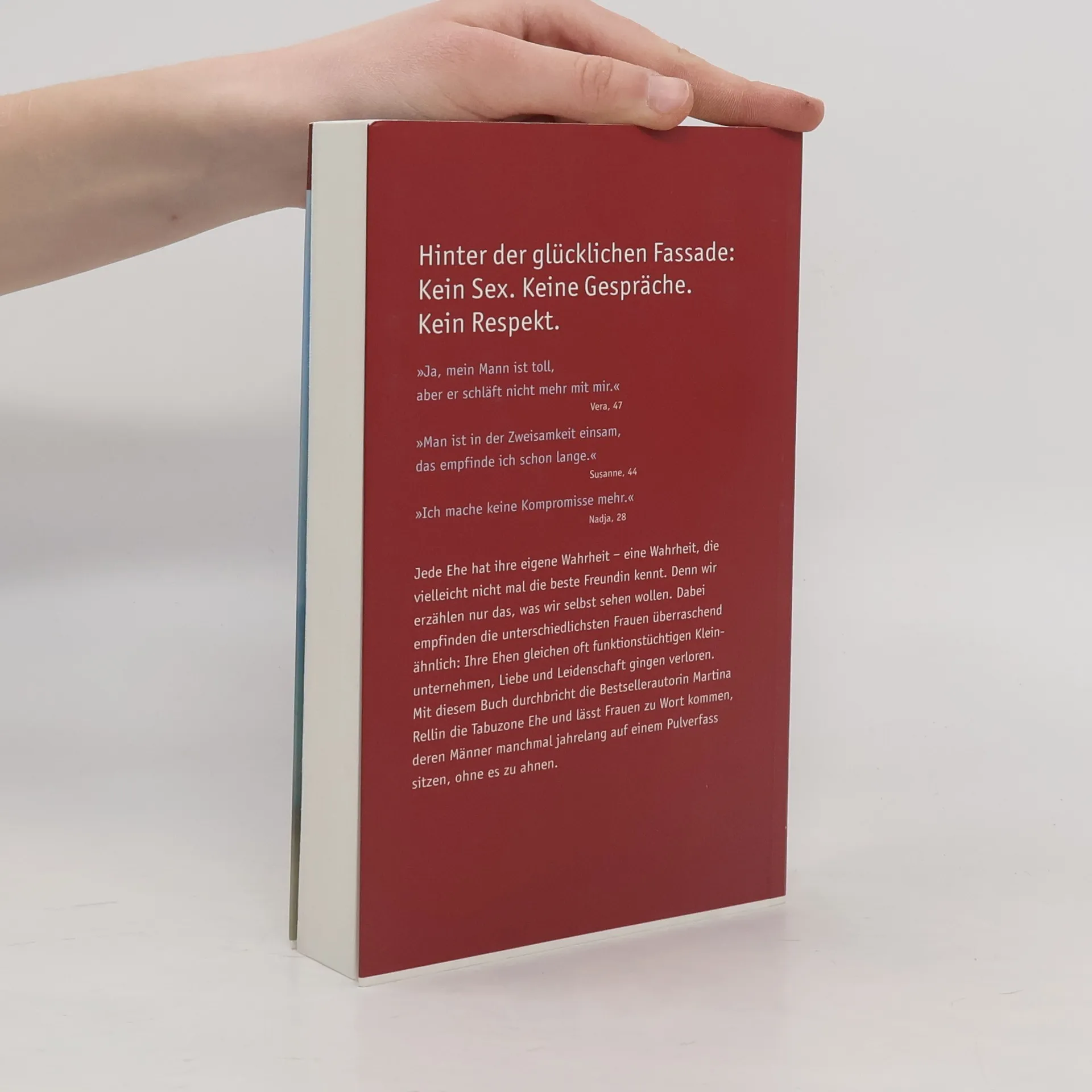 Hinter der glücklichen Fassade: Kein Sex. Keine Gespräche. Kein Respekt. Jede Ehe hat ihre eigene Wahrheit – eine Wahrheit, die oft nicht mal die beste Freundin kennt. Weil wir nur das erzählen, was wir selbst sehen wollen. Weil wir Angst haben vor dem Urteil der anderen. Mit diesem Buch durchbricht Martina Rellin die Tabuzone Ehe und lässt Frauen zu Wort kommen, deren Männer auf einem Pulverfass sitzen, ohne es zu ahnen. Die Wahrheit einer Ehe ist meist von außen nicht sichtbar. Und es gibt gute Gründe dafür, sich selbst und den Partner vor den kritischen Blicken der anderen zu schützen. Allzu oft allerdings wird die Ehe dabei zur Tabuzone erklärt, die niemand durchbrechen darf. Niemand darf wissen, dass der Mann nett, aber im Bett eine Niete ist. Dass der eine krankhaft eifersüchtig ist, der andere nur mit seiner Mutter redet. Ob großes Geheimnis, kleine Verletzungen oder Dauerkampf – in diesem Buch brechen Frauen ihr Schweigen. Durch die Offenheit der Geschichten wird klar: Die anderen sind auch nicht glücklicher. Das macht Mut und hilft, die eigenen Ansprüche zu überdenken. Vielleicht sogar, den Traum von der perfekten Ehe aufzugeben. Denn für etwas Neues ist es nie zu spät …