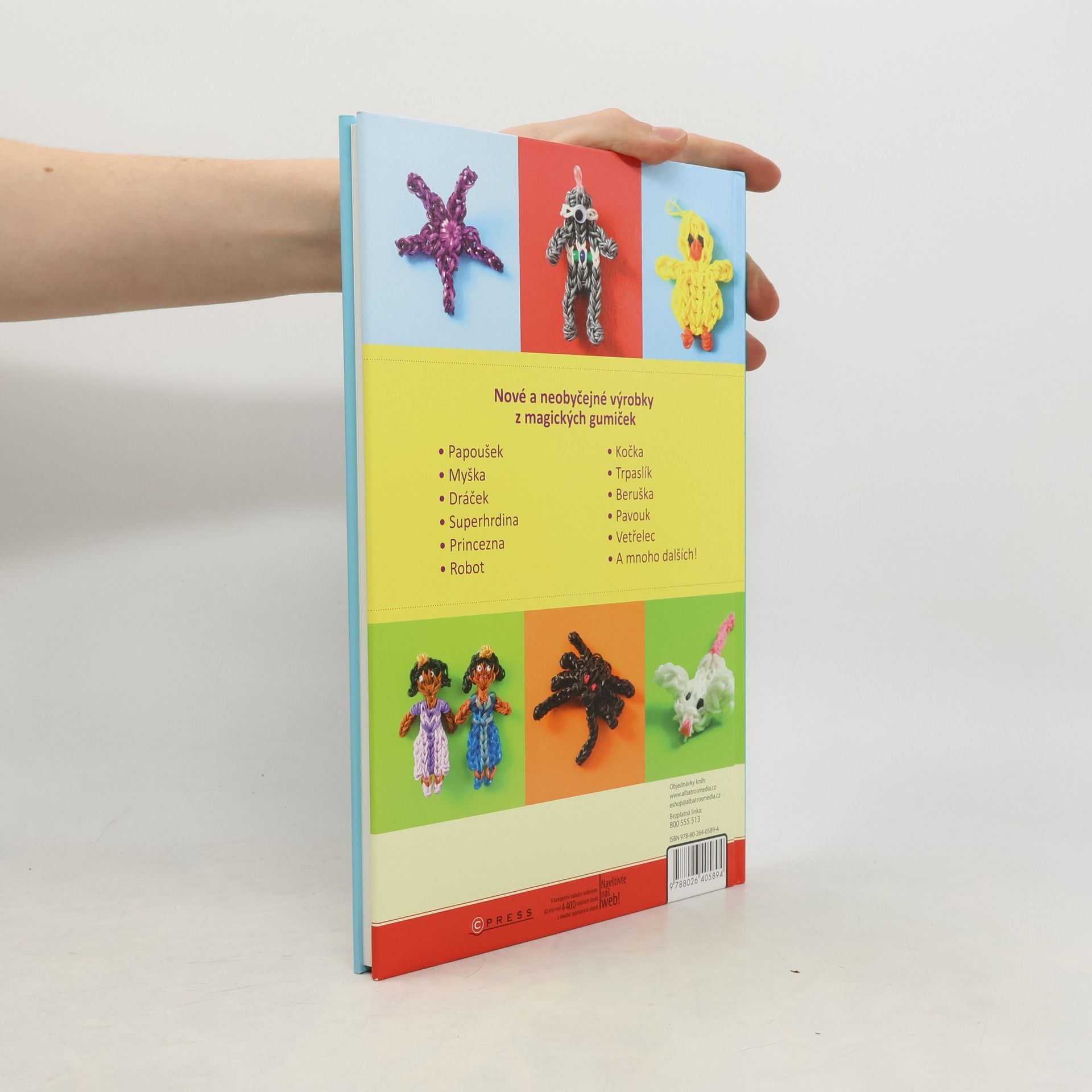 Zvířátka a mýtická stvoření. Holky i kluci gumičky prostě milují! Nosit náramek z barevných gumiček je velká móda. Ovšem nyní můžeš uplést daleko více! Přinášíme 25 zcela nových a neobyčejných nápadů, díky kterým si užiješ zábavu a ještě se blýskneš před kamarády. Srozumitelné návody doprovázené názornými fotografiemi ti umožní vyrobit roztomilá zvířátka a fantastické postavičky, které využiješ třeba jako přívěsky na šperky či batoh nebo jako dárky a talismany. • Papoušek • Kočka • Myška • Trpaslík • Dráček • Beruška • Superhrdina • Pavouk • Princezna • Vetřelec • Robot • A mnoho dalších!