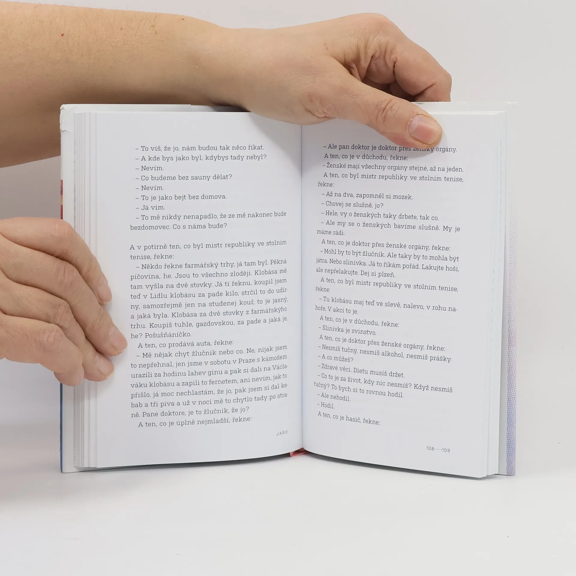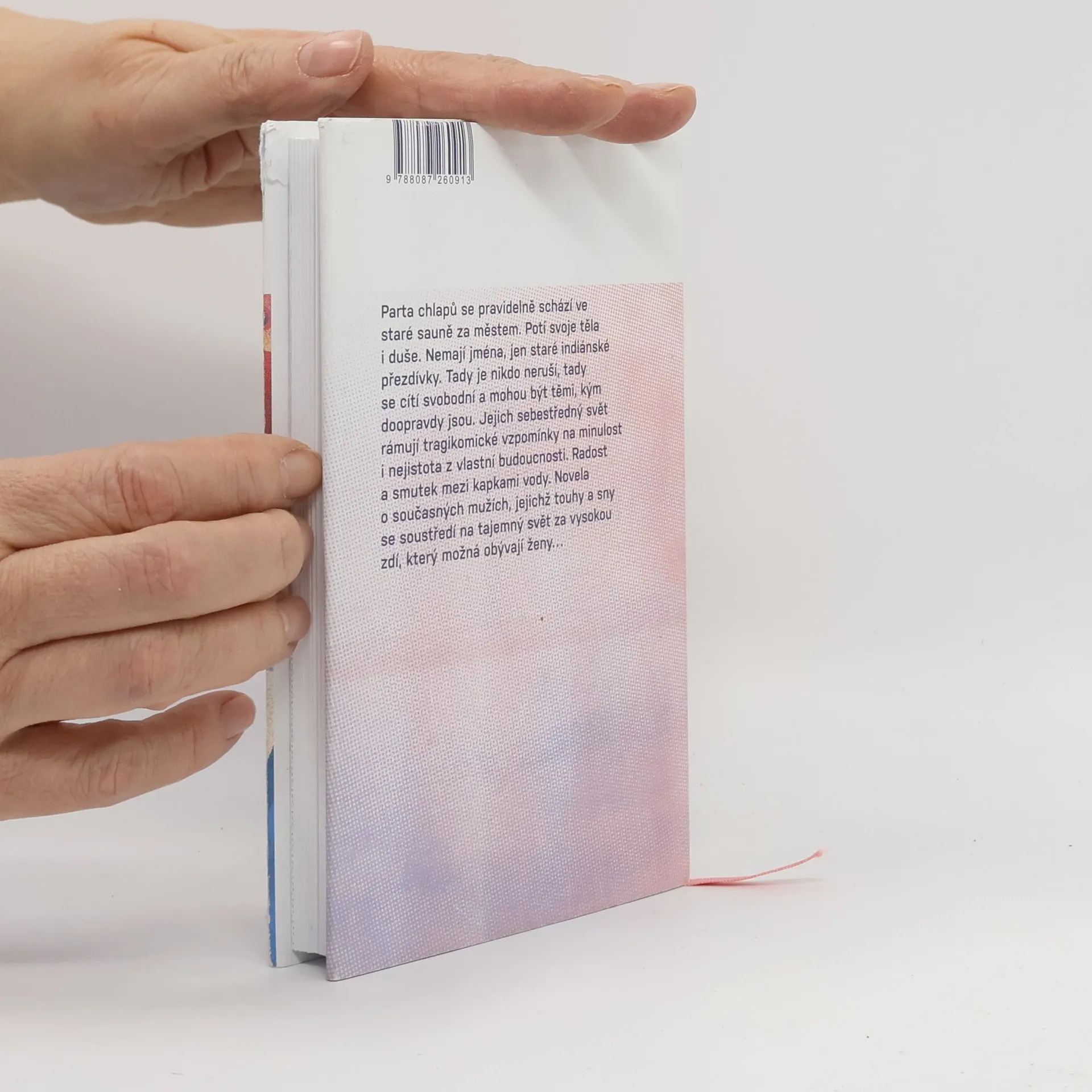 Parta chlapů se pravidelně schází ve staré sauně za městem. Potí svoje těla i duše. Nemají jména, jen staré indiánské přezdívky. Tady je nikdo neruší, tady se cítí svobodní a mohou být těmi, kým doopravdy jsou. Jejich sebestředný svět rámují tragikomické vzpomínky na minulost i nejistota z vlastní budoucnosti. Radost a smutek mezi kapkami vody. Novela o současných mužích, jejichž touhy a sny se soustředí na tajemný svět za vysokou zdí, který možná obývají ženy…