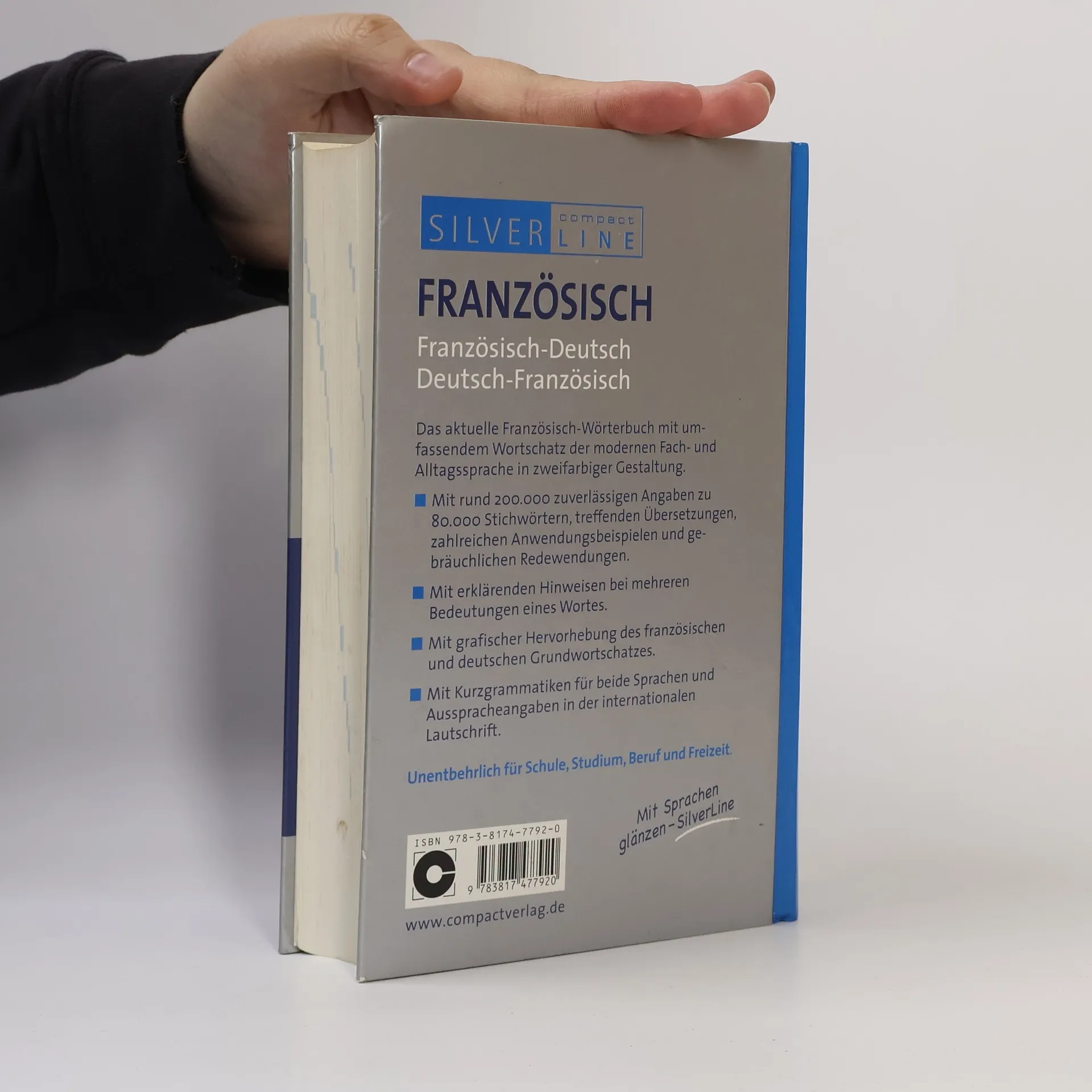 Das Große Wörterbuch Französisch aus der Compact-Reihe SilverLine beinhaltet umfassenden Wortschatz aus allen Lebensbereichen und deckt dabei allgemeinsprachliches Vokabular, aktuelle Umgangssprache sowie Fachbegriffe aus Politik, Wirtschaft, Technik, etc. ab. Neben dem Wörterbuchteil beinhaltet das Werk zahlreiche Hilfen für das korrekte Übersetzen in beide Sprachen. Rund 200.000 zuverlässige Angaben zu 80.000 Stichwörter; zahlreiche Anwendungsbeispiele, Bedeutungsdifferenzierungen und gebräuchliche Redewendungen; internationale Lautschrift bei allen französischen und deutschen Stichwörtern; grafische Hervorhebung des französischen und deutschen Grundwortschatzes; französische und deutsche Kurzgrammatik; bidirektionaler Aufbau, d. h. sowohl für deutsch- als auch für französischsprachige Nutzer konzipiert - blaue Stichwörter zur schnellen Orientierung