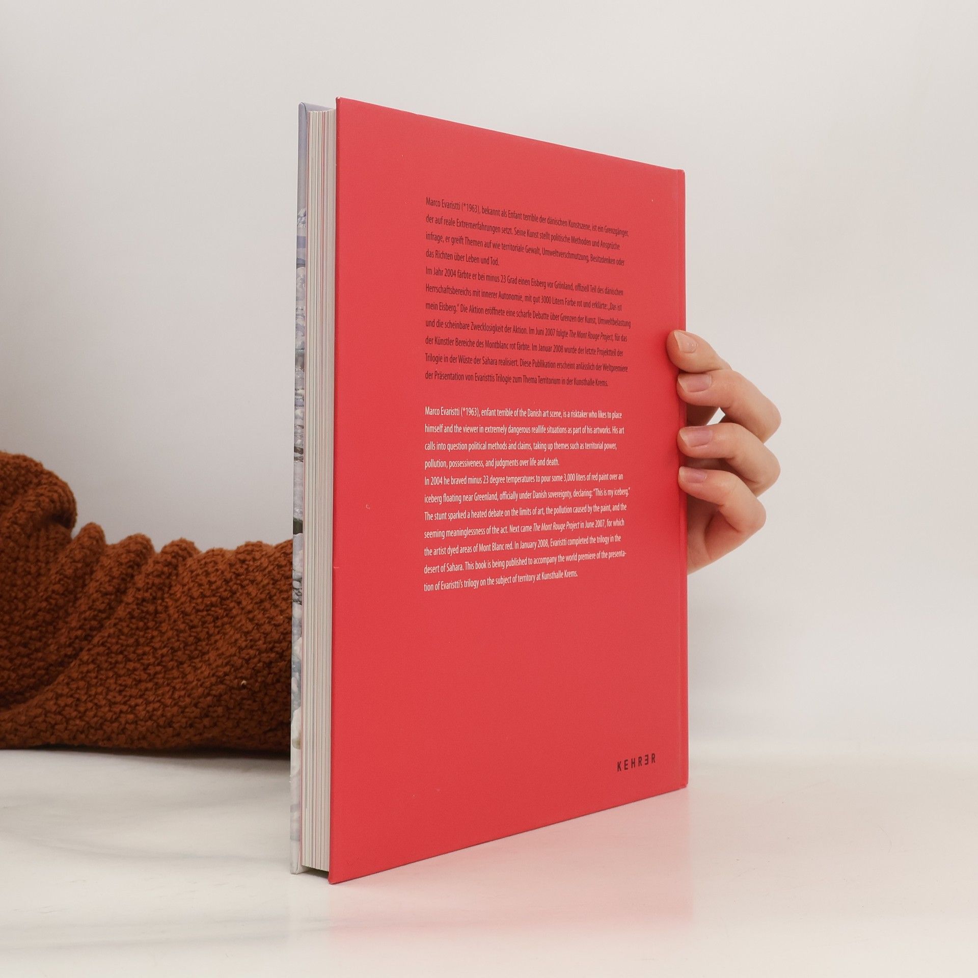 Marco Evaristti (*1963), bekannt als Enfant terrible der dänischen Kunstszene, ist ein Grenzgänger, der auf reale Extremerfahrungen setzt. Seine Kunst stellt politische Methoden und Ansprüche in Frage, er greift Themen auf wie territoriale Gewalt, Umweltverschmutzung, Besitzdenken oder das Richten über Leben und Tod. Im Jahr 2004 färbte er bei minus 23 Grad einen Eisberg vor Grönland, offiziell Teil des dänischen Herrschaftsbereichs mit innerer Autonomie, mit gut 3000 Liter Farbe rot und erklärte: 'Das ist mein Eisberg.' Die Aktion eröffnete eine scharfe Debatte über Grenzen der Kunst, Umweltbelastung und die scheinbare Zwecklosigkeit der Aktion. Im Juni 2007 folgte The Mont Rouge Project, für das der Künstler Bereiche des Mont Blanc rot färbte und zur Jahreswende 2007/08 wird der dritte Projektteil in der Atacamawüste in Chile realisiert. Diese Publikation erscheint anlässlich der Weltpremiere der Präsentation von Evaristtis Trilogie zum Thema Territorium in der Kunsthalle Krems.