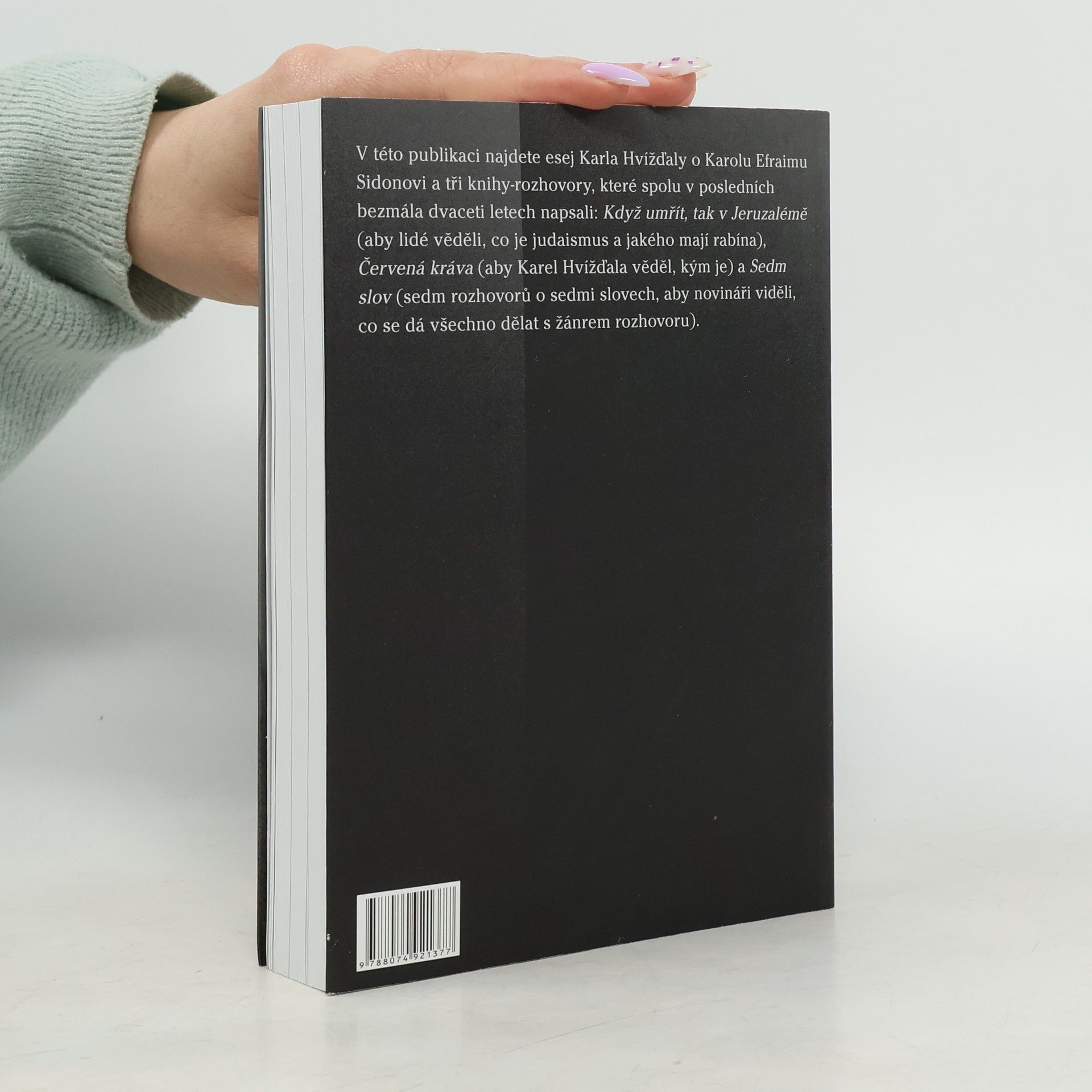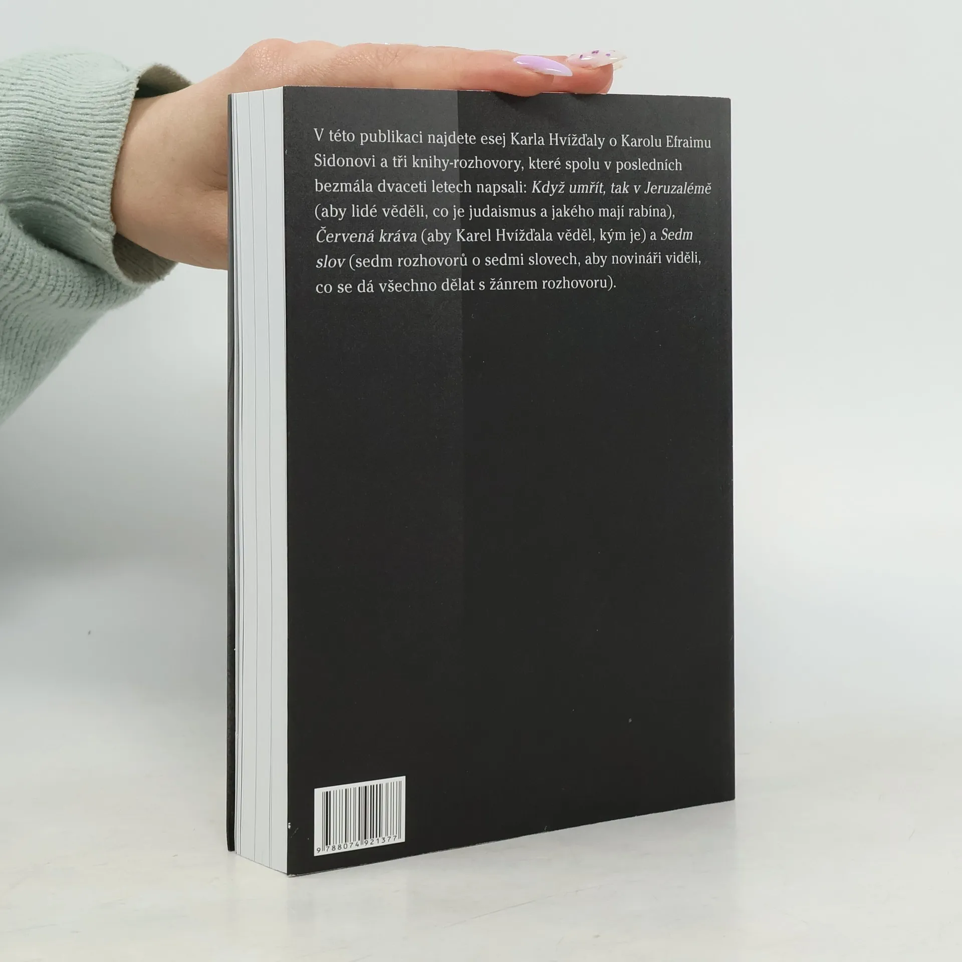 V této publikaci najdete esej Karla Hvížďaly o Karolu Efraimu Sidonovi a tři knihy - rozhovory, které spolu v posledních bezmála dvaceti letech napsali: Když umřít, tak v Jeruzalémě (aby lidé věděli, co je judaismus a jakého mají v Praze rabína), Červená kráva (aby Karel Hvížďala věděl, kým je) a Sedm slov (sedm rozhovorů o sedmi slovech, aby novináři viděli, co se dá všechno dělat s žánrem rozhovoru).