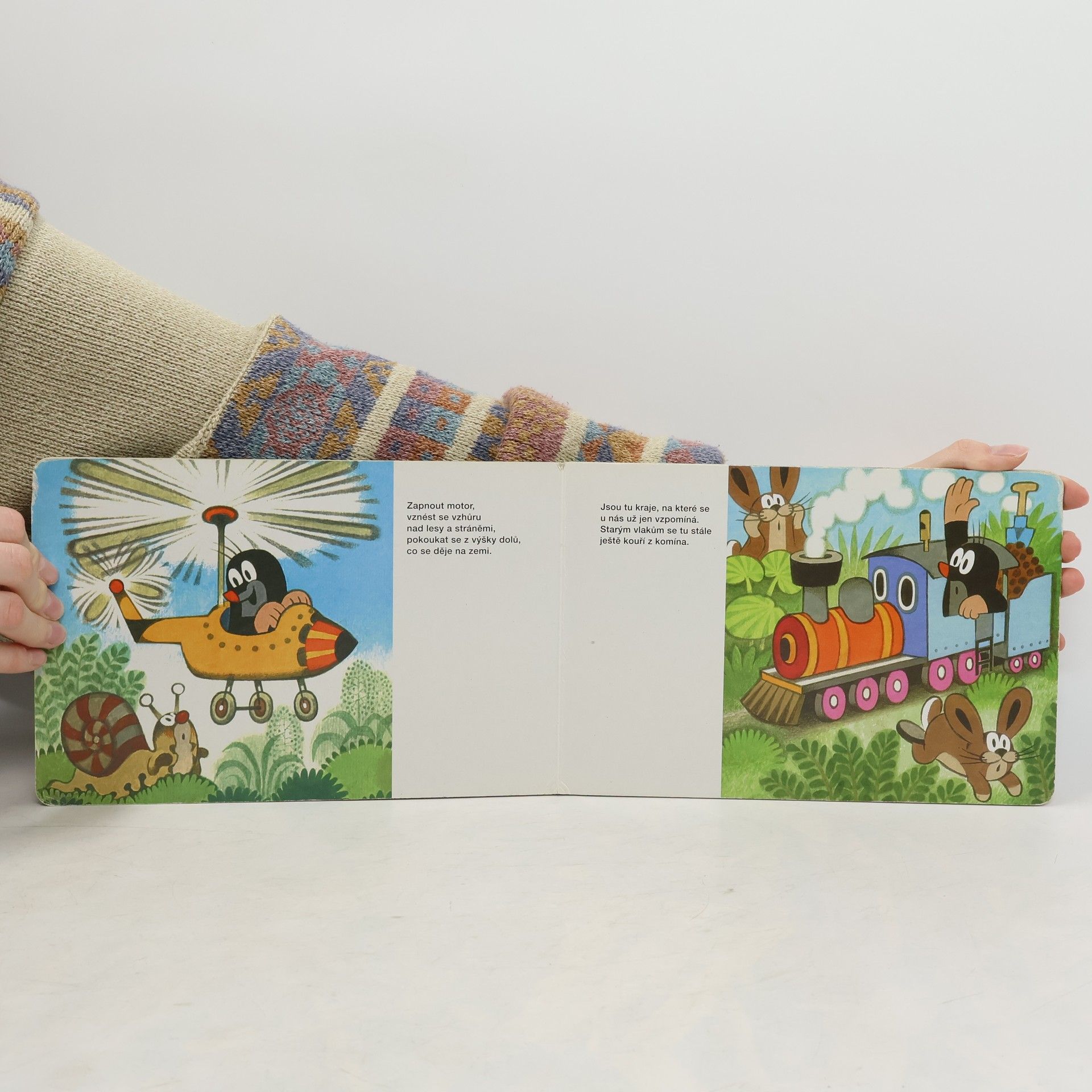 Krátká říkadla o cestování malého Krtečka - lodí a motorovým člunem po vodě, vrtulníkem a letadlem ve vzduchu, vlakem, autem a na motocyklu do přírody, ale třeba i na sněžném skútru a v ponorce.