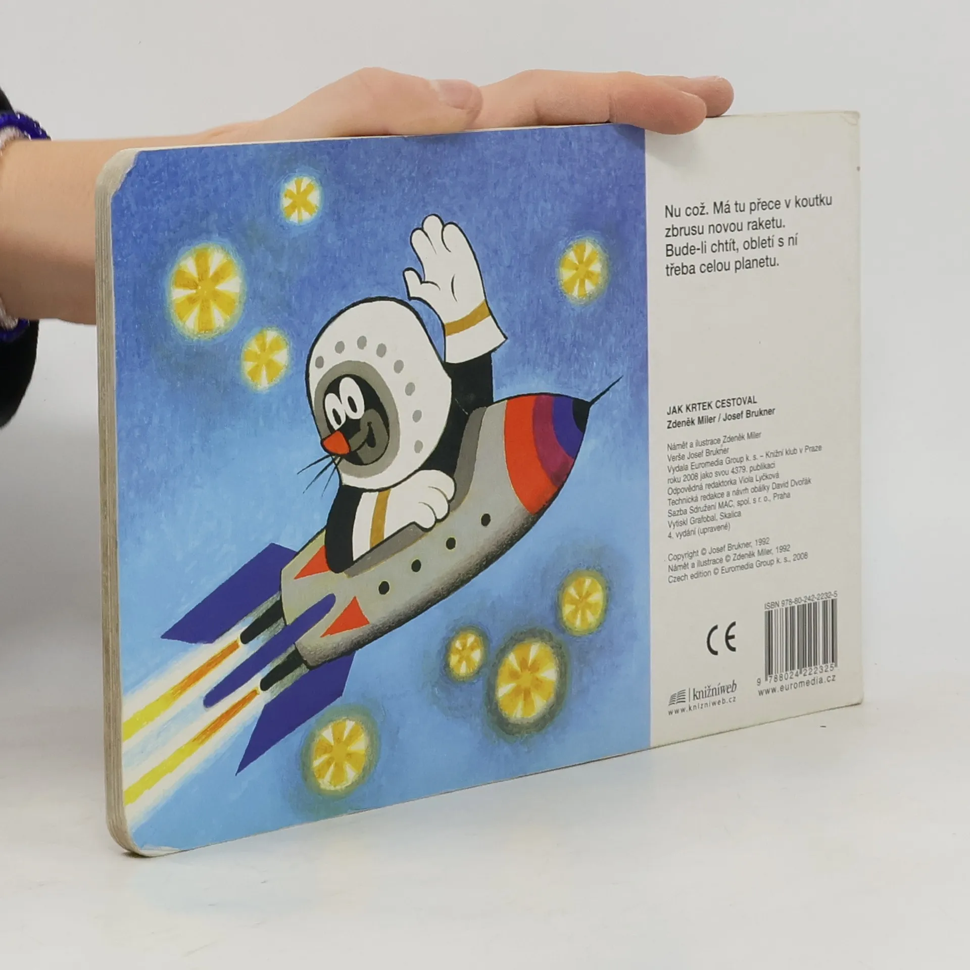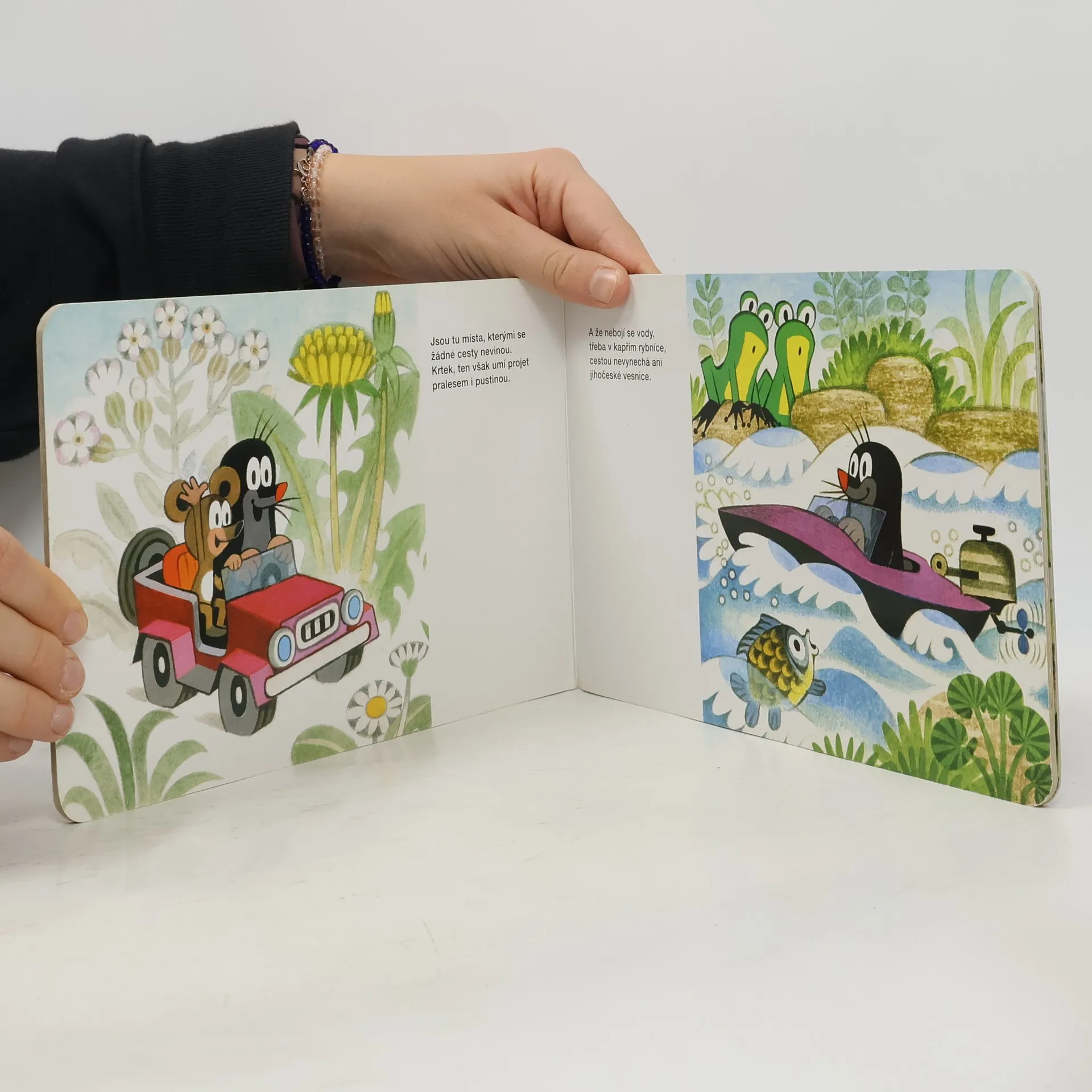 Krátká říkadla o cestování malého Krtečka - lodí a motorovým člunem po vodě, vrtulníkem a letadlem ve vzduchu, vlakem, autem a na motocyklu do přírody, ale třeba i na sněžném skútru a v ponorce.