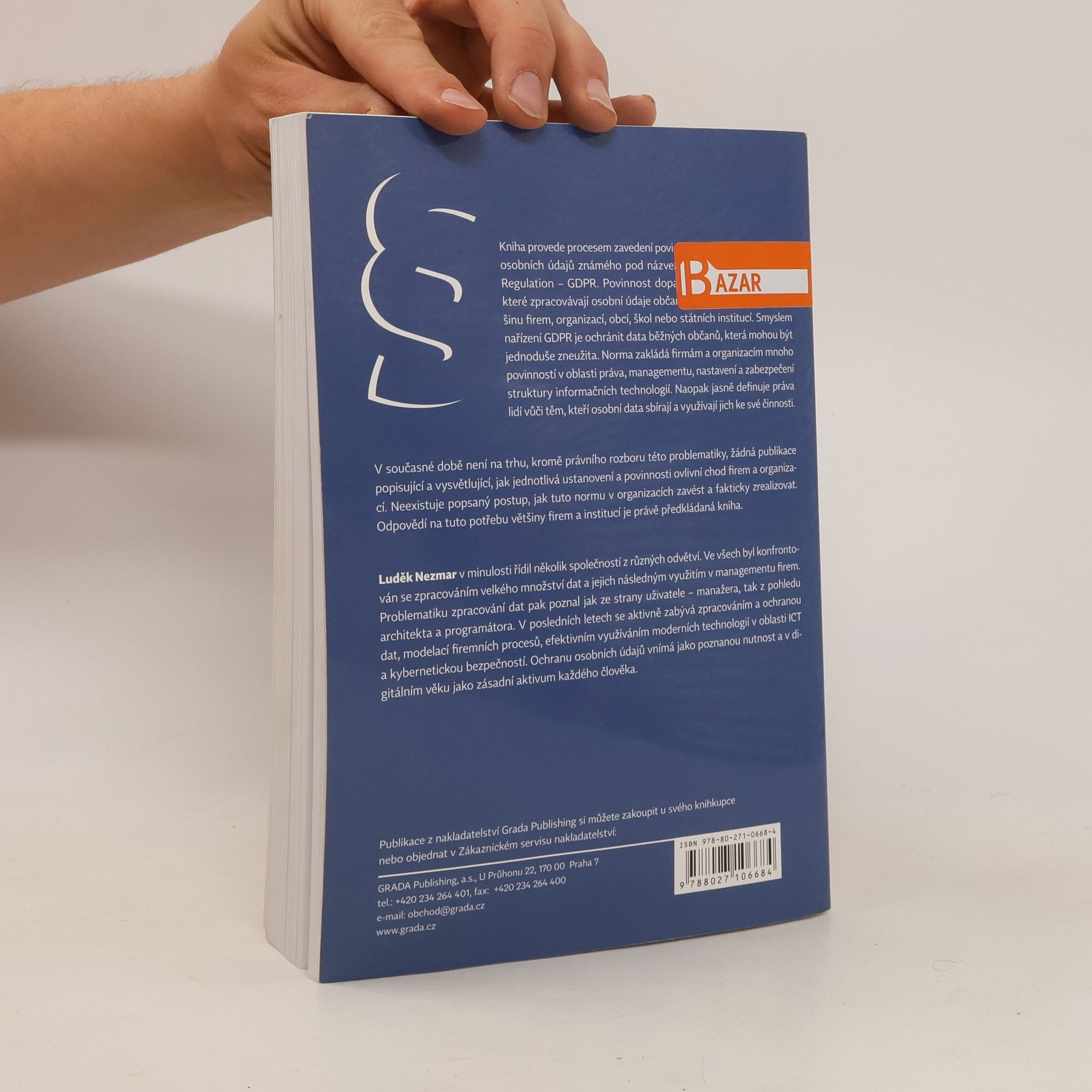 Jediná kniha o GDPR na trhu, která vysvětluje, jak jednotlivá ustanovení a povinnosti plynoucí z nového ustanovení ovlivní chod firem a organizací, a není jenom právním rozborem. Kniha provede procesem zavedení povinného nařízení EU o ochraně osobních údajů známého pod názvem GDPR - General Data Protection Regulation. Povinnost dopadne na všechny subjekty, které zpracovávají osobní údaje občanů EU - tedy na valnou většinu firem, organizací, obcí, škol nebo státních institucí. Smyslem nařízení GDPR je ochránit data běžných občanů, která mohou být jednoduše zneužita. Norma zakládá firmám a organizacím mnoho povinností v oblasti práva, managementu, nastavení a zabezpečení struktury informačních technologií. Naopak jasně definuje práva lidí vůči těm, kteří osobní data sbírají a využívají jich ke své činnosti. V současné době není na trhu, kromě právního rozboru této problematiky, žádná publikace popisující a vysvětlující, jak jednotlivá ustanovení a povinnosti ovlivní chod firem a organizací. Dosud neexistoval popsaný postup, jak tuto normu v organizacích zavést a fakticky zrealizovat. Odpovědí na tuto potřebu většiny firem a institucí je právě předkládaná kniha.