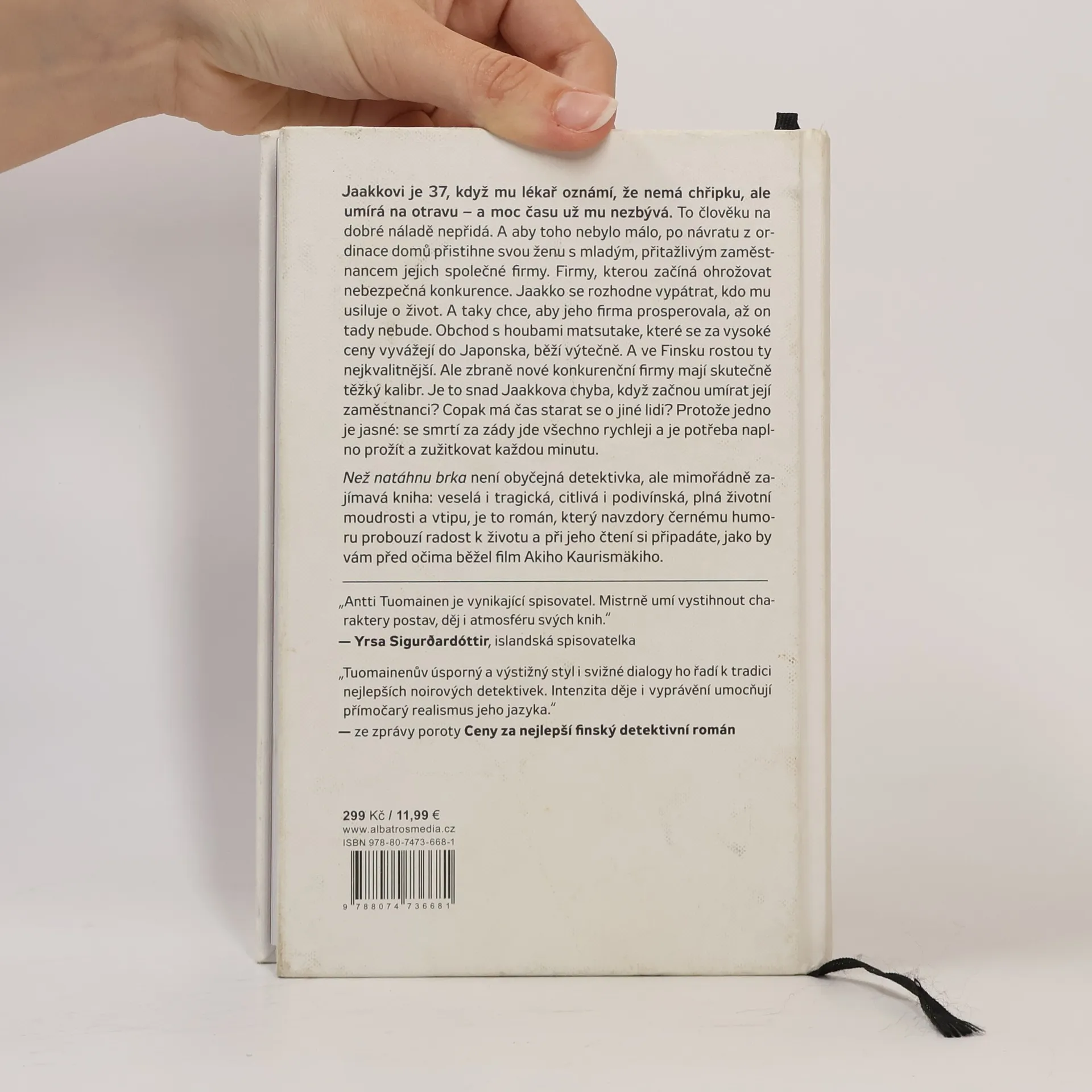 Jaakkovi je 37, když mu lékař oznámí, že nemá chřipku, ale umírá na otravu – a nemá už moc času. To člověku na dobré náladě nepřidá. A aby toho nebylo málo, když se z ordinace vrátí domů, přistihne svou ženu, jak si užívá s Petrim, mladým, přitažlivým zaměstnancem jejich společné firmy. Firmy, kterou začíná ohrožovat nebezpečná konkurence. Jaakko se rozhodne vypátrat toho, kdo mu usiluje o život. A taky chce, aby jeho firma prosperovala, až on tady nebude. Obchod s houbami matsutake, které se za vysoké ceny vyvážejí do Japonska, běží výtečně. A ve Finsku rostou ty nejkvalitnější. Ale zbraně nové konkurenční firmy mají skutečně tvrdý kalibr. Je to snad Jaakkova chyba, když začnou umírat její zaměstnanci? Ale copak má čas starat se o jiné lidi? Protože jedno je jasné: se smrtí za zády jde všechno rychleji a je potřeba užít si i využít každou minutu. „Než natáhnu brka“ není obyčejná detektivka, ale mimořádně zajímavá kniha: veselá i tragická, citlivá i podivínská, plná životní moudrosti a vtipu, je to román, který navzdory černému humoru probouzí radost k životu a při jeho čtení si připadáte, jako by vám před očima běžel film Akiho Kaurismäkiho.