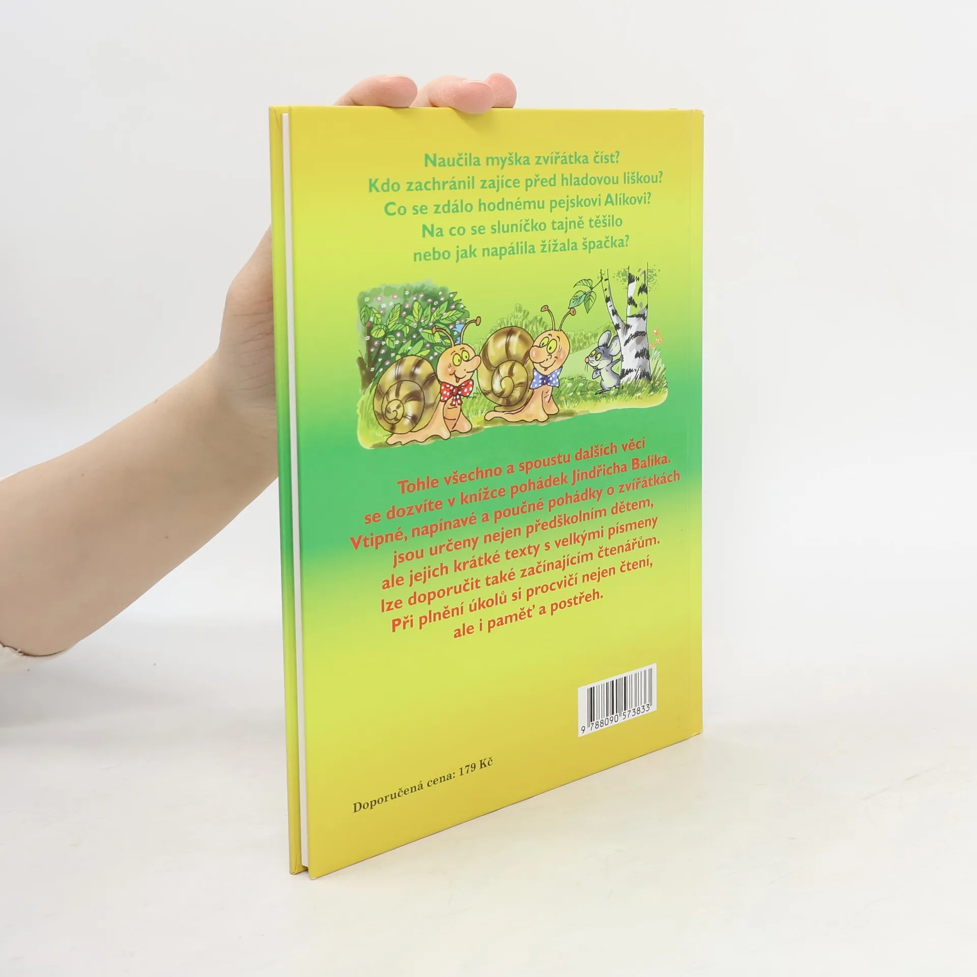 Naučila myška zvířátka číst? Kdo zachránil zajíce před hladovou liškou? Co se zdála hodnému pejskovi Alíkovi? Na co se sluníčko tajně těšila nebo jako napálila žížala špačka? Tohle všechno a spoustu dalších věcí se dozvíte v knížce pohádek Jindřicha Balíka. Vtipné, napínavé a poučné pohádky o zvířátkách jsou určeny nejen předškolním dětem, ale jejich krátké texty s velkými písmeny lze doporučit také začínajícím čtenářům. Při plnění úkolů si procvičí nejen čtení, ale i paměť a postřeh.