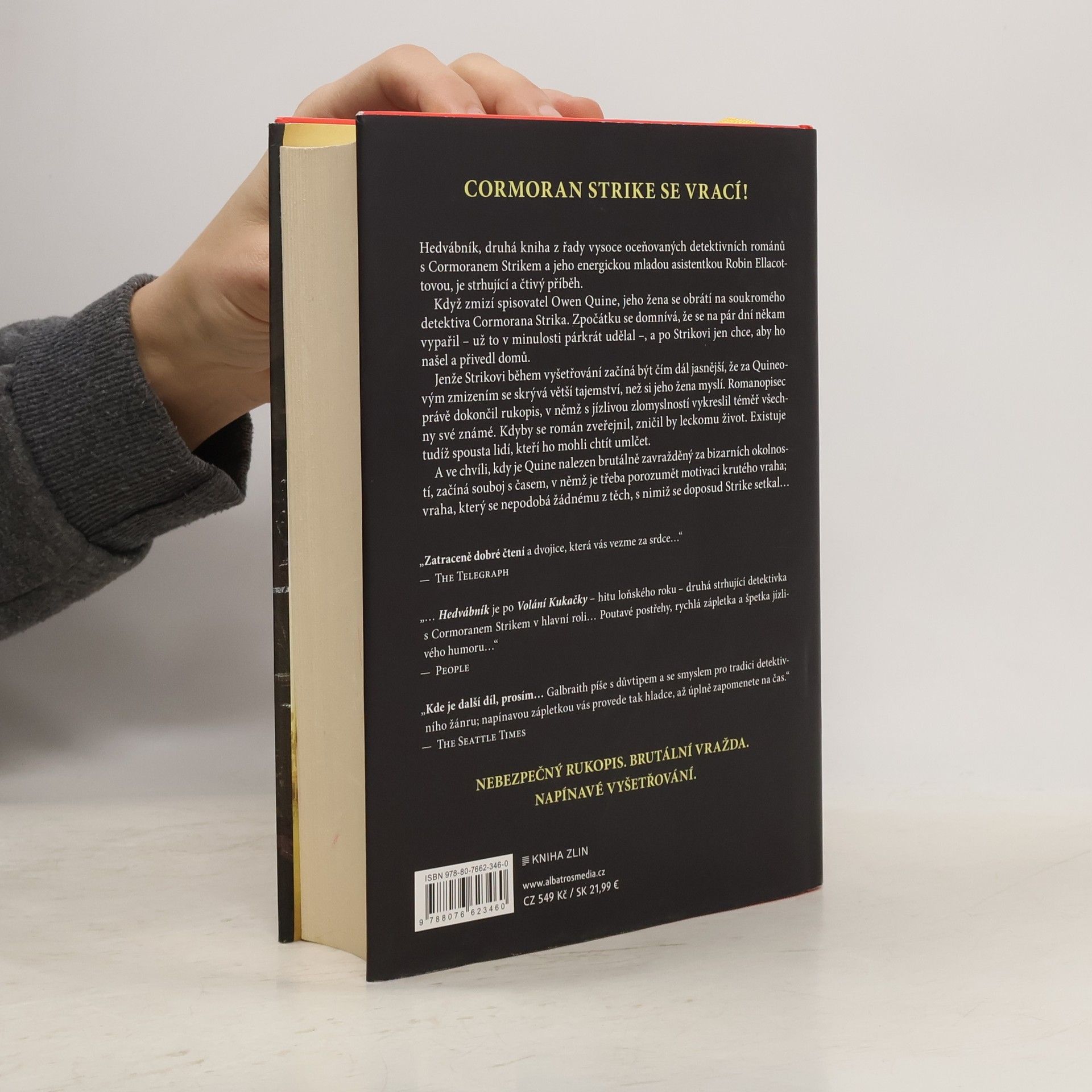 Kam se ztratil autor rukopisu, který nikdo nesmí číst a každý se ho bojí?Hedvábník, druhá kniha z řady vysoce oceňovaných detektivních románů s Cormoranem Strikem a jeho energickou mladou asistentkou Robin Ellacottovou je strhující a čtivý příběh.Když zmizí spisovatel Owen Quine, jeho žena se obrátí na soukromého detektiva Cormorana Strika. Zpočátku se domnívá, že se na pár dní někam vypařil – už to v minulosti párkrát udělal –, a po Strikovi jen chce, aby ho našel a přivedl domů.Jenže Strikovi během vyšetřování začíná být čím dál jasnější, že za Quineovým zmizením se skrývá větší tajemství, než si jeho žena myslí. Romanopisec právě dokončil rukopis, v němž s jízlivou zlomyslností vykreslil téměř všechny své známé. Kdyby se román zveřejnil, zničil by leckomu život. Existuje tudíž spousta lidí, kteří ho mohli chtít umlčet.A ve chvíli, kdy je Quine nalezen brutálně zavražděný za bizarních okolností, začíná souboj s časem, v němž je třeba porozumět motivaci krutého vraha; vraha, který se nepodobá žádnému z těch, s nimiž se doposud Strike setkal…Nebezpečný rukopis. Brutální vražda. Napínavé vyšetřování.