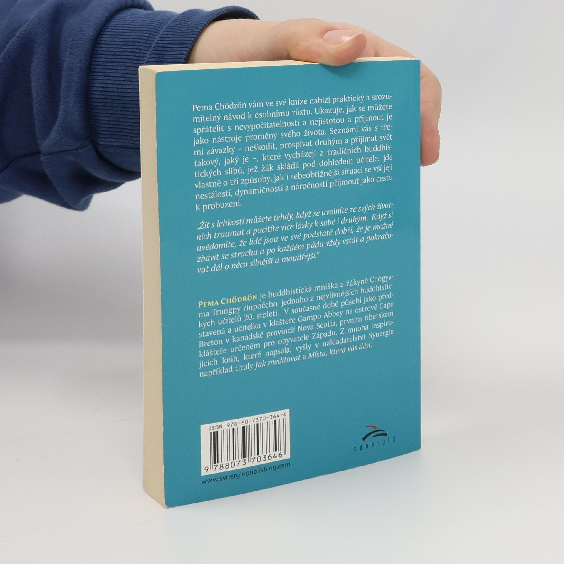 Pema Chödrön vám ve své knize nabízí prakticky´ a srozumitelný návod k osobnímu růstu. Ukazuje, jak se můžete spřátelit s nevypočitatelností a nejistotou a přijmout je jako nástroje proměny svého života. Seznámí vás se třemi závazky – neškodit, prospívat druhým a přijímat svět takový, jaký je –, které vycházejí z tradičních buddhistických slibů, jež žák skládá pod dohledem učitele. Jde vlastně o tři způsoby, jak i sebeobtížnější situaci se vší její nestálostí, dynamičností a náročností přijmout jako cestu k probuzení. „Žít s lehkostí můžete tehdy, když se uvolníte ze svých životních traumat a pocítíte více lásky k sobě i druhým. Když si uvědomíte, že lidé jsou ve své podstatě dobří, že je možné zbavit se strachu a po každém pádu vždy vstát a pokračovat dál o něco silnější a moudřejší.“