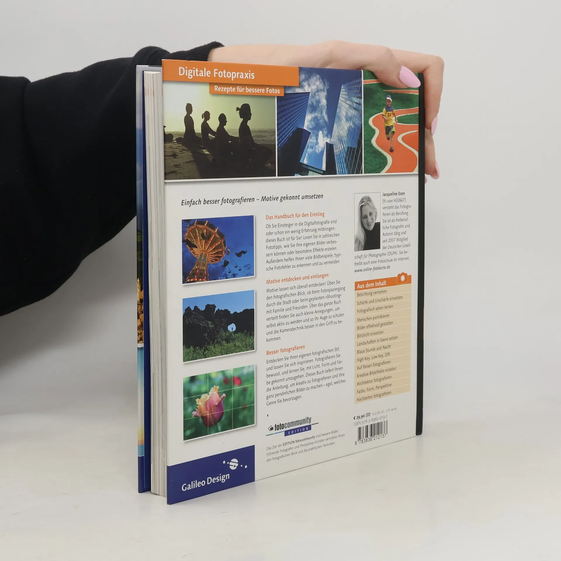 Sie wollen mehr als einfach nur knipsen? Mit diesem Buch lösen Sie Ihre Fotoprobleme! Es bietet Ihnen kurze, praktische Anleitungen, um die digitale Fotografie in den Griff zu bekommen und liefert Ihnen Anregungen für bessere Bilder. Die Fotografin Jacqueline Esen gibt Ihnen wertvolle Tipps, mit denen Sie schwierige Aufnahmesituationen sicher bewältigen und die Ihnen helfen, den Blick für das Motiv zu schärfen. Denn zu einem ansprechenden Foto gehört beides – eine attraktive Gestaltung und eine technisch saubere Umsetzung. Mit Hilfe von vielen Vergleichsbildern zeigt Ihnen die Autorin, wie Sie mit Schärfe, Licht, Blende und Brennweite kreativ werden können. Das Buch führt Sie dabei sicher von den Grundlagen der Bildgestaltung und der Fotografie bis zu fortgeschrittene Techniken, um Ihnen am Ende ausgefallene Fotoprojekte und Bildideen vorzustellen – lassen Sie sich inspirieren und entwickeln Sie eine eigene fotografische Handschrift! Aus dem Inhalt: Belichtung verstehen Schärfe und Unschärfe einsetzen Fotografisch sehen lernen Menschen porträtieren Bilder effektvoll gestalten Blitzlicht einsetzen Landschaften in Szene setzen Blaue Stunde und Nacht High Key, Low Key, DRI Auf Reisen fotografieren Kreative Bildeffekte erzielen Architektur fotografieren Farbe, Form, Perspektive Hochzeiten fotografieren