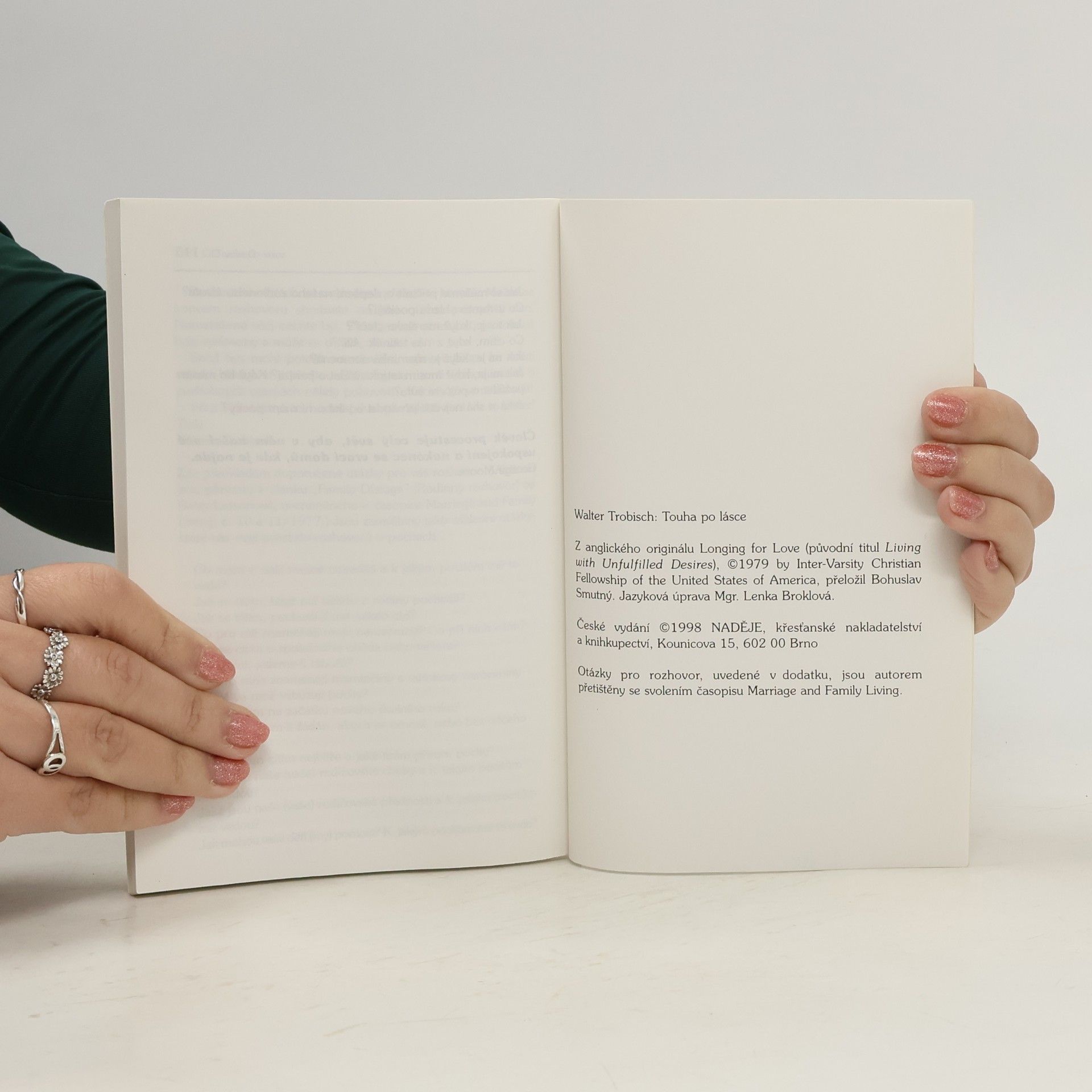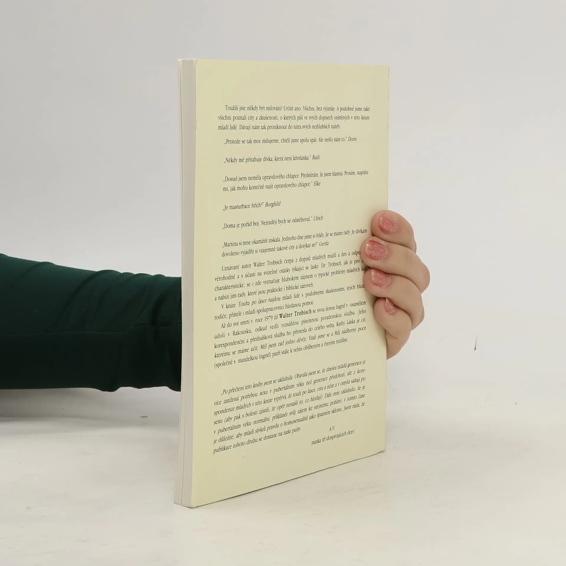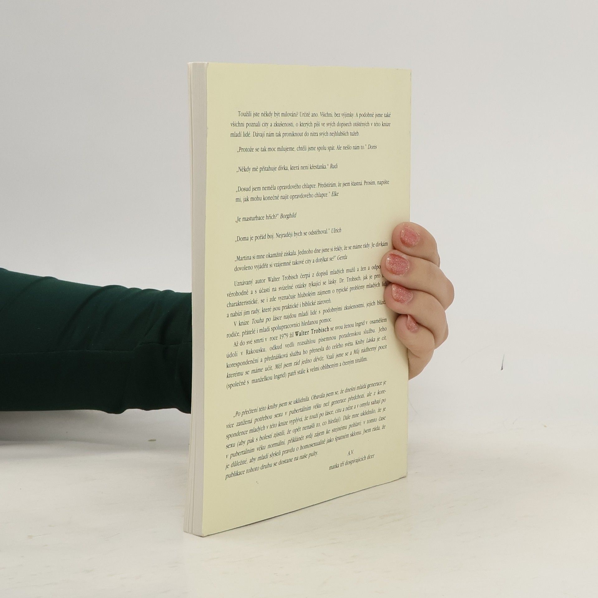 S hlubokým zájmem odpovídá W. Trobisch v dopisech mladým lidem a nabízí rady, praktické i biblické zároveň. Toužili jste někdy být milováni? Všichni bez výjimky. A podobně jsme také všichni poznali city a zkušenosti, o kterých píší ve svých dopisech otištěných v této knize mladí lidé. Dávají nám tak proniknout do nitra svých nejhlubších tužeb.