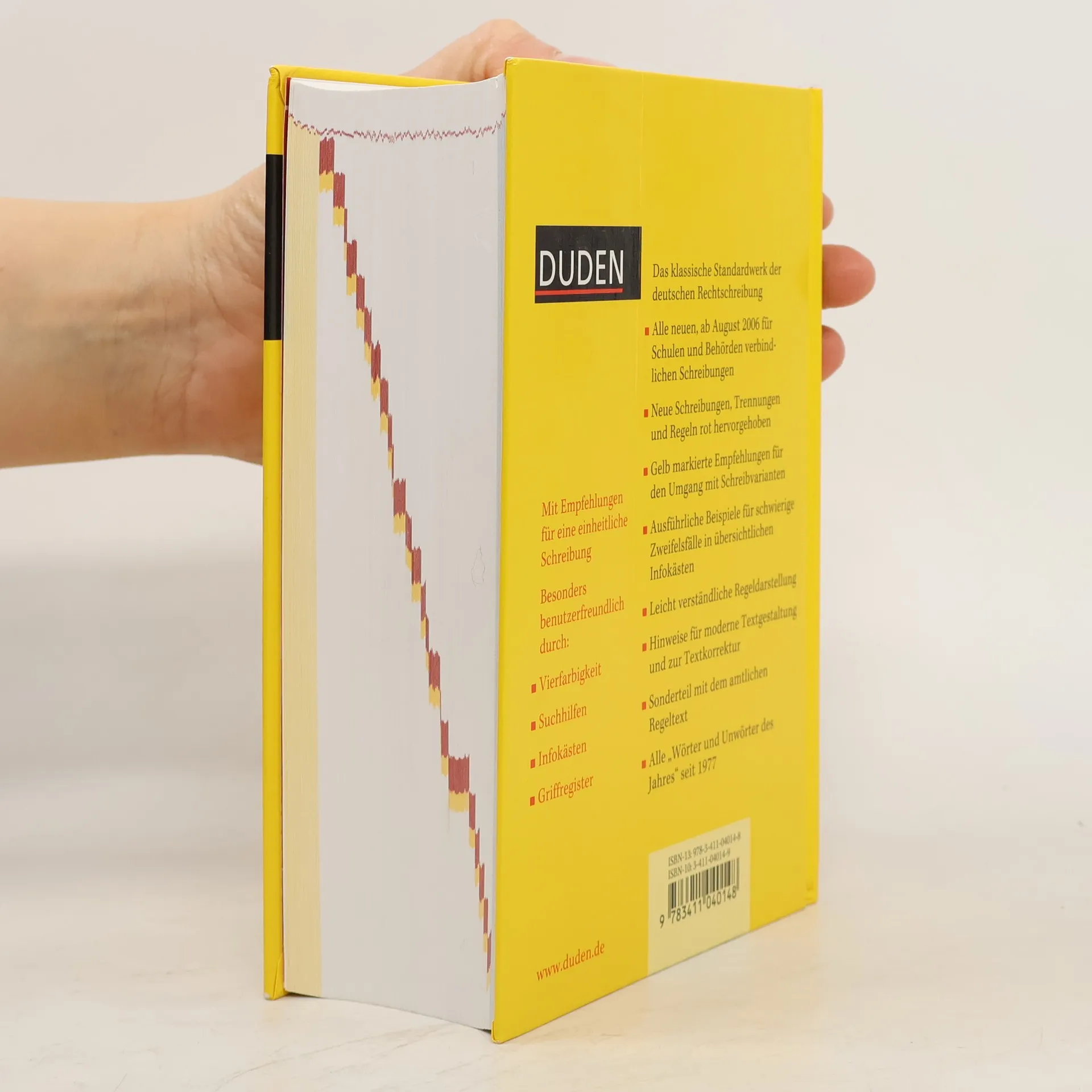 Das umfassende Standardwerk auf der Grundlage der neuen amtlichen Regeln. Rund 130.000 Stichwörter, davon 3.000 neue Wörter. Über 500.000 Beispiele, Bedeutungserklärungen und Angaben zu Worttrennung, Aussprache, Grammatik, Etymologie und Stil. In 300 übersichtlichen Infokästen werden schwierige Zweifelsfälle der deutschen Sprache anhand von Beispielen ausführlich erklärt. NEU: mit Dudenempfehlung bei mehreren zulässigen Schreibweisen. NEU: jetzt vierfarbig zur besseren Orientierung.