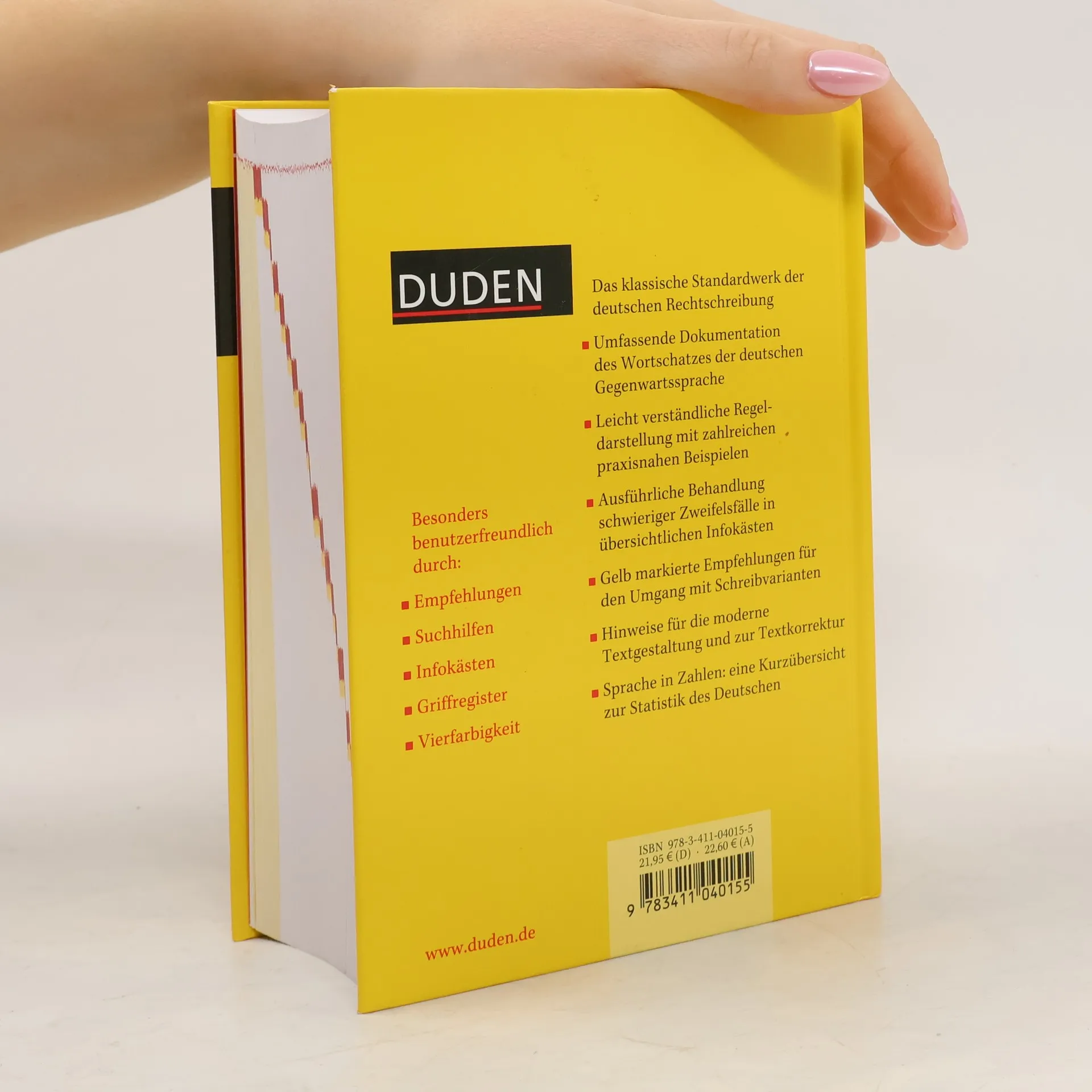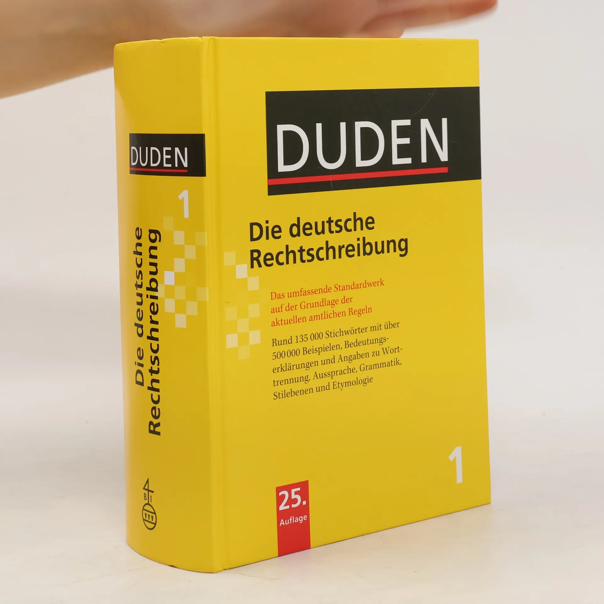Die 25. Auflage des umfassenden Standardwerks ist so zuverlässig wie immer und so umfangreich wie nie zuvor: Rund 135.000 Stichwörter, davon 5.000 neue Wörter, über 500.000 Beispiele, Bedeutungserklärungen und Angaben zu Worttrennung, Aussprache, Grammatik, Etymologie und Stil lassen keine Fragen offen. In 400 übersichtlichen Infokästen werden schwierige Zweifelsfälle anhand von Beispielen ausführlich erklärt. Bei mehreren zulässigen Schreibweisen helfen gelb markierte Dudenempfehlungen. Neu: der Sonderteil mit wissenswerten Informationen rund um den Wortschatz der deutschen Sprache.