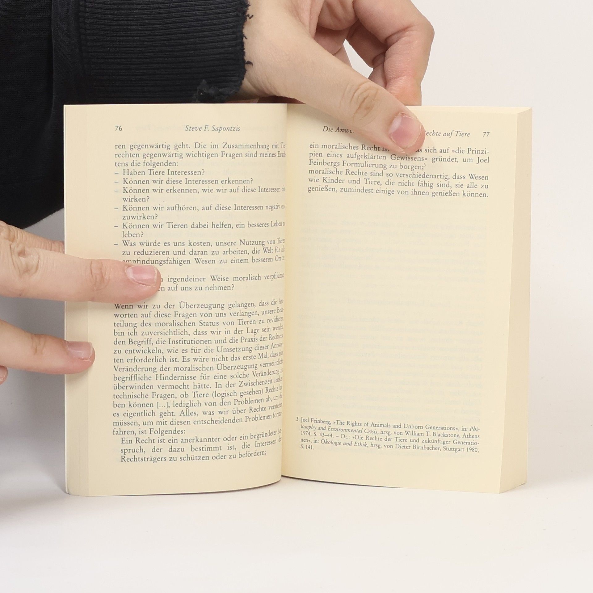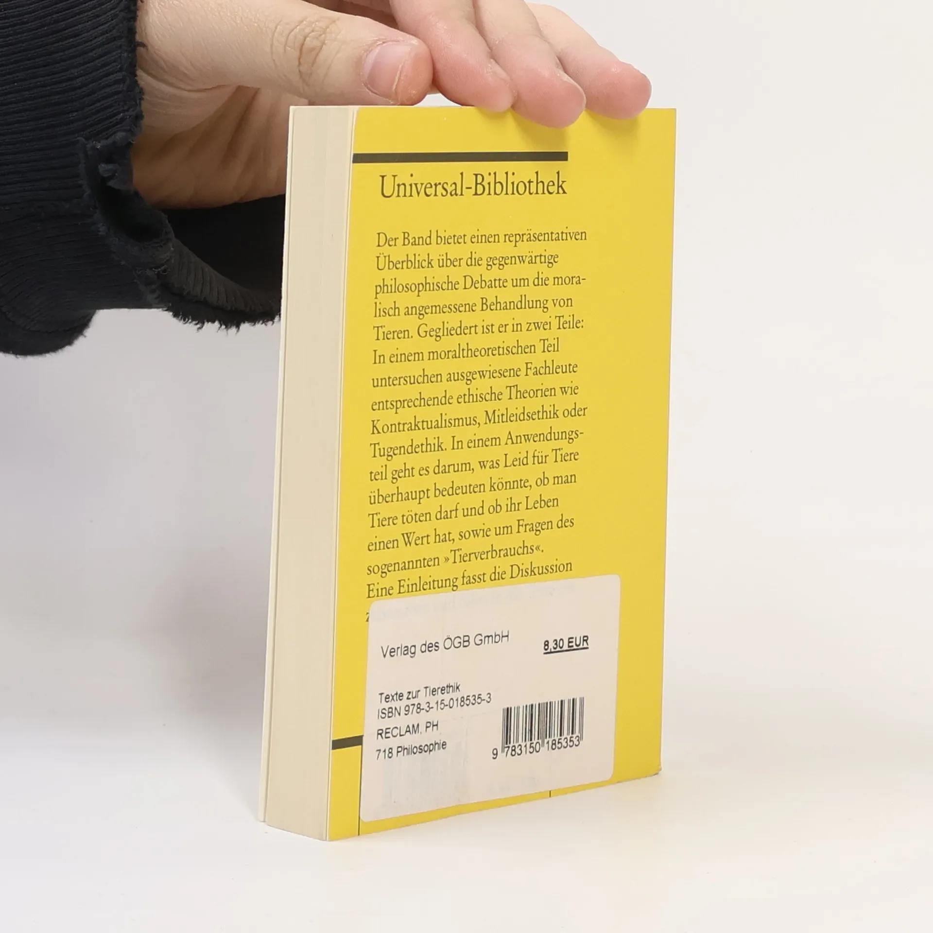 Anhand von Originaltexten (die zum großen Teil zum ersten Mal übersetzt wurden) wird ein Überblick über das heutige philosophische Nachdenken über die moralisch angemessene Behandlung von Tieren gegeben. Gegliedert ist er in zwei Teile: einen moraltheoretischen und einen Anwendungsteil, in dem unter anderem untersucht wird, was Leid für Tiere überhaupt bedeuten könnte, ob man Tiere töten darf und ob ihr Leben einen Wert hat; Thema ist auch die Problematik des sogenannten „Tierverbrauchs“, also der Nutzung von Tieren zum Zweck der Nahrungsgewinnung oder der Forschung.