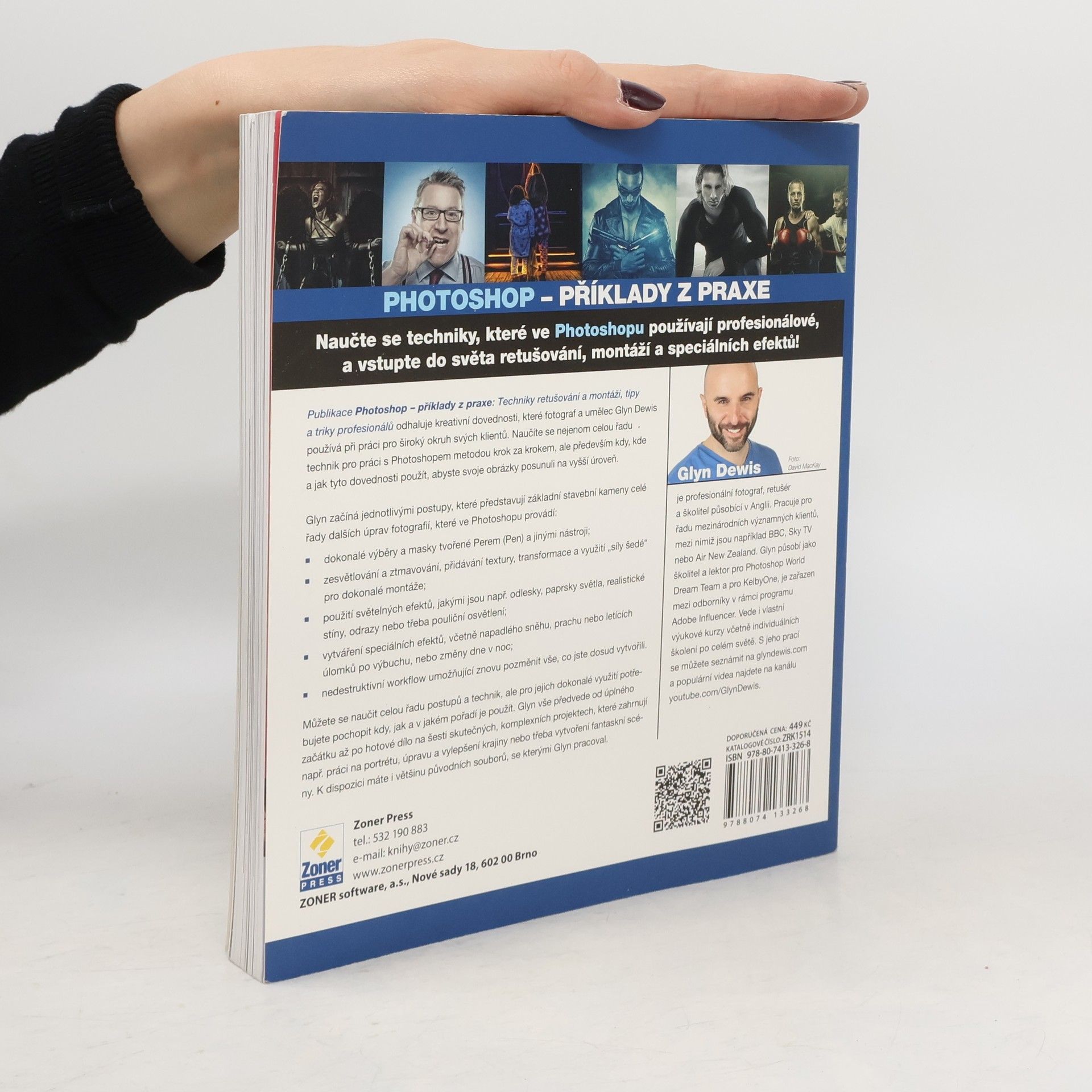 Neučte se Photoshop, naučte se s ním pracovat. Photoshop není nástroj pro fotografy, ale pro grafiky, pokročilé retuše a montáže, které vytvářejí novou realitu. Glyn Dewis, profesionální fotograf a školitel, provede čtenáře krok za krokem různými postupy a technikami, které transformují snímky na působivá díla. První část knihy se zaměřuje na základní techniky, jako jsou výběry pomocí různých nástrojů a práce s vlastními štětci. Ukázky jsou prakticky využitelné pro tvorbu odlesků, vinětací, přidávání textur a barevné sladění snímků pro montáže. Autor zdůrazňuje nedestruktivní pracovní postupy, které umožňují kdykoli měnit nastavení filtrů a úprav. Zahrnuje práci s inteligentními objekty, využívání filtru Camera Raw a další pokročilé techniky, které se opírají o práci na vrstvách a jejich prolínání. Druhá část knihy obsahuje komplexní projekty, kde autor podrobně provede čtenáře od základních snímků až po finální dílo, čímž ukazuje, jak efektivně využít Photoshop pro kreativní práci.