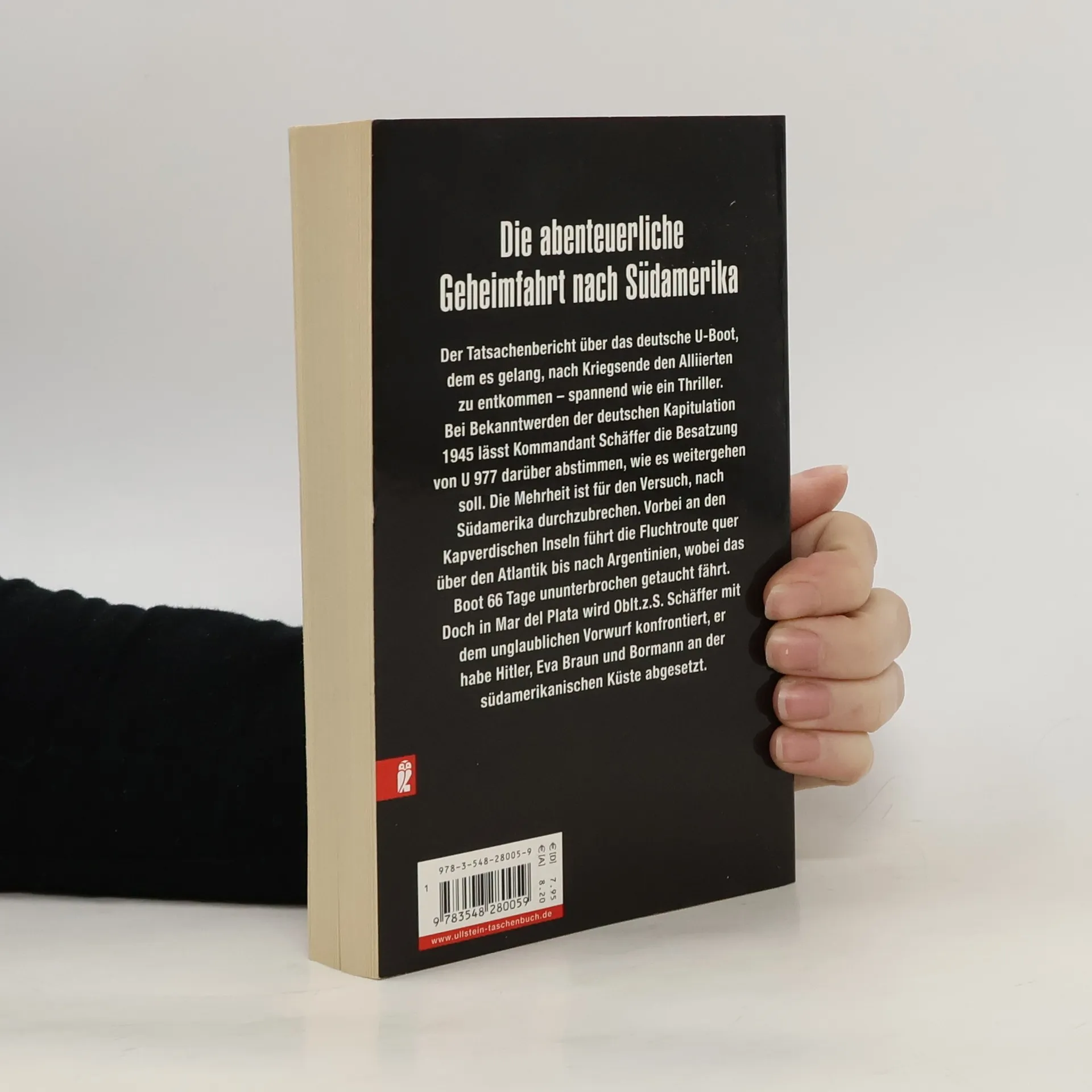 Der Tatsachenbericht über das deutsche U-Boot, dem es gelang, nach dem Kriegsende den Alliierten zu entkommen – spannend wie ein Thriller. Bei Bekanntwerden der deutschen Kapitulation 1945 lässt Kommandant Schäffer die Besatzung von U 977 darüber abstimmen, wie es weitergehen soll. Die Mehrheit ist für den Versuch, nach Südamerika durchzubrechen. Vorbei an den Kapverdischen Inseln führt die Fluchtroute quer über den Atlantik bis nach Argentinien, wobei das Boot 66 Tage ununterbrochen getaucht fährt. Doch in Mar del Plata wird Oblt. z. S. Schäffer mit dem unglaublichen Vorwurf konfrontiert, er habe Hitler, Eva Braun und Bormann an der südamerikanischen Küste abgesetzt.