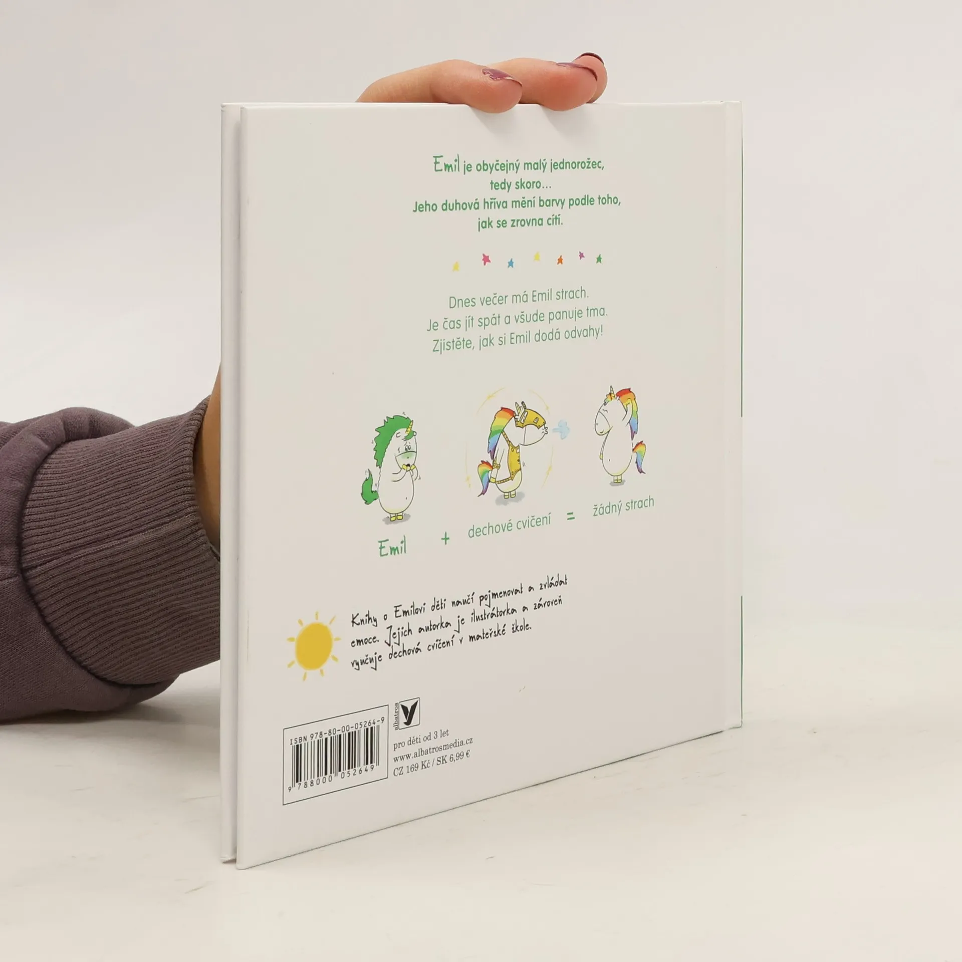 Emil vám pomůže zahnat strach! Emil je malý jednorožec jako každý jiný, tedy skoro… Jeho duhová hříva mění barvy podle toho, jak se zrovna cítí. Tentokrát se Emil bojí. Jestlipak víš, co mu pomůže zahnat strach? Otevři tuhle knížku a dozvíš se to!