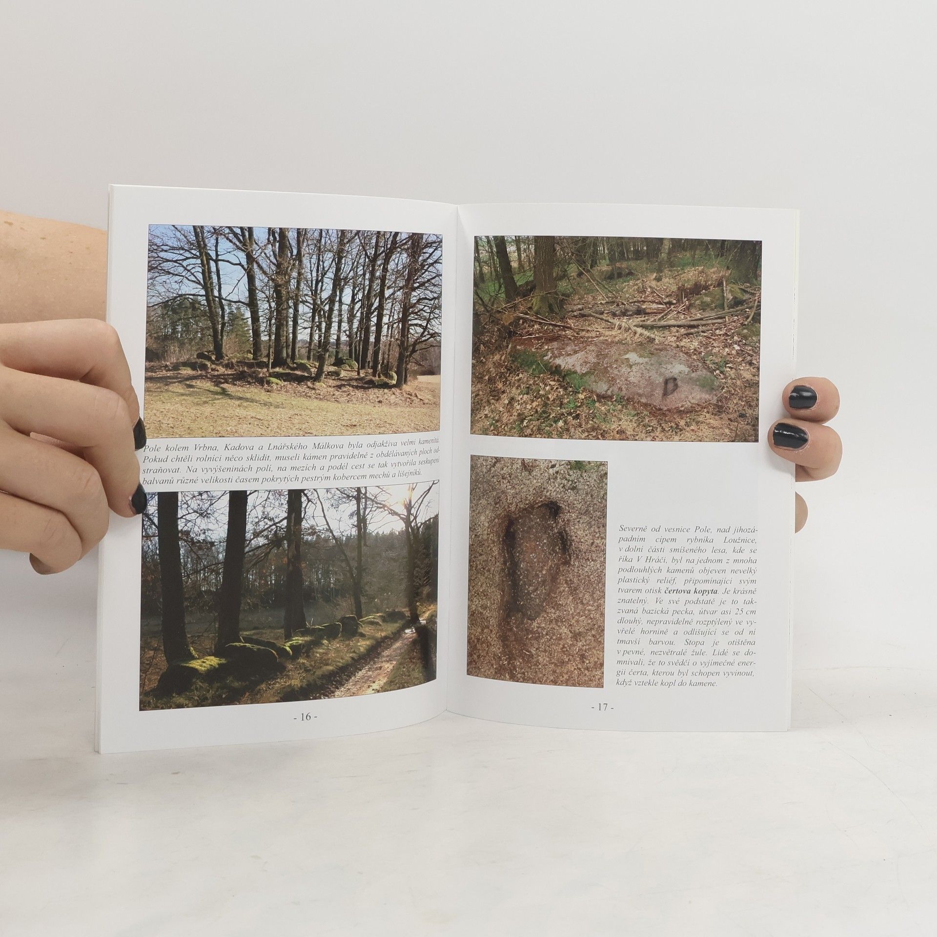 Publikace Čertovy kameny na Blatensku od historika Mgr. Jiřího Sekery a fotografa Ing. Jana Kurze představuje fascinující geologické útvary obklopené lidovými pověstmi. Druhé vydání, oproti černobílému prvku z roku 1996, nabízí 52 stran a popisuje 23 kamenných útvarů, každý ilustrovaný 1-3 barevnými fotografiemi. Obsahuje také konfrontační snímky J.P. Hilleho z přelomu 19. a 20. století a kresby od Mgr. Jána Olejníka a dalších autorů. Publikace je doplněna přehlednou mapou zajímavých kamenných kuriozit v oblastech Třemšínsko, Březnicko, Sedlicko a Chanovicko, což ji řadí do kategorie "poloprůvodce". Text je tematicky rozdělen do tří částí: první se zaměřuje na pověsti spojené s přírodními útvary s tajuplnými názvy, kde hlavní postavou je čert. Druhá část se věnuje lokálním objektům, které připomínají zkamenělé krávy, lidské obličeje a další podivuhodnosti. Třetí část se zabývá obětními kameny a kameny spojenými s konkrétními postavami, jako jsou Panna Marie, sv. Vojtěch a Jan Žižka. Nechybí ani chráněný přírodní výtvor - Kadovský viklan.