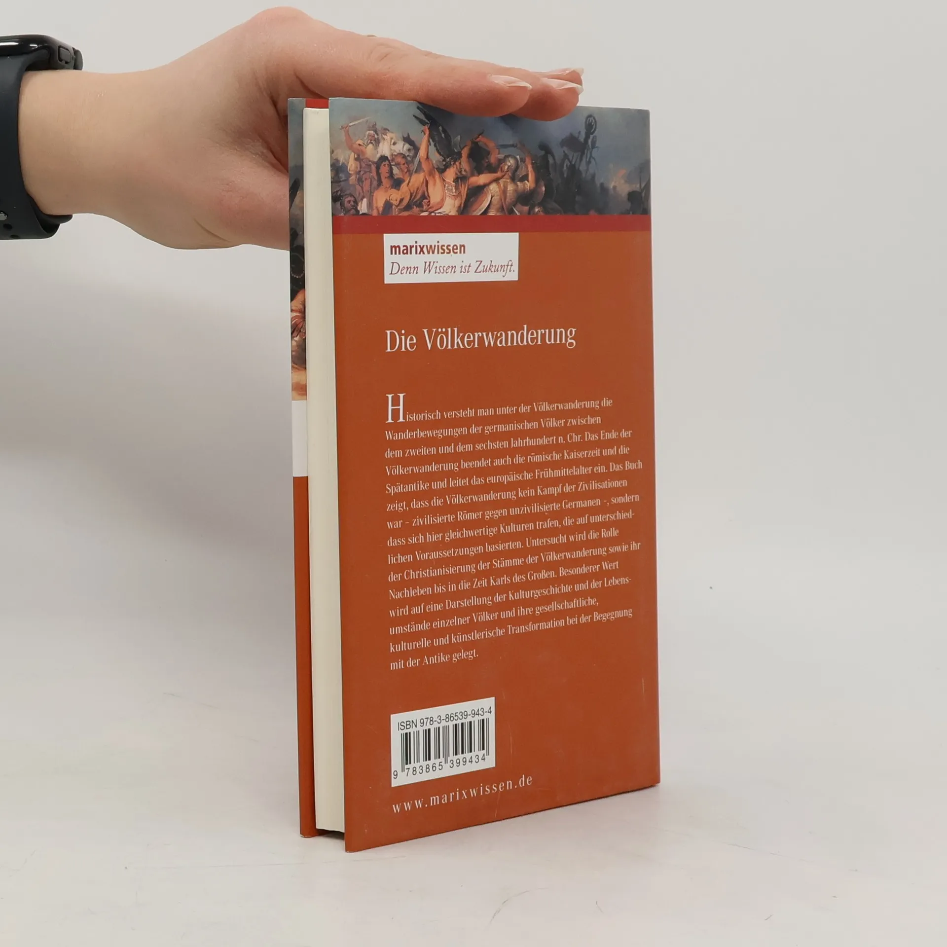 Historisch versteht man unter der Völkerwanderung die Wanderbewegungen der germanischen Völker zwischen dem zweiten und dem sechsten Jahrhundert n. Chr. Als Völkerwanderungszeit im engeren Sinne wird der Zeitraum von 375 bis 568, vom Einbruch der Hunnen nach Ostmitteleuropa bis zum Einfall der Langobarden in Norditalien, bezeichnet. Das Ende der Völkerwanderung beendet auch die römische Kaiserzeit und die Spätantike und leitet das europäische Frühmittelalter ein. Das Buch zeigt, dass die Völkerwanderung kein Kampf der Zivilisationenwar – zivilisierte Römer gegen unzivilisierte Germanen –, sondern dass sich hier gleichwertige Kulturen trafen, die auf unterschiedlichen Voraussetzungen basierten. Die neu eingewanderten Stämme und Völker nahmen rasch römische Sitten und Bräuche bis hin zu Verwaltung und Steuerwesen an und schufen in dieser Synthese bleibende Kulturdenkmäler. Untersucht wird die Rolle der Christianisierung der Stämme der Völkerwanderung sowie ihr Nachleben bis in die Zeit Karls des Großen. Besonderer Wert wird auf eine Darstellung der Kulturgeschichte und der Lebensumstände einzelner Völker und ihre gesellschaftliche, kulturelle und künstlerische Transformation bei der Begegnung mit der Antike gelegt.