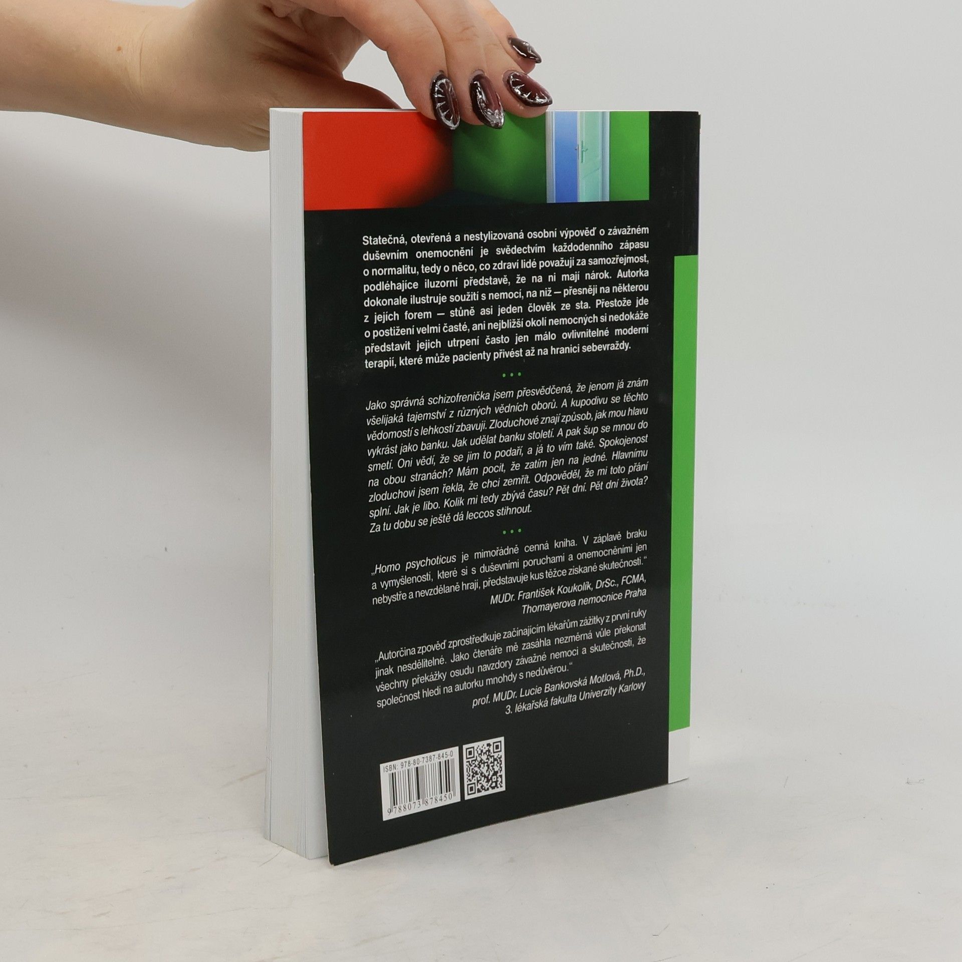 Statečná, otevřená a nestylizovaná osobní výpověď o závažném duševním onemocnění je svědectvím každodenního zápasu o normalitu, tedy o něco, co zdraví lidé považují za samozřejmost, podléhajíce iluzorní představě, že na ni mají nárok. Autorka dokonale ilustruje soužití s nemocí, na niž — přesněji na některou z jejích forem — stůně asi jeden člověk ze sta. Přestože jde o postižení velmi časté, ani nejbližší okolí nemocných si nedokáže představit jejich utrpení často jen málo ovlivnitelné moderní terapií, které může pacienty přivést až na hranici sebevraždy. „Homo psychoticus je mimořádně cenná kniha. V záplavě braku a vymyšleností, které si s duševními poruchami a onemocněními jen nebystře a nevzdělaně hrají, představuje kus těžce získané skutečnosti.“ MUDr. František Koukolík, DrSc., FCMA, Thomayerova nemocnice Praha