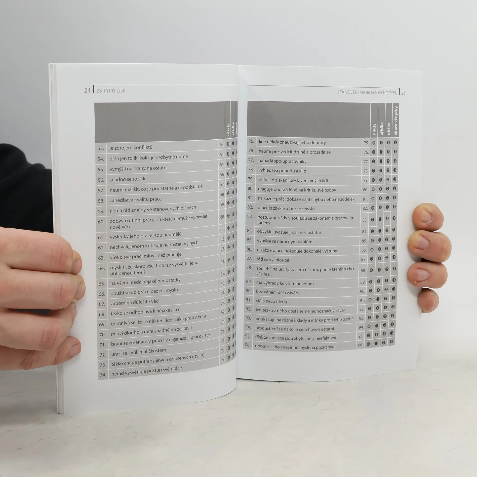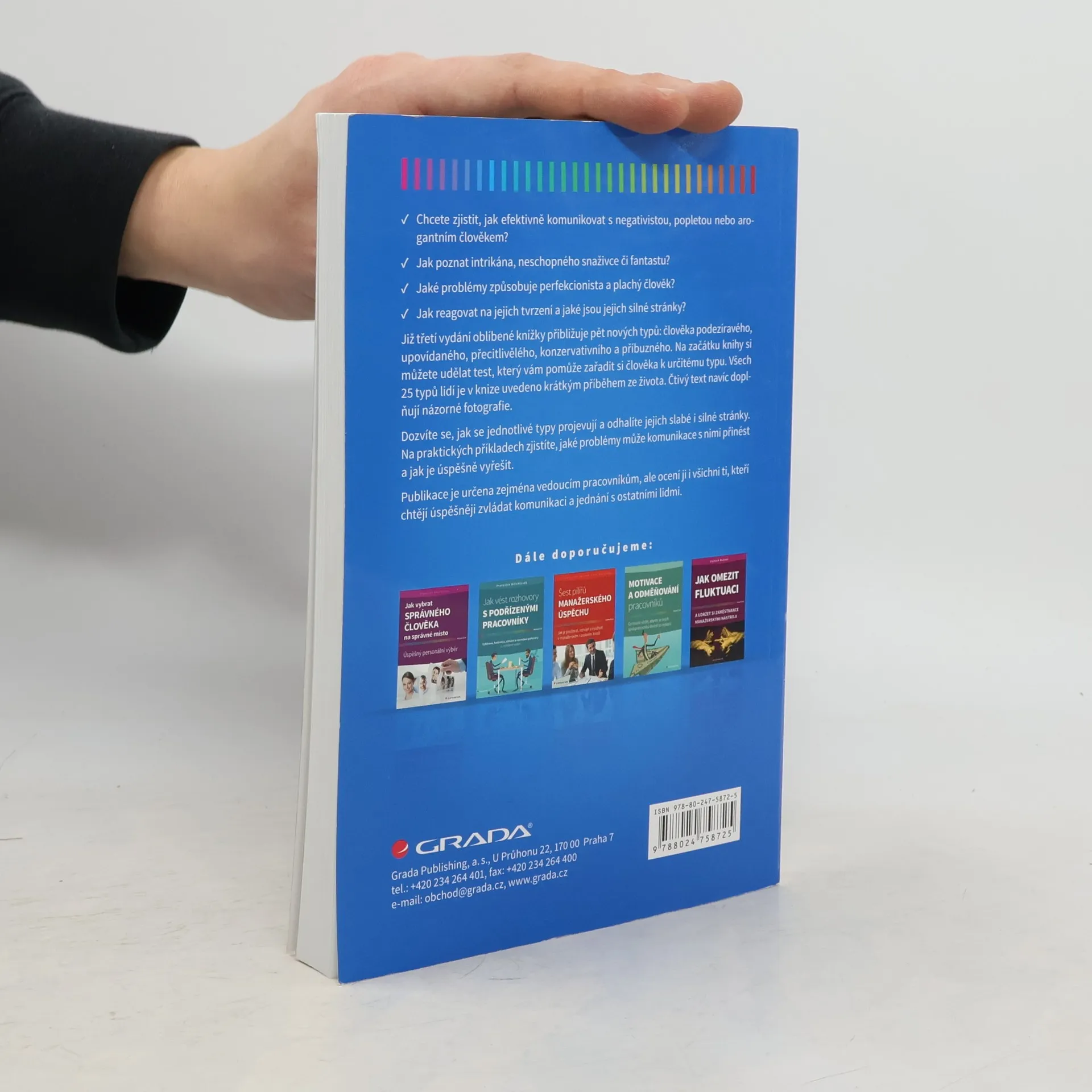 Jak efektivně komunikovat s negativistou, popletou nebo arogantním člověkem? Jak poznat intrikána, neschopného snaživce či fantastu? Jaké problémy způsobuje perfekcionista a plachý člověk? Jak reagovat na jejich tvrzení a jaké jsou jejich silné stránky? Publikace je určena zejména vedoucím pracovníkům, ale ocení ji všichni ti, kteří chtějí úspěšněji zvládat komunikaci a jednání s jinými lidmi. Již třetí vydání oblíbené knížky přibližuje pět nových typů: člověka podezíravého, upovídaného, přecitlivělého, konzervativního a příbuzného. Čtivý text doplňují fotografie zachycující jednotlivé typy.